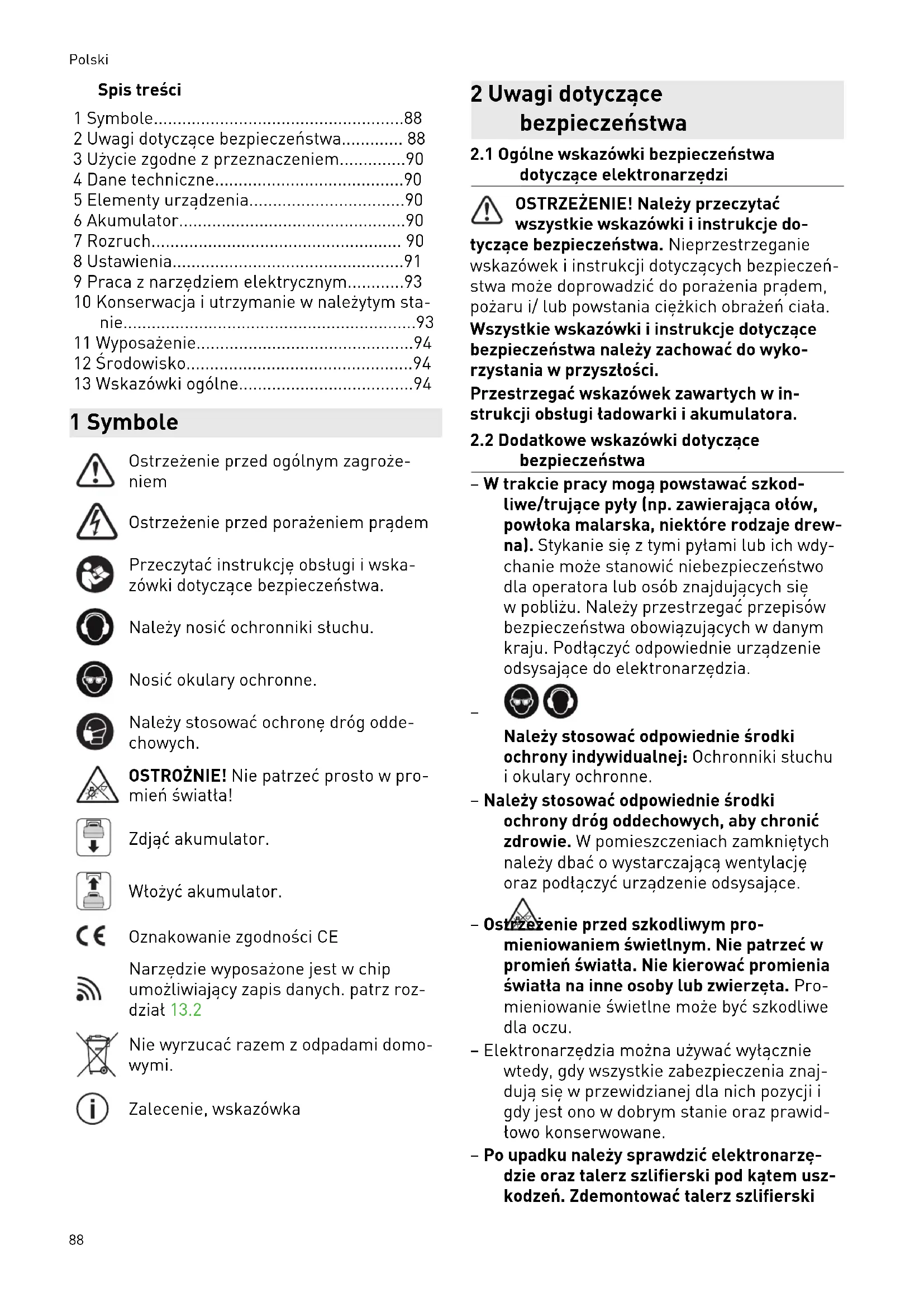 - 13 Wskazówki ogólne 1 Symbole Ostrzeżenie przed ogólnym zagroże niem Ostrzeżenie przed porażeniem prądem Przeczytać instrukcję obsługi iwska zówki dotyczące bezpieczeństwa. Należy nosić ochronniki słuchu. Nosić okulary ochronne. Należy stosować ochronę dróg odde chowych. OSTROŻNIE! Nie patrzeć prosto w pro mień światła! Zdjąć akumulator. Włożyć akumulator. Oznakowanie zgodności CE Narzędzie wyposażone jest w chip umożliwiający zapis danych. patrz roz dział13.2 Nie wyrzucać razem z odpadami domo wymi. Zalecenie, wskazówka 2 Uwagi dotyczące bezpieczeństwa p. 94