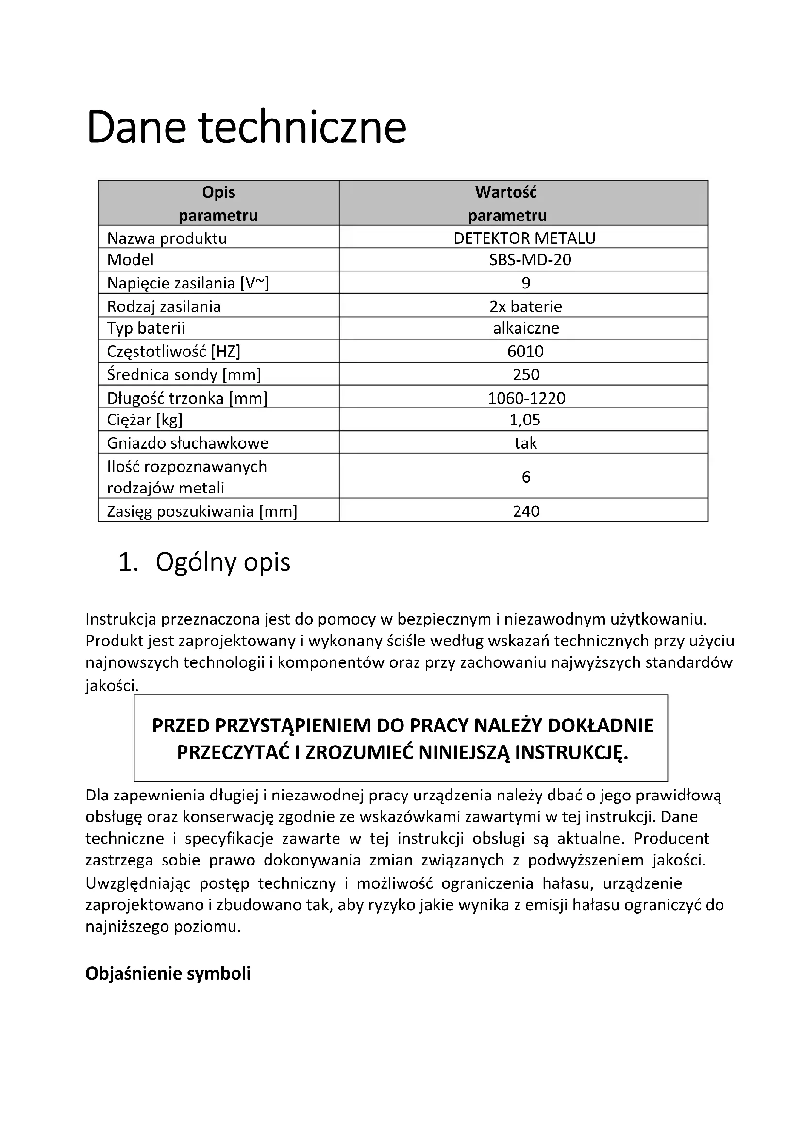 Termin „urządzenie” lub „produkt” w ostrzeżeniach i w opisie instrukcji odnosi się do <DETEKTORA METALI>. 2.1. Bezpieczeństwo w miejscu pracy a) W razie wątpliwości czy produkt działa poprawnie lub stwierdzenia uszkodzenia należy skontaktować się z serwisem producenta. b) Naprawy urządzenia może wykonać wyłącznie serwis producenta. Nie wolno dokonywać napraw samodzielnie!c) Wszystkie materiały opakowania (plastikowe torby, tektura, polistyren itp.) Należy przechowywać w miejscu niedostępnym dla dzieci, ponieważ stanowią one potencjalne źródło zagrożenia i należy je usunąć zgodnie z przepisami obowiązującymi w miejscu użytkowania urządzenia. 2.2. Bezpieczne stosowanie urządzenia a) Naprawa oraz konserwacja urządzeń powinna być wykonywana przez wykwalifikowane osoby przy użyciu wyłącznie oryginalnych części zamiennych. Zapewni to bezpieczeństwo użytkowania. b) Aby zapewnić zaprojektowaną integralność operacyjną urządzenia, nie należy usuwać zainstalowanych fabrycznie osłon lub odkręcać śrub. c) Zachować instrukcję użytkowania w celu jej późniejszego użycia. W razie, gdyby urządzenie miało zostać przekazane osobom trzecim, to wraz z nim należy przekazać również instrukcję użytkowania. d) Urządzenie nie jest zabawką. Dzieci powinny być pilnowane, aby nie bawiły się urządzeniem. e) Zabrania się ingerowania w konstrukcję urządzenia celem zmiany jego parametrów lub budowy. f) Trzymać urządzenia z dala od źródeł ognia i ciepła. g) Baterii, które nie nadają się do ponownego naładowania, nie należy ładować. h) Nie należy mieszać różnych typów baterii, a także starych z używanymi.