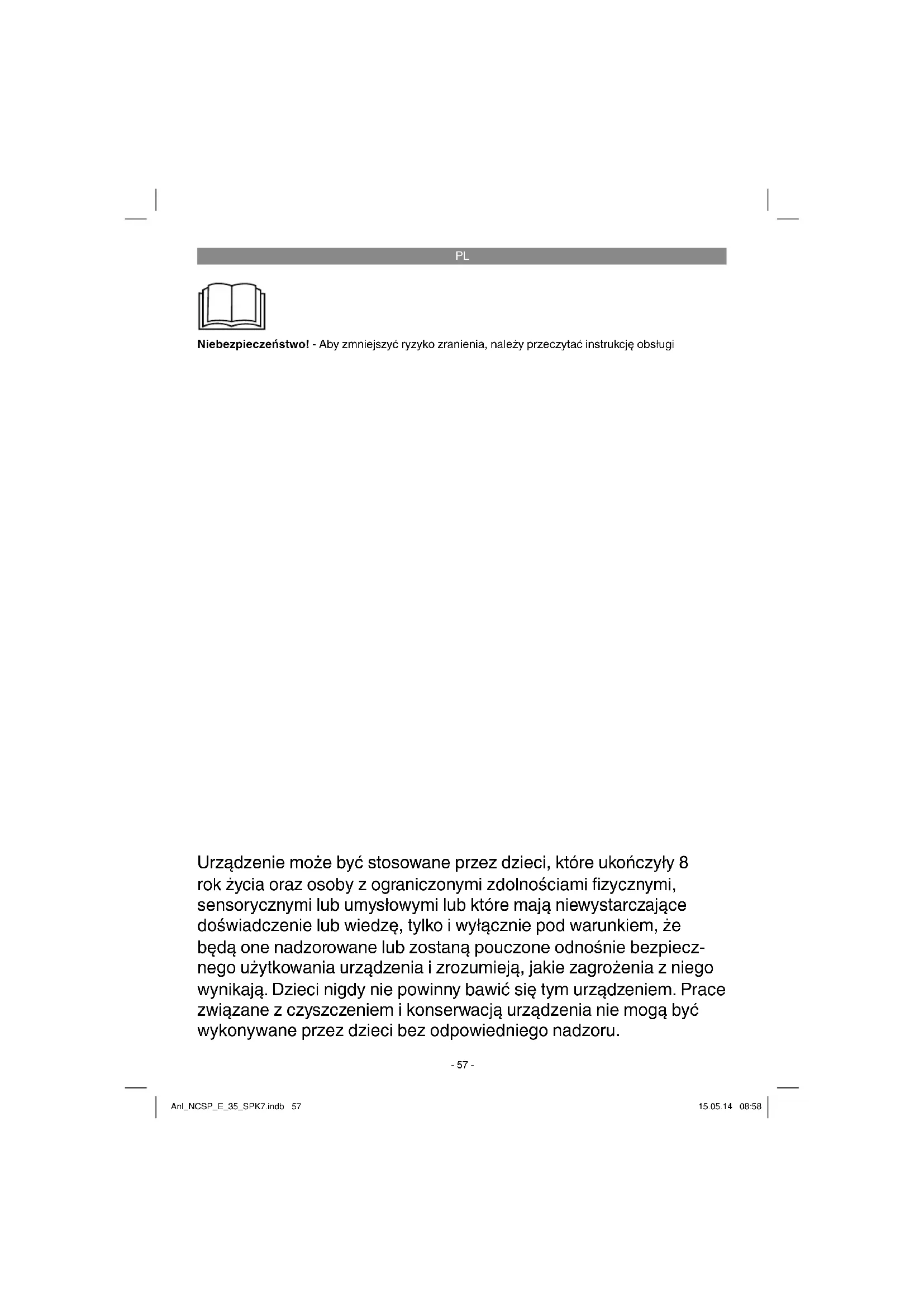Niebezpieczeństwo! - Aby zmniejszyć ryzyko zranienia, należy przeczytać instrukcję obsługi Urządzenie może być stosowane przez dzieci, które ukończyły 8 rok życia oraz osoby z ograniczonymi zdolnościami fi zycznymi, sensorycznymi lub umysłowymi lub które mają niewystarczające doświadczenie lub wiedzę, tylko i wyłącznie pod warunkiem, że będą one nadzorowane lub zostaną pouczone odnośnie bezpiecz- nego użytkowania urządzenia i zrozumieją, jakie zagrożenia z niego wynikają. Dzieci nigdy nie powinny bawić się tym urządzeniem. Prace związane z czyszczeniem i konserwacją urządzenia nie mogą być wykonywane przez dzieci bez odpowiedniego nadzoru. Anl_NCSP_E_35_SPK7.indb 57Anl_NCSP_E_35_SPK7.indb 57 15.05.14 08:5815.05.14 08:58PL