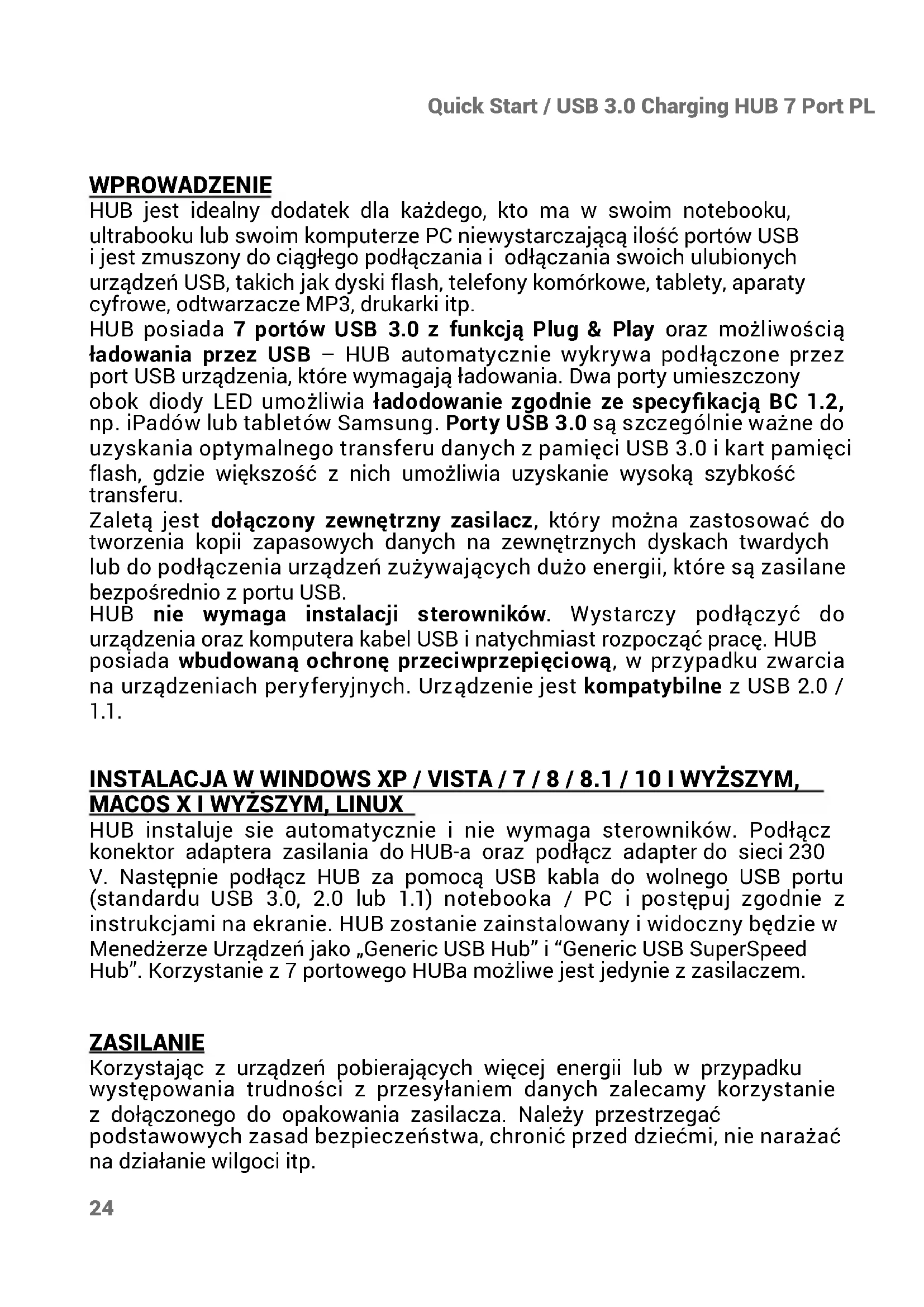 (standardu USB 3.0, 2.0 lub 1.1) notebooka / PC i postępuj zgodnie z instrukcjami na ekranie. HUB zostanie zainstalowany i widoczny będzie w Menedżerze Urządzeń jako „Generic USB Hub” i “Generic USB SuperSpeed Hub”. Korzystanie z 7 portowego HUBa możliwe jest jedynie z zasilaczem. ZASILANIE Korzystając z urządzeń pobierających więcej energii lub w przypadku występowania trudności z przesyłaniem danych zalecamy korzystanie z dołączonego do opakowania zasilacza. Należy przestrzegać podstawowych zasad bezpieczeństwa, chronić przed dziećmi, nie narażać na działanie wilgoci itp.25 Quick Start / USB 3.0 Charging HUB 7 Port PL ŁADOWANIE HUB umożliwia ładowanie podłączonych przez USB urządzeń mobilnych takich jak smartfony (w tym iPhone i telefony Samsung), czytniki e-book, urządzeń multimedialnych, nawigacji GPS oraz tabletów (np. Asus, Toshiba, GoClever, Prestigio, Emgeton, Sencor). Do podłączenia urządzeń oraz ładowania przez port USB należy stosować oryginalny kabel dołączony wraz z HUB-em. Jednocześnie jest konieczność podłączenia adaptera zasilającego do HUB-a. Ładowanie iPadów lub tabletów Samsung umożliwia jednynie porty USB znadjujący się obok diody LED. WYMAGANIA SYSTEMOWE Wymagania sprzętowe Notebook / PC z wolnym USB portem System operacyjny Windows XP, Windows Vista, Windows 7 32/64bit, Windows 8 32/64bit, Windows 8.1 32/64bit, Windows 10 32/64bit, Mac OS X 10.x lub wyższy, Linux SPECYFIKACJA