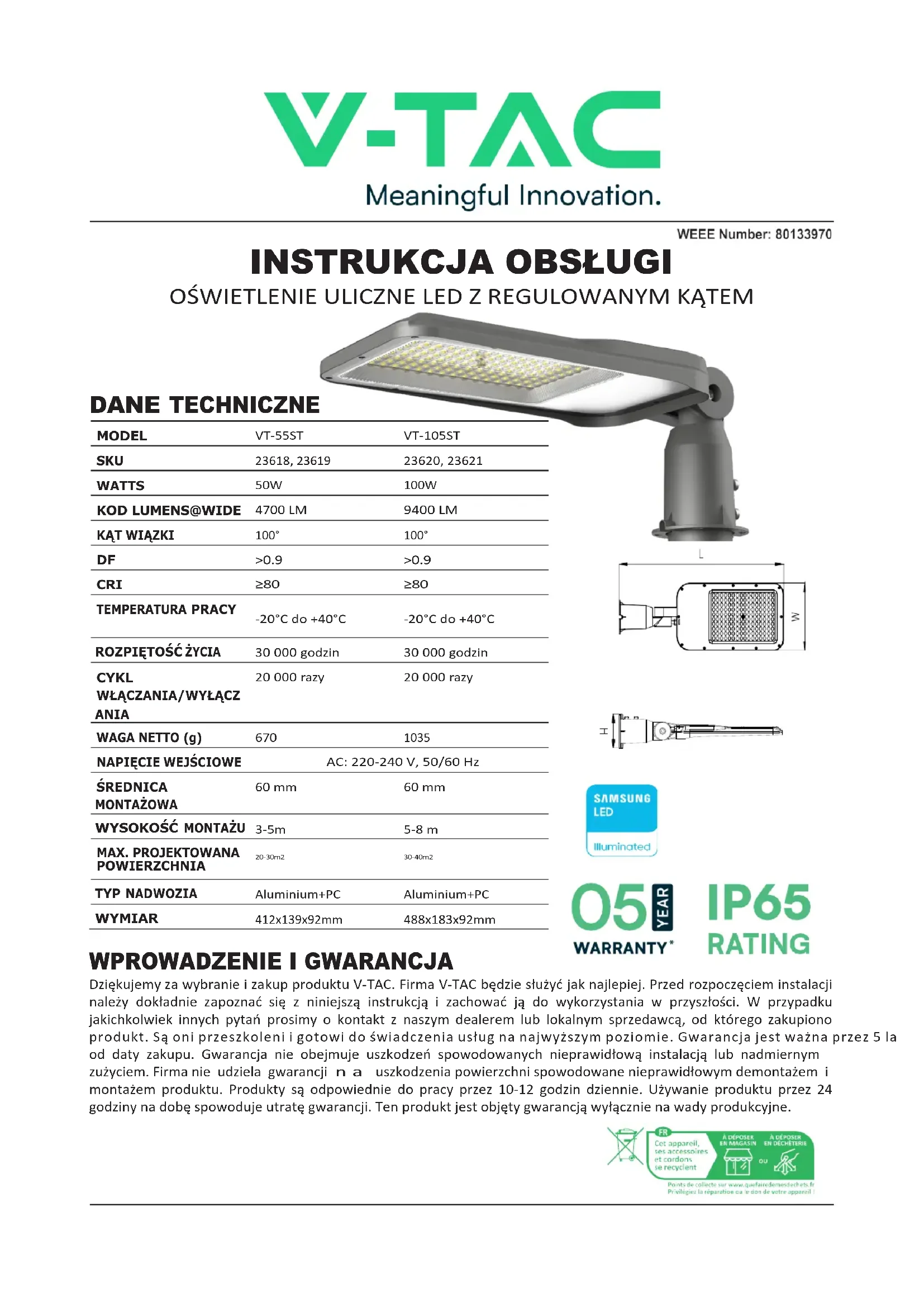 Dziękujemy za wybranie i zakup produktu V-TAC. Firma V-TAC będzie służyć jak najlepiej. Przed rozpoczęciem instalacji należy dokładnie zapoznać się z niniejszą instrukcją i zachować ją do wykorzystania w przyszłości. W przypadku jakichkolwiek innych pytań prosimy o kontakt z naszym dealerem lub lokalnym sprzedawcą, od którego zakupiono produkt. Są oni przeszkoleni i gotowi do świadczenia usług na najwyższym poziomie. Gwarancja jest ważna przez 5 lat od daty zakupu. Gwarancja nie obejmuje uszkodzeń spowodowanych nieprawidłową instalacją lub nadmiernym zużyciem. Firma nie udziela gwarancji