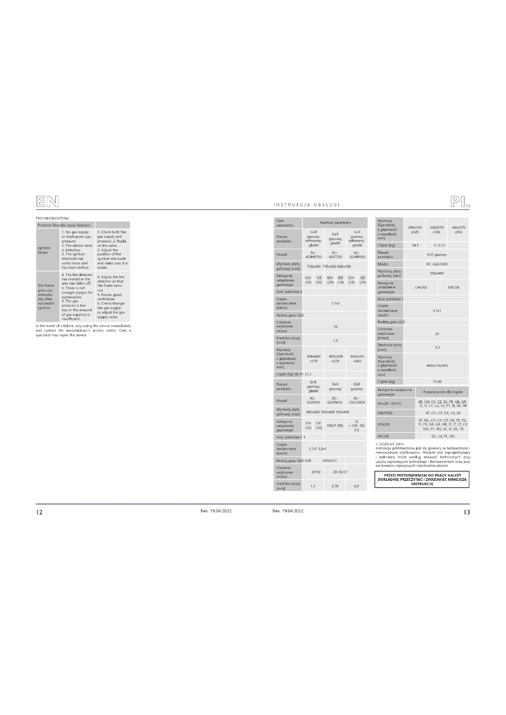 Rev. 19.04.2022 Opis parametru Wartość parametru Nazwa produktu Grill gazowy, ryowany- gładki Grill gazowy, gładki Grill gazowy, ryowany- gładki Model RC- GGHR750 RC- GGF750 RC- GGHR600 Wymiary płyty grillowej [mm] 745x400 745x400 600x400 Kategoria urządzenia gazowego I2H (20) I2E (20) I2H (20) I2E (20) I2H (20) I2E (20) Ilość palników 2 Ciepło dostarczane (kW/h) 3,1x2 Rodzaj gazu G20 Ciśnienie wejściowe (mbar)