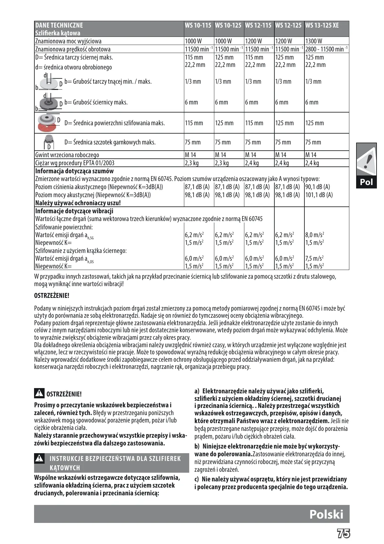 Niepewność K= 1,5 m/s 1,5 m/s 1,5 m/s 1,5 m/s 1,5 m/s2 Szlifowanie z użyciem krążka ściernego: 6,0 m/s2 6,0 m/s2 6,0 m/s2 6,0 m/s2 7,5 m/s2 Wartość emisji drgań ah,DS Niepewność K= 1,5 m/s2 1,5 m/s2 1,5 m/s2 1,5 m/s2 1,5 m/s2 W przypadku innych zastosowań, takich jak na przykład przecinanie ściernicą lub szlifowanie za pomocą szczotki z drutu stalowego, mogą wyniknąć inne wartości wibracji! Pol OSTRZEŻENIE! Podany w niniejszych instrukcjach poziom drgań został zmierzony za pomocą metody pomiarowej zgodnej z normą EN 60745 i może być użyty do porównania ze sobą elektronarzędzi. Nadaje się on również do tymczasowej oceny obciążenia wibracyjnego. Podany poziom drgań reprezentuje główne zastosowania elektronarzędzia. Jeśli jednakże elektronarzędzie użyte zostanie do innych celów z innym narzędziami roboczymi lub nie jest dostatecznie konserwowane, wtedy poziom drgań może wykazywać odchylenia. Może to wyraźnie zwiększyć obciążenie wibracjami przez cały okres pracy. Dla dokładnego określenia obciążenia wibracjami należy uwzględnić również czasy, w których urządzenie jest wyłączone względnie jest włączone, lecz w rzeczywistości nie pracuje. Może to spowodować wyraźną redukcję obciążenia wibracyjnego w całym okresie pracy. Należy wprowadzić dodatkowe środki zapobiegawcze celem ochrony obsługującego przed oddziaływaniem drgań, jak na przykład: konserwacja narzędzi roboczych i elektronarzędzi, nagrzanie rąk, organizacja przebiegu pracy. OSTRZEŻENIE! Prosimy o przeczytanie wskazówek bezpieczeństwa i zaleceń, również tych. Błędy w przestrzeganiu poniższych wskazówek mogą spowodować porażenie prądem, pożar i/lub ciężkie obrażenia ciała. Należy starannie przechowywać wszystkie przepisy i wskazówki bezpieczeństwa dla dalszego zastosowania.