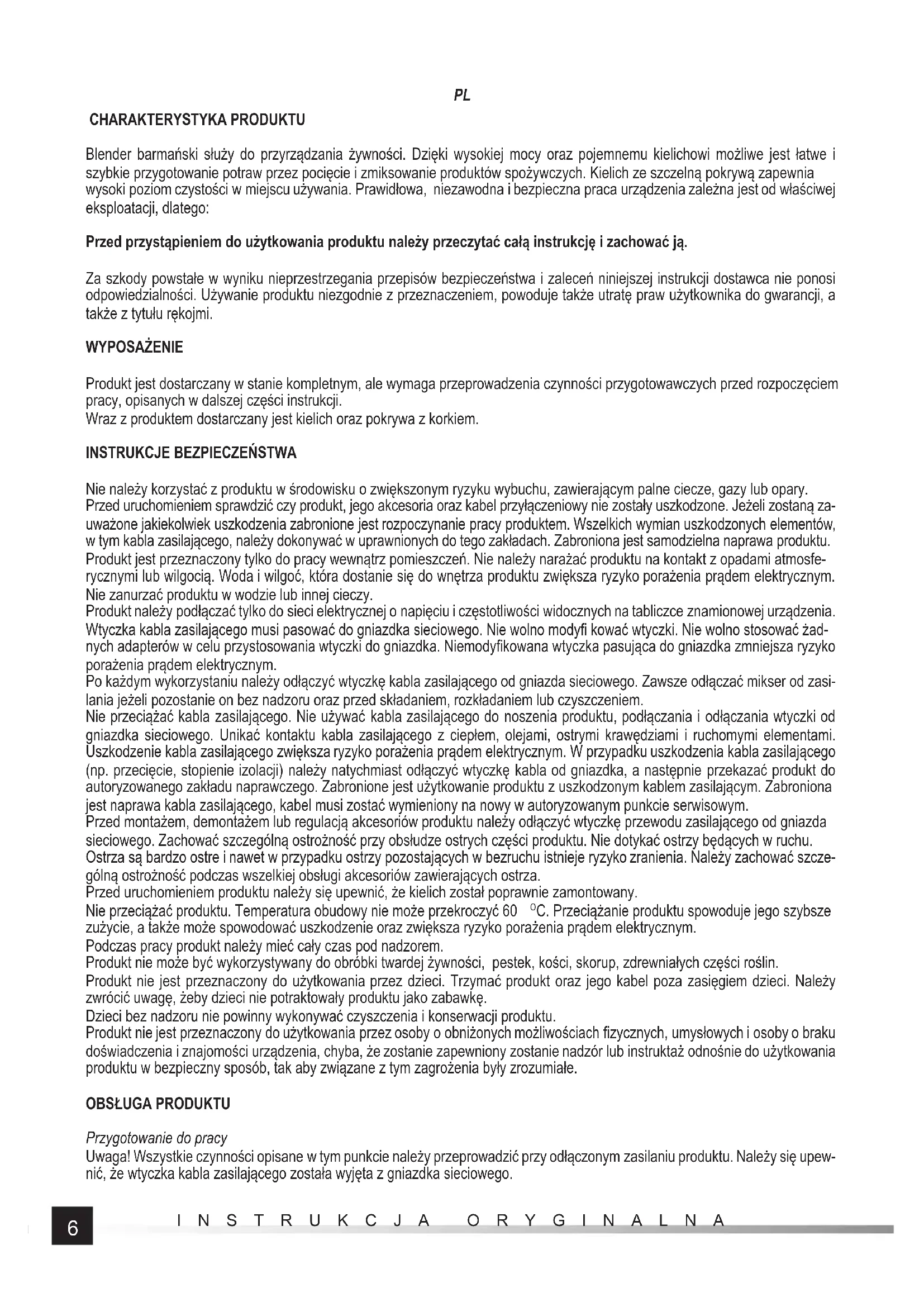 Produkt należy rozpakować, całkowicie usuwając wszystkie elementy opakowania. Zaleca się zachować opakowanie, może być pomocne przy późniejszym transporcie i magazynowaniu produktu. Sprawdzić produkt pod kątem uszkodzeń. W przypadku stwierdzenia jakichkolwiek uszkodzeń nie należy używać produktu przed usunięciem uszkodzeń lub wymianą uszkodzonych elementów na nowe, wolne od uszkodzeń. Produkt umyć zgodnie ze wskazówkami z punktu „Konserwacja produktu”. Podstawę napędu ustawić na równym, płaskim, twardym i stabilnym podłożu. Wszystkie podstawki obudowy napędu powinny mieć kontakt z podłożem. Zamontować kielich przez postawienie go na obudowie napędu blendera (II). Wszystkie wypustki na górnej powierzchni obudowy muszą trafi ć w prowadnice w podstawie kielicha. Kielich musi stać równo na obudowie kielicha. Tylko wtedy zostanie zapewnione właściwe połączenie napędu ostrza zamontowanego w podstawie kielicha. Kielich został wyposażony w pokrywę z uszczelką, pokrywę należy zamontować wciskając ją w otwór kielicha (III). Użycie pokrywy kielicha zwiększa bezpieczeństwo użycia produktu, a także zapobiega rozchlapywaniu żywności podczas jej przygotowywania w blenderze. Pokrywa została wyposażona w dodatkowy korek, który umożliwia dołożenie produktów żywnościowych do kielicha bez demonta- żu pokrywy. Korek należy zamontować w pokrywie tak aby wypustki w korku trafi ły w wycięcia w otworze pokrywy (IV). Obsługa produktu Kielich zaleca się napełniać żywnością wtedy, gdy jest zdemontowany z obudowy napędu. Takie działanie zapobiegnie ewentual- nemu zanieczyszczeniu żywnością obudowy napędu podczas napełniania kielicha. Kielicha nie należy napełniać powyżej znacznika maksymalnej pojemności. Należy wziąć pod uwagę, ze podczas mieszania poziom cieczy w kielichu się uniesie. Po napełnieniu kielich należy zakryć pokrywą z zamontowanym korkiem. Kielich ustawić na obudowie napędu. Upewnić się, że włącznik produktu znajduje się w pozycji: wyłączony – O, następnie podłączyć wtyczkę kabla zasilającego do gniazdka. Produkt uruchomić zmieniając pozycję włącznika na: 1, 2 lub P. Pozycje włącznika opisane 1 oraz 2 uruchamiają blender i pozwalają pracować na jednej z dwóch prędkości: 1 – wolniejsza, 2 – szybsza. Pozycja P pozwala na uruchomienie maksymalnej prędkości pracy tak długo, jak pokrętło włącznika będzie przytrzy- mywane w tej pozycji. Po zwolnieniu pokrętła, wróci ono samoczynnie do pozycji wyłączony – O. Zatrzymanie pracy następuje po zmianie pozycji włącznika na wyłączony – O. Przed zdjęciem kielicha należy poczekać do całkowitego zatrzymania ostrzy, następnie odłączyć wtyczkę kabla zasilającego od gniazdka i dopiero zdjąć kielich z obudowy napędu. Na początku zaleca się użyć niższych obrotów i ewentualnie je zwiększyć w trakcie pracy, aż do osiągnięcia zadowalających efektów. Produkt jest przeznaczony do ciągłej pracy nie dłuższej niż 2 minuty. Następnie należy odczekać do całkowitego ostygnięcia produktu. UWAGA! Jeżeli po włączeniu urządzenia wpadnie ono w wibracje, będzie wydawało nietypowy dźwięk lub będą widoczne inne objawy nieprawidłowej pracy, należy natychmiast je wyłączyć, odłączyć od zasilania i sprawdzić przyczynę nieprawidłowego działania. Konserwacja produktu UWAGA! Przed każdym czyszczeniem należy wyłączyć produkt, odłączyć wtyczkę kabla zasilającego od gniazdka, odczekać do jego ostudzenia i dopiero wtedy przystąpić do konserwacji. UWAGA! Zaleca się oczyszczać wnętrze kielicha bezpośrednio po zakończeniu pracy. Zapobiegnie to zasychaniu resztek żyw- ności i ułatwi oczyszczanie produktu. Jeżeli w trakcie pracy dojdzie do zabrudzenia obudowy napędu przetwarzaną żywnością, należy przerwać pracę, odłączyć produkt od zasilania, wyciągając wtyczkę kabla zasilającego z gniazdka sieciowego, oczyścić produkt i dopiero po tym wznowić pracę. Do czyszczenia produktu stosować tylko łagodne środki przeznaczone do czyszczenia naczyń kuchennych. Zabronione jest stosowanie środków czyszczących ściernych np. proszek lub mleczko czyszczące oraz środków zawierających substancje żrące. Nie stosować do czyszczenia rozpuszczalników benzyn lub alkoholi. Środek czyszczący należy rozcieńczyć wodą zgodnie z informacjami do niego dołączonymi, następnie nanieść na miękką tkaninę i oczyścić obudowę napędu z zewnątrz. Pozostałości środka czyszczącego usunąć miękką tkaniną lekko nasączoną czystą wodą. Następnie osuszyć wszystkie po- wierzchnie za pomocą suchej miękkiej tkaniny. UWAGA! Obudowa napędu nie jest przeznaczona do czyszczenia za pomocą strumienia wody. Nie należy też zanurzać obudowy napędu w wodzie. Przed pierwszym użyciem wnętrze kielicha wystarczy wypłukać napełniając go wodą z niewielką ilością detergentu, następnie opróżnić i powtórzyć operację napełniając tym razem kielich czystą wodą, aż do wypłukania pozostałości detergentu. Wnętrze kielicha oraz ostrza po każdej pracy należy oczyścić napełniając go wodą z domieszką detergentu. Następnie należy zakryć pokrywę z zamontowanym korkiem i uruchomić produkt na krótki czas. Następnie kielich opróżnić i powtórzyć operację tym razem używając czystej wody. Powtórzyć, aż do pozbycia się resztek deter- gentu. Następnie opróżnić kielich z wody i pozostawić do wyschnięcia.INSTRUKCJA ORYGINALNA