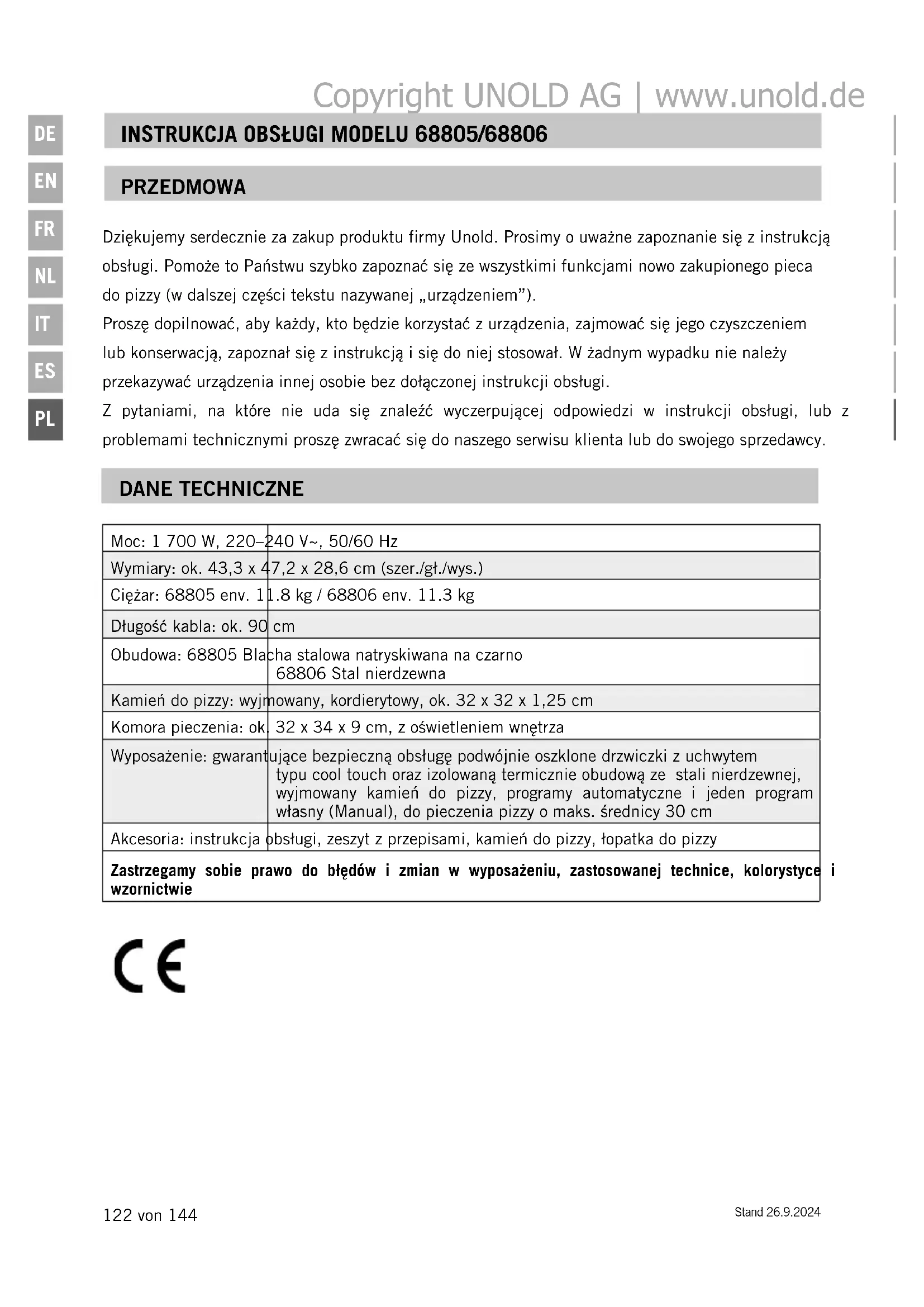 PRZEDMOWA Dziękujemy serdecznie za zakup produktu firmy Unold. Prosimy o uważne zapoznanie się z instrukcją obsługi. Pomoże to Państwu szybko zapoznać się ze wszystkimi funkcjami nowo zakupionego pieca do pizzy (w dalszej części tekstu nazywanej „urządzeniem”). Proszę dopilnować, aby każdy, kto będzie korzystać z urządzenia, zajmować się jego czyszczeniem lub konserwacją, zapoznał się z instrukcją i się do niej stosował. W żadnym wypadku nie należy przekazywać urządzenia innej osobie bez dołączonej instrukcji obsługi. Z pytaniami, na które nie uda się znaleźć wyczerpującej odpowiedzi w instrukcji obsługi, lub z problemami technicznymi proszę zwracać się do naszego serwisu klienta lub do swojego sprzedawcy. DANE TECHNICZNE Moc: 1 700 W, 220–240 V~, 50/60 Hz Wymiary: ok. 43,3 x 47,2 x 28,6 cm (szer./gł./wys.) Ciężar: 68805 env. 11.8 kg / 68806 env. 11.3 kg Długość kabla: ok. 90 cm Obudowa: 68805 Blacha stalowa natryskiwana na czarno 68806 Stal nierdzewna Kamień do pizzy: wyjmowany, kordierytowy, ok. 32 x 32 x 1,25 cm Komora pieczenia: ok. 32 x 34 x 9 cm, z oświetleniem wnętrza Wyposażenie: gwarantujące bezpieczną obsługę podwójnie oszklone drzwiczki z uchwytem typu cool touch oraz izolowaną termicznie obudową ze stali nierdzewnej, wyjmowany kamień do pizzy, programy automatyczne i jeden program własny (Manual), do pieczenia pizzy o maks. średnicy 30 cm Akcesoria: instrukcja obsługi, zeszyt z przepisami, kamień do pizzy, łopatka do pizzy Zastrzegamy sobie prawo do błędów i zmian w wyposażeniu, zastosowanej technice, kolorystyce i wzornictwie Copyright UNOLD AG | www.unold.deStand 26.9.2024 123 von 144