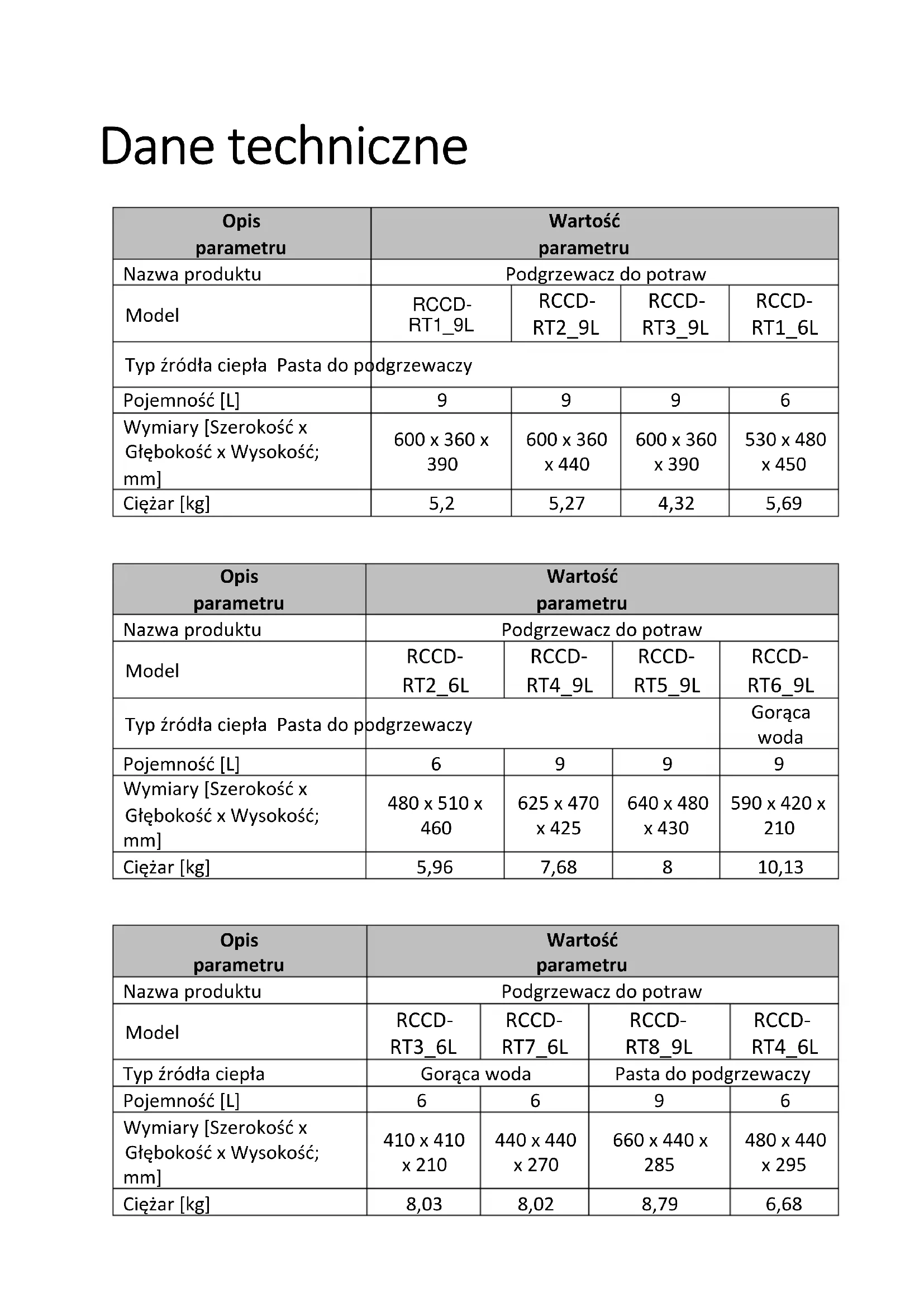 Opis parametru Wartość parametru Nazwa produktu Podgrzewacz do potraw Model RCCD- RT2_6L RCCD- RT4_9L RCCD- RT5_9L RCCD- RT6_9L Typ źródła ciepła Pasta do podgrzewaczy Gorąca woda Pojemność [L]