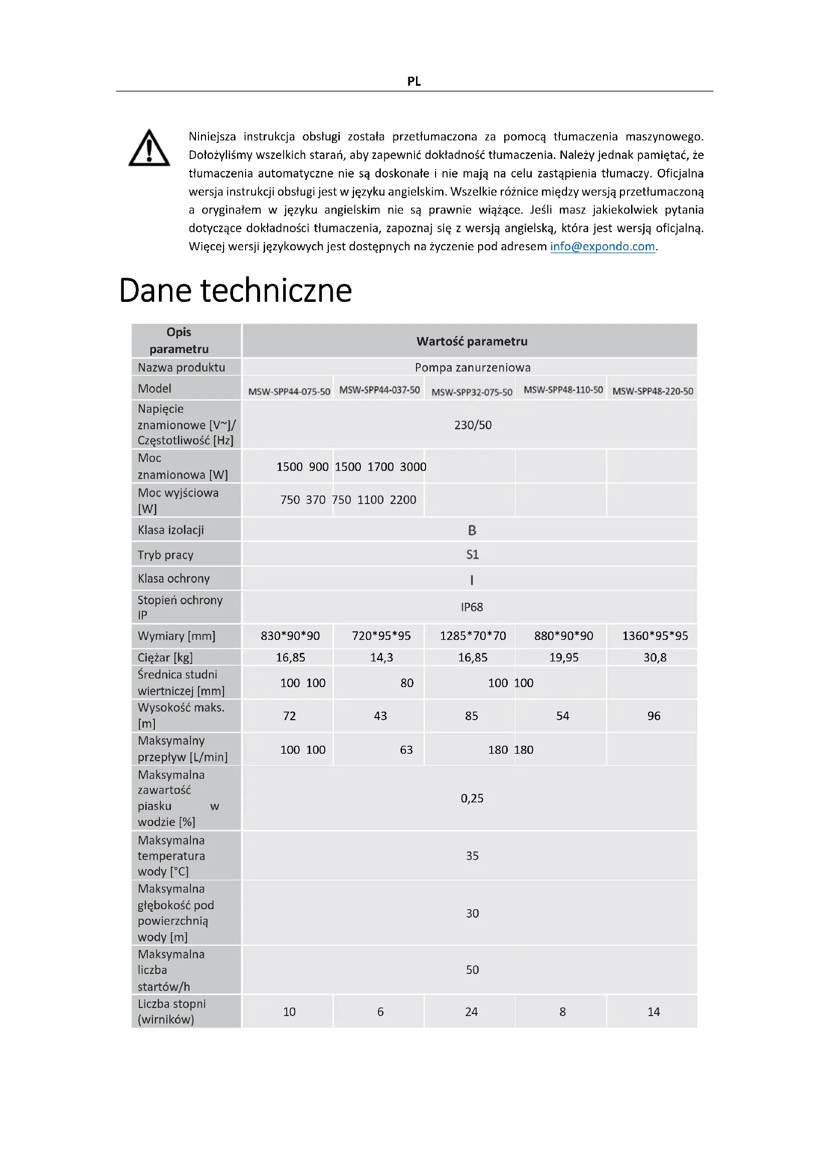 Aby włączyć pompę należy ustawić przełącznik on/off w pozycji Wł.PL Jeżeli wyłącznik nadprądowy zadziałał z powodu zwarcia, przegrzania itp., po rozwiązaniu problemu (przyczyny zadziałania wyłącznika nadprądowego) należy zwolnić wyłącznik, naciskając przycisk wyłącznika na obudowie panelu sterowania. Zdemontuj pompę W rejonach, w których temperatury spadają poniżej zera, pompę należy zdemontować na okres zimowy i przechowywać zgodnie z wytycznymi podanymi w części „transport i przechowywanie”. Aby zdemontować pompę: Ustaw przełącznik on/off w pozycji Wył. („0”). Odłącz pompę od źródła zasilania. Wyciągnij pompę ze studni wiertniczej za pomocą liny stalowej lub innej mocnej liny przymocowanej do uchwytów pompy. Odłącz rurę doprowadzającą wodę od pompy. Usuń resztki wody z pompy, odwracaj ąc ją do góry nogami. Po wyschnięciu pompa jest gotowa do bezpiecznego przechowywania. Transport i magazynowanie Podczas transportu należy unikać potrząsania, uderzania i obracania urządzenia do góry nogami. Przechowywać w odpowiednio wentylowanym miejscu, w suchym powietrzu, wolnym od gazów żrących. Przechowywać urządzenie w temperaturze otoczenia dodatniej, w pozycji poziomej. Jeżeli pompa była przechowywana przez okres dłuższy niż kilka dni, przed ponowną instalacją należy upewnić się, że urządzenie działa prawidłowo. Czyszczenie i konserwacja Zawsze odłączaj urządzenie od zasilania przed czyszczeniem. Do czyszczenia każdej powierzchni należy używać środka czyszczącego, który nie powoduje korozji. Po każdym użyciu wyczyść urządzenie z osadów organicznych za pomocą strumienia czystej wody i miękkiej ściereczki. Przechowywać urządzenie w suchym i chłodnym miejscu, chroniąc je przed wilgocią i bezpośrednim działaniem promieni słonecznych. Regularna kontrola urządzenia Sprawdzaj regularnie, czy urządzenie nie jest uszkodzone. W razie uszkodzenia prosimy natychmiast zaprzestać korzystania z urządzenia i skontaktować się z obsługą klienta w celu rozwiązania problemu. Co zrobić w razie wystąpienia problemu? Skontaktuj się z obsługą klienta i przygotuj następujące informacje: Numer faktury i numer seryjny (ten ostatni znajduje się na tabliczce znamionowej urz ądzenia).PL W razie konieczności zrób zdjęcie uszkodzonej, zepsutej lub wadliwej części. Twojemu pracownikowi obsługi klienta będzie łatwiej ustalić źródło problemu, jeśli podasz szczegółowy i precyzyjny opis problemu. Im bardziej szczegółowe będą Twoje informacje, tym lepsza obsługa klienta będzie mogła rozwiązać Twój problem szybciej i skuteczniej! UWAGA! Nigdy nie otwieraj urządzenia bez zgody działu obsługi klienta. Może to skutkować utratą gwarancji! Utylizacja zużytych urządzeń Nie wyrzucaj tego urządzenia do miejskich systemów utylizacji odpadów. Oddaj go do punktu zbiórki i recyklingu urządzeń elektrycznych i elektronicznych. Sprawdź symbol na produkcie, instrukcji obsługi i opakowaniu. Tworzywa sztuczne wykorzystane do budowy urządzenia można poddać recyklingowi zgodnie z ich oznaczeniami. Wybierając recykling, wnosisz znaczący wkład w ochronę naszego środowiska. Aby uzyskać informacje na temat najbliższego zakładu recyklingu, skontaktuj się z lokalnymi władzami. Rozwiązywanie problemów Problem Możliwy powód Rozwiązanie Urządzenie nie uruchamia się Zadziałał wyłącznik nadprądowy Usuń przyczynę zadziałania wyłącznika. Poczekaj, aż napęd ostygnie. Ustaw wyłącznik obwodu w jego pierwotnej pozycji. Brak zasilania Sprawdź, czy kabel zasilający jest podłączony prawidłowo. Uszkodzony silnik lub kabel zasilający Zadzwoń do swojego agenta lub wykwalifikowanego technika. Urządzenie uruchamia się, ale nie pompuje/pompuje tylko niewielką ilość wody Zatkany dopływ wody Usuń blokadę. Nieszczelne połączenia wodne Uszczelnij połączenia. Niewystarczający poziom wody w studni wiertniczej Sprawdź poziom wody. Pompa powinna znajdować się co najmniej 2 m pod powierzchnią wody. Zbyt wysoka wysokość podnoszenia wody Zainstaluj pompę zgodnie z jej specyfikacją techniczną.CZ Tato uživatelská příručka byla přeložena pomocí strojového překladu. Vynaložili jsme maximální úsilí, aby byl překlad přesný, ale uvědomte si, že automatické překlady nejsou dokonalé a nejsou určeny k tomu, aby nahradily lidské překladatele. Oficiální verze uživatelské příručky je v angličtině. Jakékoli rozdíly mezi přeloženou verzí a původní angličtinou nejsou právně závazné. Máte-li jakékoli dotazy ohledně přesnosti překladu, podívejte se prosím na anglickou verzi, která je oficiálním odkazem. Další jazykové verze jsou k dispozici na vyžádání na adrese info@expondo.com. Technické údaje Popis parametru Hodnota parametru Název výrobku PONORNÉ ČERPADLO Model Jmenovité napětí [V~]/ Frekvence [Hz] 230/50 Jmenovitý výkon[W]