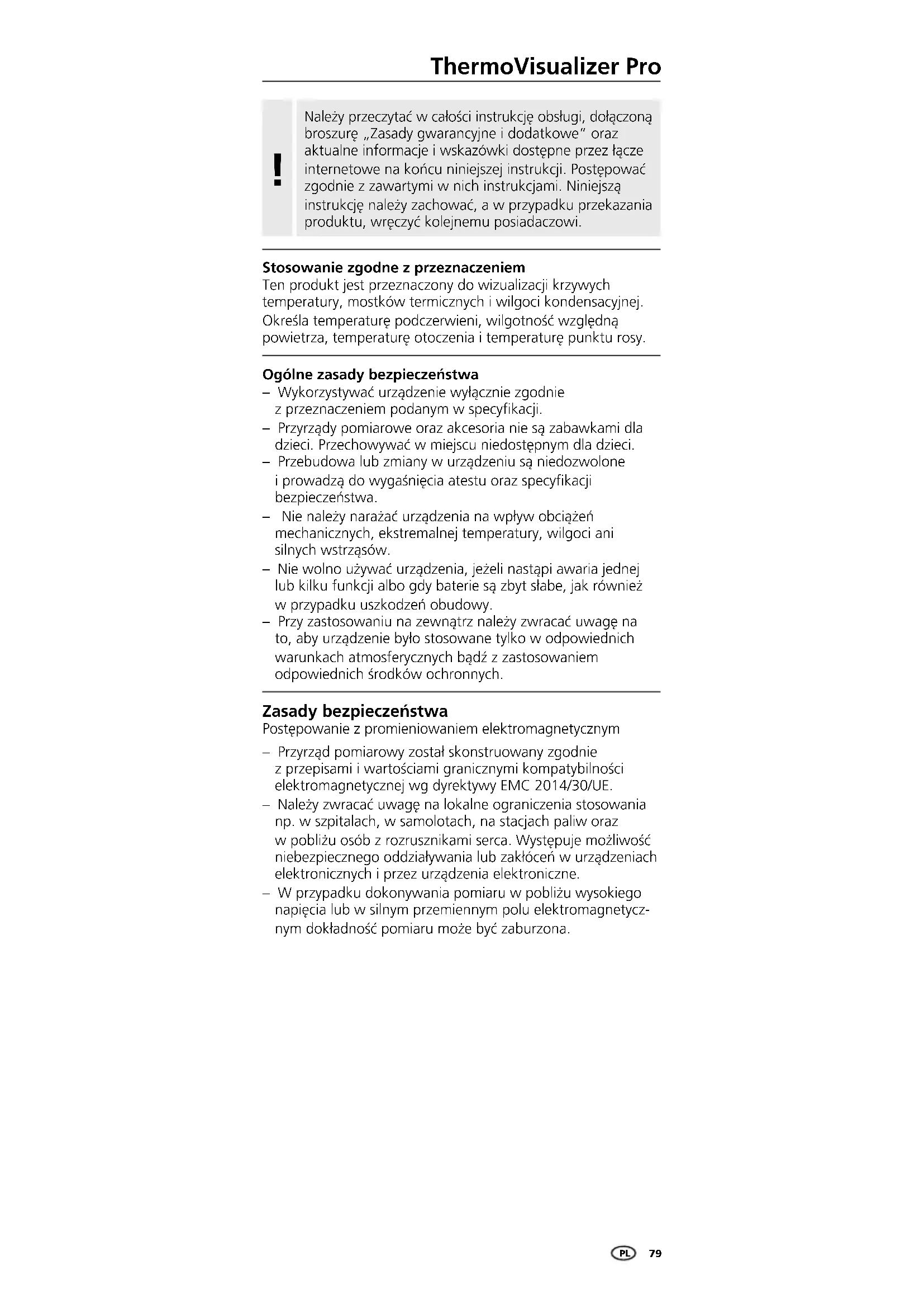 Ogólne zasady bezpieczeństwa – Wykorzystywać urządzenie wyłącznie zgodnie z przeznaczeniem podanym w specykacji. – Przyrządy pomiarowe oraz akcesoria nie są zabawkami dla dzieci. Przechowywać wmiejscu niedostępnym dla dzieci. – Przebudowa lub zmiany w urządzeniu są niedozwolone i prowadzą do wygaśnięcia atestu oraz specykacji bezpieczeństwa. – Nie należy narażać urządzenia na wpływ obciążeń mechanicznych, ekstremalnej temperatury, wilgoci ani silnych wstrząsów. – Nie wolno używać urządzenia, jeżeli nastąpi awaria jednej lub kilku funkcji albo gdy baterie są zbyt słabe, jak również w przypadku uszkodzeń obudowy. – Przy zastosowaniu na zewnątrz należy zwracać uwagę na to, aby urządzenie było stosowane tylko wodpowiednich warunkach atmosferycznych bądź zzastosowaniem odpowiednich środków ochronnych. Stosowanie zgodne z przeznaczeniem Ten produkt jest przeznaczony do wizualizacji krzywych temperatury, mostków termicznych i wilgoci kondensacyjnej. Określa temperaturę podczerwieni, wilgotność względną powietrza, temperaturę otoczenia i temperaturę punktu rosy. Należy przeczytać wcałości instrukcję obsługi, dołączoną broszurę „Zasady gwarancyjne idodatkowe” oraz aktualne informacje iwskazówki dostępne przez łącze internetowe na końcu niniejszej instrukcji. Postępować zgodnie z zawartymi w nich instrukcjami. Niniejszą instrukcję należy zachować, a w przypadku przekazania produktu, wręczyć kolejnemu posiadaczowi.