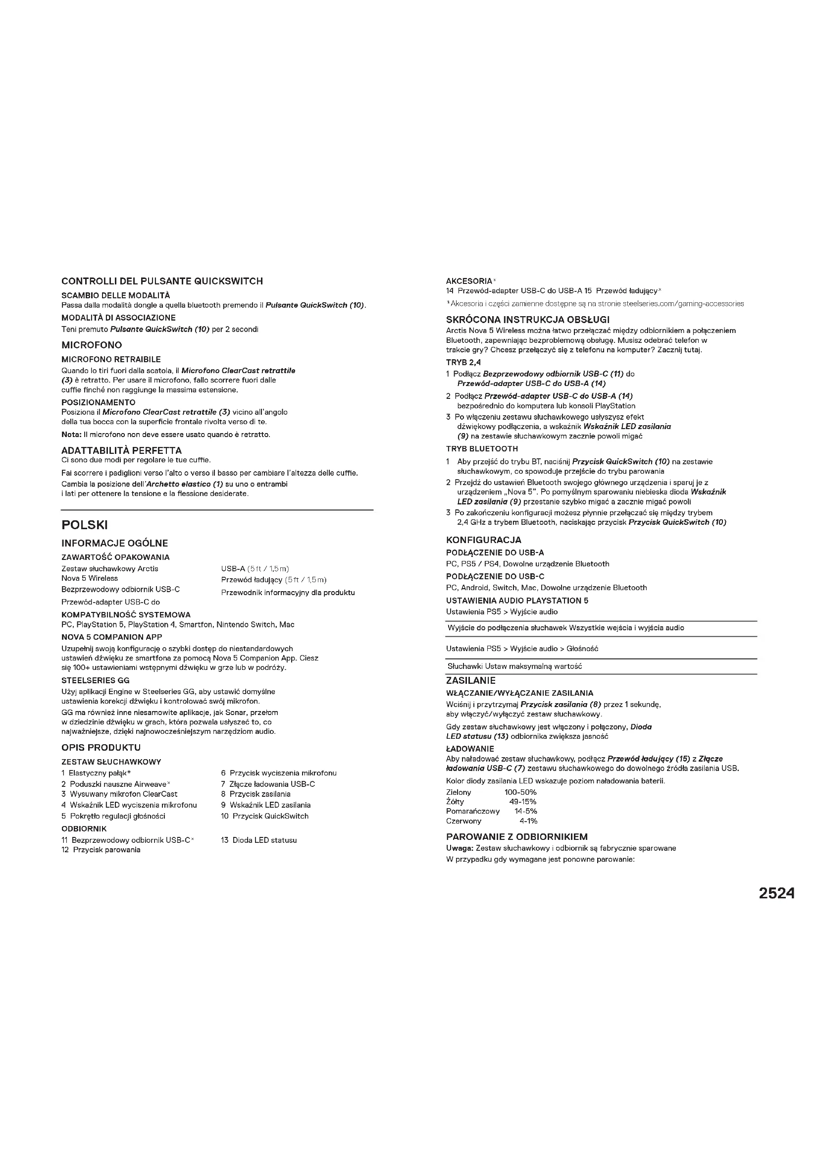 Arctis Nova 5 Wireless można łatwo przełączać między odbiornikiem a połączeniem Bluetooth, zapewniając bezproblemową obsługę. Musisz odebrać telefon w trakcie gry? Chcesz przełączyć się z telefonu na komputer? Zacznij tutaj. TRYB 2,4 1 Podłącz Bezprzewodowy odbiornik USB-C (11) do Przewód-adapter USB-C do USB-A (14) 2 Podłącz Przewód-adapter USB-C do USB-A (14) bezpośrednio do komputera lub konsoli PlayStation 3 Po włączeniu zestawu słuchawkowego usłyszysz efekt dźwiękowy podłączenia, a wskaźnik Wskaźnik LED zasilania (9) na zestawie słuchawkowym zacznie powoli migać TRYB BLUETOOTH 1 Aby przejść do trybu BT, naciśnij Przycisk QuickSwitch (10) na zestawie słuchawkowym, co spowoduje przejście do trybu parowania 2 Przejdź do ustawień Bluetooth swojego głównego urządzenia i sparuj je z urządzeniem „Nova 5”. Po pomyślnym sparowaniu niebieska dioda Wskaźnik LED zasilania (9) przestanie szybko migać a zacznie migać powoli 3 Po zakończeniu konguracji możesz płynnie przełączać się między trybem 2,4 GHz a trybem Bluetooth, naciskając przycisk Przycisk QuickSwitch (10) KONFIGURACJA
