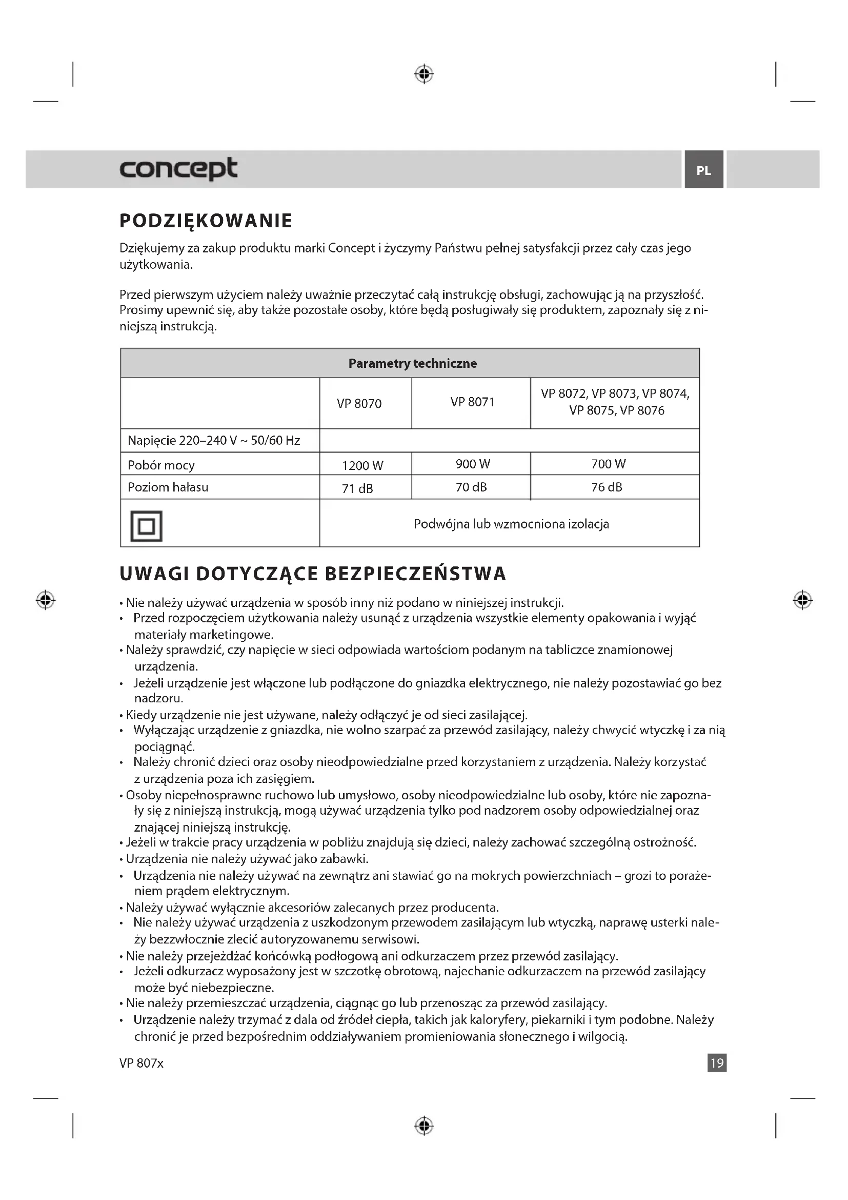 - Urządzenie należy trzymać z dala od źródeł ciepła, takich jak kaloryfery, piekarniki i tym podobne. Należy chronić je przed bezpośrednim oddziaływaniem promieniowania słonecznego i wilgocią. VP 807x Parametry techniczne VP 8072, VP 8073, VP 8074, VP 8075, VP 8076 Napięcie 220–240 V ~ 50/60 Hz Pobór mocy 700 W Poziom hałasu 76 dB Podwójna lub wzmocniona izolacja VP 8070 1200 W 71 dB VP 8071 900 W 70 dBPL