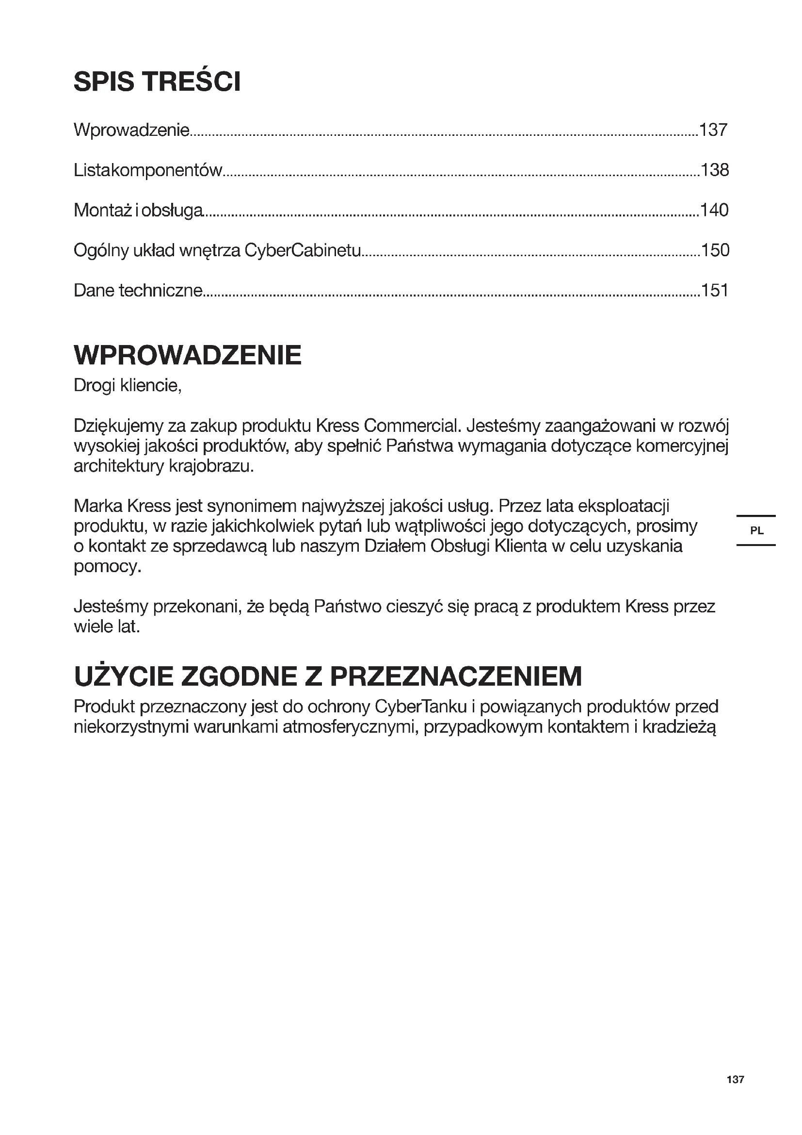 Ogólny układ wnĊtrza CyberCabinetu............................................................................................150 Dane techniczne.......................................................................................................................................151 WPROWADZENIE Drogi kliencie, DziĊkujemy za zakup produktu Kress Commercial. JesteĞmy zaangaĪowani w rozwój wysokiej jakoĞci produktów, aby spełniü PaĔstwa wymagania dotyczące komercyjnej architektury krajobrazu. Marka Kress jest synonimem najwyĪszej jakoĞci usług. Przez lata eksploatacji produktu, w razie jakichkolwiek pytaĔ lub wątpliwoĞci jego dotyczących, prosimy o kontakt ze sprzedawcą lub naszym Działem Obsługi Klienta w celu uzyskania pomocy. JesteĞmy przekonani, Īe bĊdą PaĔstwo cieszyü siĊ pracą z produktem Kress przez wiele lat. UĩYCIE ZGODNE Z PRZEZNACZENIEM Produkt przeznaczony jest do ochrony CyberTanku i powiązanych produktów przed niekorzystnymi warunkami atmosferycznymi, przypadkowym kontaktem i kradzieĪąPL