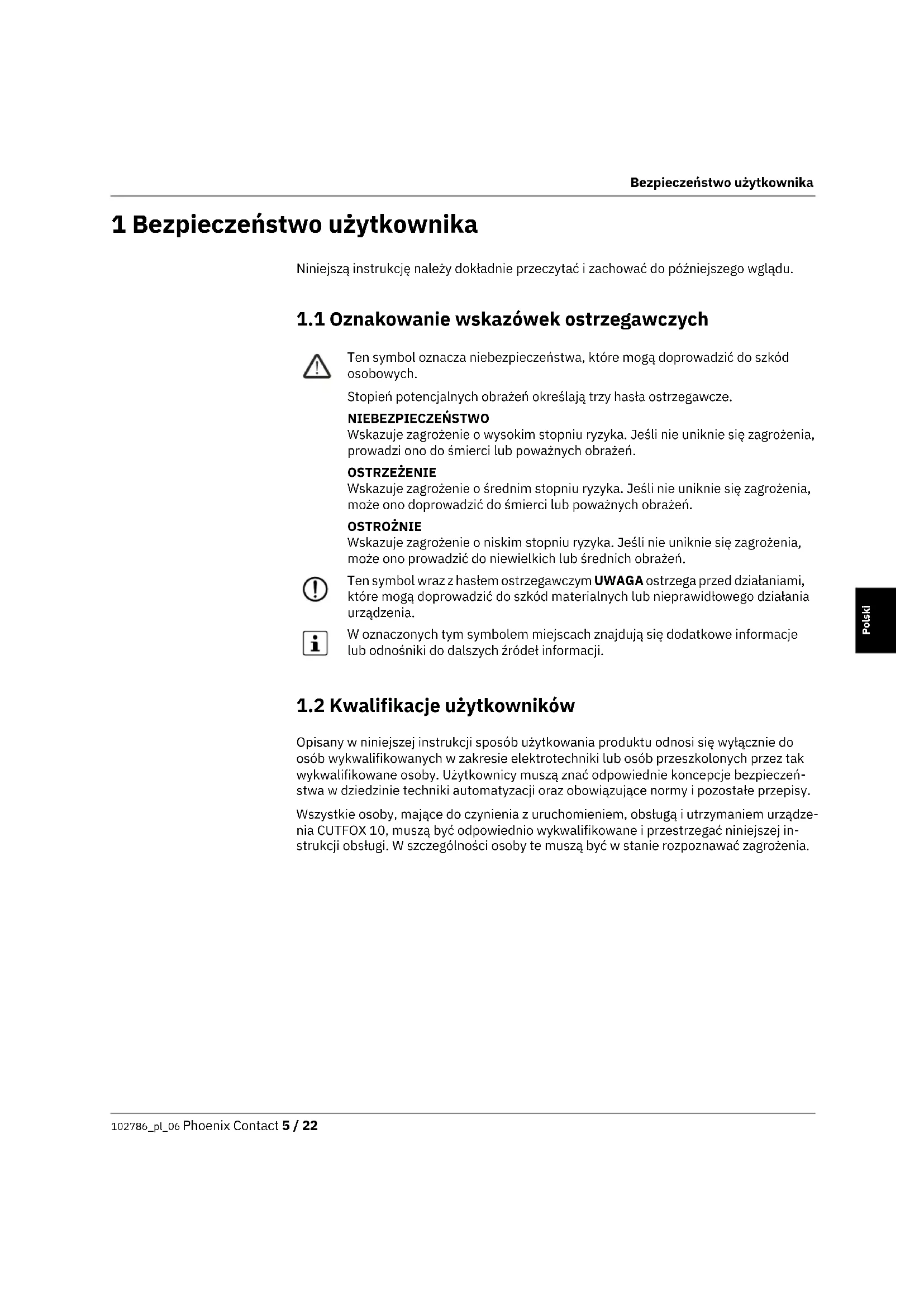 Opisany w niniejszej instrukcji sposób użytkowania produktu odnosi się wyłącznie do osób wykwalifikowanych w zakresie elektrotechniki lub osób przeszkolonych przez tak wykwalifikowane osoby. Użytkownicy muszą znać odpowiednie koncepcje bezpieczeń- stwa w dziedzinie techniki automatyzacji oraz obowiązujące normy i pozostałe przepisy. Wszystkie osoby, mające do czynienia z uruchomieniem, obsługą i utrzymaniem urządze- nia CUTFOX 10, muszą być odpowiednio wykwalifikowane i przestrzegać niniejszej in- strukcji obsługi. W szczególności osoby te muszą być w stanie rozpoznawać zagrożenia. Ten symbol oznacza niebezpieczeństwa, które mogą doprowadzić do szkód osobowych. Stopień potencjalnych obrażeń określają trzy hasła ostrzegawcze. NIEBEZPIECZEŃSTWO Wskazuje zagrożenie o wysokim stopniu ryzyka. Jeśli nie uniknie się zagrożenia, prowadzi ono do śmierci lub poważnych obrażeń. OSTRZEŻENIE Wskazuje zagrożenie o średnim stopniu ryzyka. Jeśli nie uniknie się zagrożenia, może ono doprowadzić do śmierci lub poważnych obrażeń. OSTROŻNIE Wskazuje zagrożenie o niskim stopniu ryzyka. Jeśli nie uniknie się zagrożenia, może ono prowadzić do niewielkich lub średnich obrażeń. Ten symbol wraz z hasłem ostrzegawczym UWAGA ostrzega przed działaniami, które mogą doprowadzić do szkód materialnych lub nieprawidłowego działania urządzenia. W oznaczonych tym symbolem miejscach znajdują się dodatkowe informacje lub odnośniki do dalszych źródeł informacji.CUTFOX 10 6 / 22 Phoenix Contact 102786_pl_06