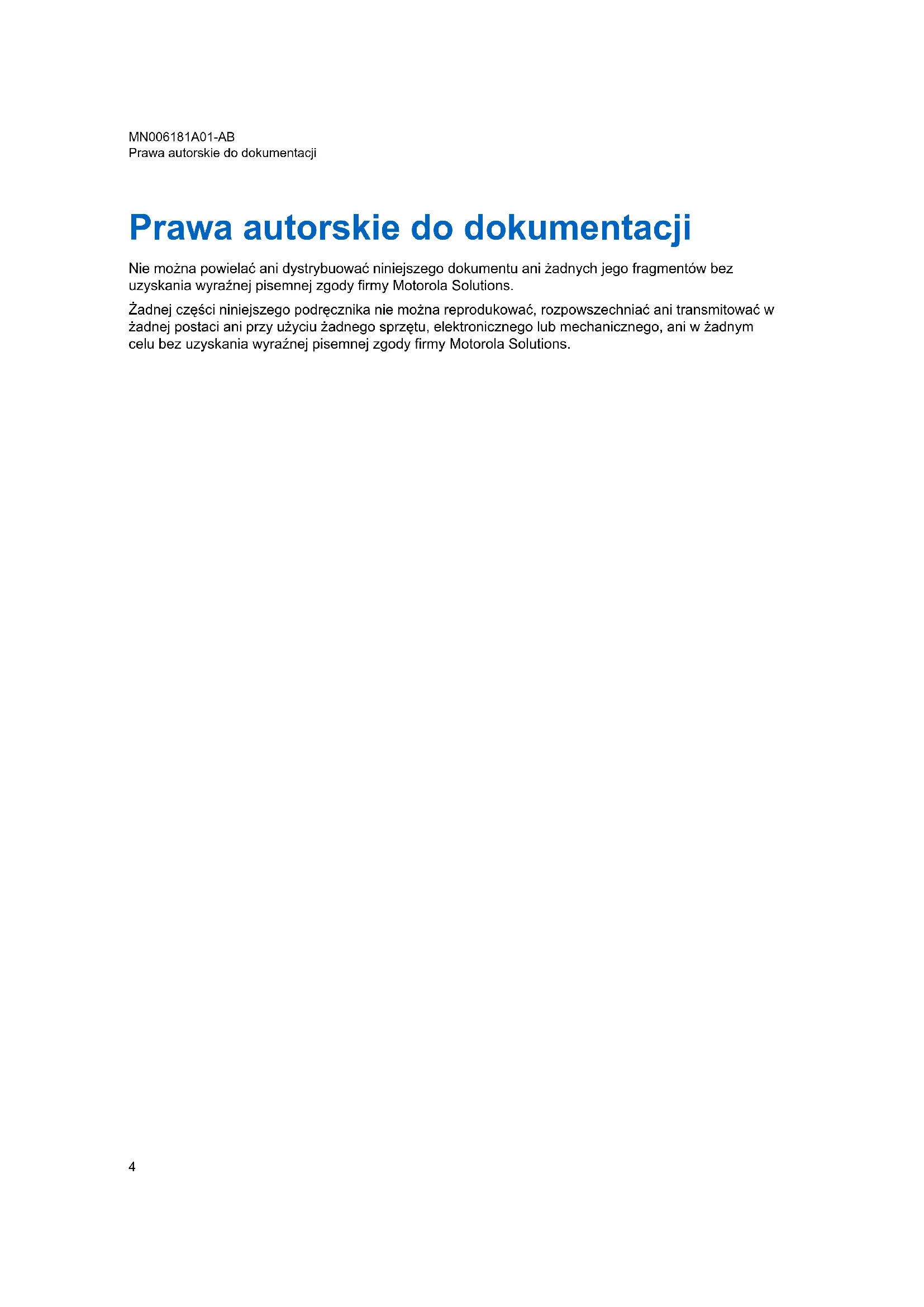 Rozdział 11. Akcesoria............................................................................................ 51 MN006181A01-AB Spis treści 3Prawa autorskie do dokumentacji Nie można powielać ani dystrybuować niniejszego dokumentu ani żadnych jego fragmentów bez uzyskania wyraźnej pisemnej zgody firmy Motorola Solutions. Żadnej części niniejszego podręcznika nie można reprodukować, rozpowszechniać ani transmitować w żadnej postaci ani przy użyciu żadnego sprzętu, elektronicznego lub mechanicznego, ani w żadnym celu bez uzyskania wyraźnej pisemnej zgody firmy Motorola Solutions. MN006181A01-AB Prawa autorskie do dokumentacji 4Zastrzeżenie Informacje zawarte w niniejszym dokumencie zostały starannie sprawdzone i uznane za całkowicie prawidłowe merytorycznie. Nie ponosimy jednak żadnej odpowiedzialności za ewentualne pomyłki. Ponadto firma Motorola Solutions zastrzega sobie prawo do wprowadzania zmian we wszystkich omawianych tu produktach w celu poprawy ich funkcjonowania lub konstrukcji. Firma Motorola Solutions nie przyjmuje żadnej odpowiedzialności wynikającej ze stosowania lub użytkowania dowolnych produktów lub obwodów omawianych w niniejszym dokumencie ani nie obejmuje nią żadnej licencji w ramach swoich praw patentowych lub praw innych podmiotów. MN006181A01-AB Zastrzeżenie 5Prawa autorskie do oprogramowania komputerowego Produkty firmy Motorola Solutions opisane w tym podręczniku mogą obejmować autorskie oprogramowanie firmy Motorola Solutions umieszczone w pamięci półprzewodnikowej lub na innych nośnikach. Prawo Stanów Zjednoczonych Ameryki Północnej i innych krajów chroni interes firmy Motorola Solutions w zakresie wyłączności własności programów komputerowych, włączając, ale nie ograniczając się do wyłącznego prawa do kopiowania lub reprodukcji w każdej formie programów komputerowych objętych prawami autorskimi. Zgodnie z powyższym żaden program komputerowy firmy Motorola Solutions objęty prawami autorskimi, zawarty w urządzeniach firmy Motorola Solutions opisywanych w niniejszym podręczniku, nie może być skopiowany, powielony, poddany modyfikacji, przetwarzaniu wstecznemu lub dystrybucji w jakiejkolwiek formie bez uzyskania wyraźnej pisemnej zgody firmy Motorola Solutions. Ponadto zakup produktów firmy Motorola Solutions nie może być uważany za przekazanie – w sposób bezpośredni, dorozumiany, na podstawie wcześniejszych oświadczeń lub w jakikolwiek inny – licencji chronionych prawami autorskimi, patentami lub zgłoszeniami patentowymi, należących do firmy Motorola Solutions. Wyjątek stanowi zwykła, niewyłączna, wolna od opłat licencja, jaka zgodnie z prawem jest skutkiem transakcji sprzedaży produktu. MN006181A01-AB Prawa autorskie do oprogramowania komputerowego 6Informacje dotyczące bezpieczeństwa korzystania z akumulatorów, ładowarek i akcesoriów audio Niniejszy dokument zawiera ważne instrukcje dotyczące bezpieczeństwa i eksploatacji. Należy się z nimi dokładnie zapoznać i zachować na przyszłość. Przed użyciem bazy do ładowania przeczytaj wszystkie instrukcje i oznaczenia ostrzegawcze widoczne na: