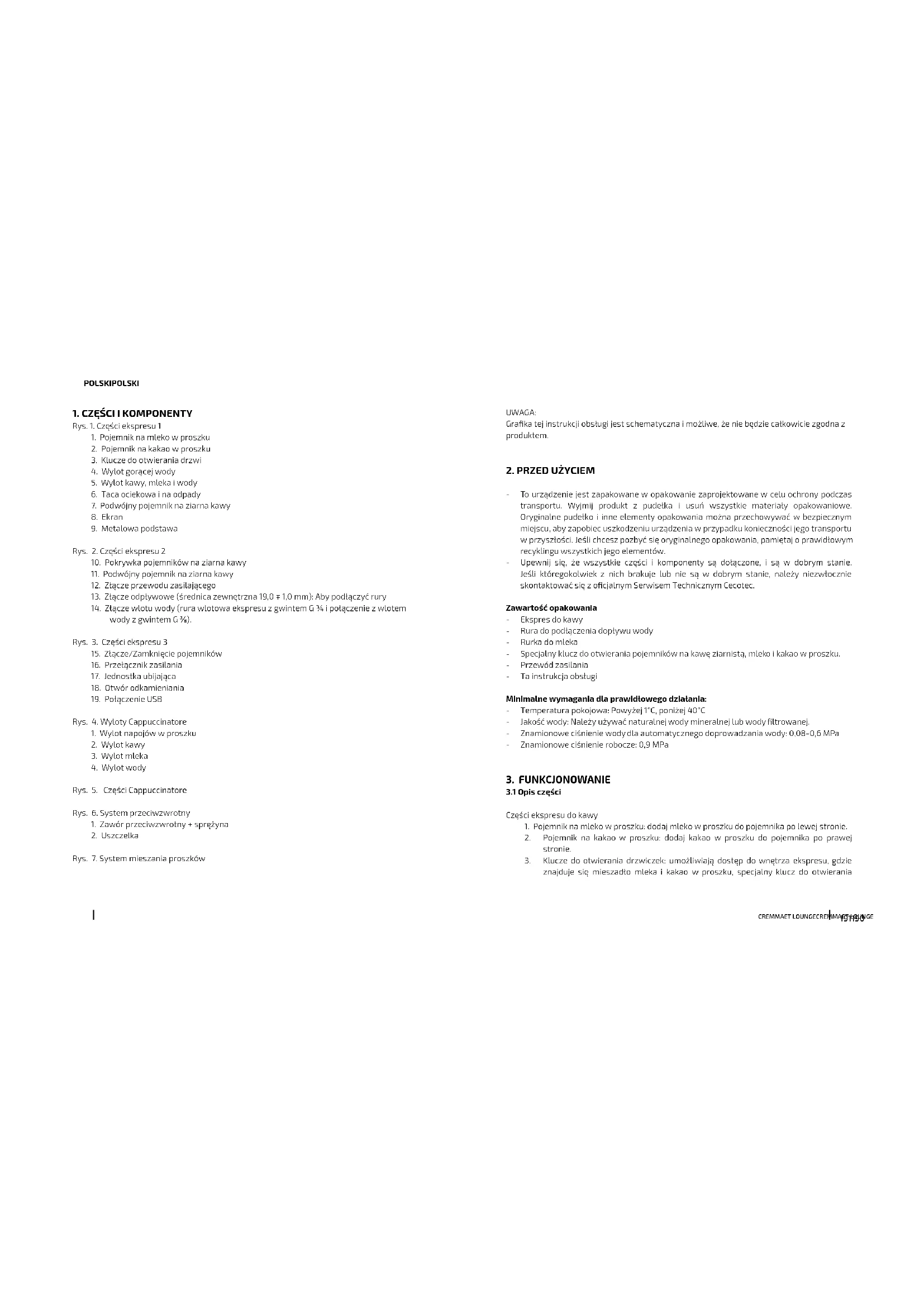 jego serwis posprzedażny lub podobnie wykwalikowany personel w celu uniknięcia zagrożenia. - Wyłącz urządzenie i odłącz zasilanie przed wymianą akcesoriów lub części, które poruszają się podczas pracy. - To urządzenie jest przeznaczone do użytku domowego i podobnych zastosowań, takich jak: o kuchnie dla personelu w sklepach, biurach i innych miejscach pracy; o gospodarstwa rolne; o przez klientów w hotelach, motelach i innych obiektach mieszkalnych; o obiektach typu hostel (B&B) - Nie zanurzaj przewodu, wtyczki ani żadnej innej części urządzenia w wodzie lub innej cieczy ani nie wystawiaj połączeń elektrycznych na działanie wody. Przed dotknięciem wtyczki lub włączeniem urządzenia upewnij się, że masz całkowicie suche ręce. - Urządzenie nie może być zanurzanie w wodzie. - Podczas używania ekspresu do kawy nie należy umieszczać w szafce. - OSTRZEŻENIE: Nie używaj urządzenia, jeśli powierzchnia jest pęknięta. - Czyszczenie i konserwacja produktu nie mogą być przeprowadzane przez dzieci bez nadzoru. - Unikaj rozlania płynu na przewód. - Powierzchnia elementu grzejnego po użyciu będzie gorąca do ostygnięcia. - W przypadku niewłaściwego użycia może dojść do obrażeń ciała i/lub szkód materialnych. - OSTRZEŻENIE: podczas użytkowania nie wolno otwierać otworu wlewowego. - OSTRZEŻENIE: zachowaj środki ostrożności, aby uniknąć rozlania płynów na przewód. - OSTRZEŻENIE: błędne lub niewłaściwe użytkowanie może stanowić zagrożenie zarówno dla urządzenia, jak i użytkownika. Używaj tego urządzenia do celów opisanych w niniejszej instrukcji. Powierzchnia elementu grzejnego po użyciu będzie gorąca do ostygnięcia. - Zawsze odłączaj urządzenie od zasilania, jeśli jest pozostawione bez nadzoru oraz przed montażem, demontażem lub czyszczeniem. - Obowiązkiem użytkownika jest upewnienie się, że wszyscy użytkownicy zostali poinformowani o środkach ostrożności wymienionych w niniejszej instrukcji. Nie używaj urządzenia do celów innych niż te określone w instrukcji. - Upewnij się, że napięcie sieciowe odpowiada napięciu podanemu na tabliczce znamionowej urządzenia i że wtyczka jest uziemiona. - Odłącz urządzenie od gniazdka elektrycznego w poniższych sytuacjach: