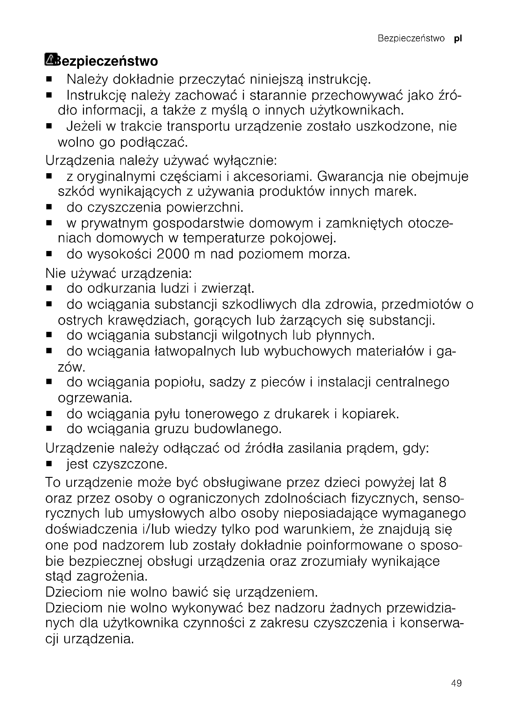 Toz haznesi filtresini temizleyiniz. Hava çıkış filtresi kirli. Hava çıkış filtresini temizleyiniz. Turbo başlık fırçası dönmüyor. Rulo fırça kirlenmiştir. Rulo fırçayı temizleyiniz. Süğüröe gücü çok azdır. Güç ayarlayıcısını azami emiş gücüne çeviriniz. Eski cihazları atığa vermeEski cihazları atığa verme Cihazı çevreye zarar vermeyecek şekilde imha ediniz. Güncel imha yol ve yöntemleri hakkında bilgi edinmek için lütfen yetkili satıcınıza veya bağlı olduğunuz belediyeye ya da şehir idaresine başvurunuz. Bu ürün T.C. Çevre, Şehircilik ve İklim Değişikliği Bakanlığı tarafından yayımlanan “Elektrikli ve Elektronik Eşyalarda Bazı Zararlı Maddelerin Kullanımının Kısıtlanmasına İlişkin Yönetmeliği’nde belirtilen zararlı ve yasaklı maddeleri içermez”. AEEE yönetmeliğine uygundur. Bu ürün, geri dönüşümlü ve tekrar kullanılabilir nitelikteki yüksek kaliteli parça ve malzemelerden üretilmiştir. Bu nedenle, ürünü, hizmet ömrünün sonunda evsel veya diğer atıklarla birlikte atmayın. Elektrikli ve elektronik cihazların geri dönüşümü için bir toplama noktasına götürün. Bu toplama noktalarını bölgenizdeki yerel yönetime sorun. Kullanılmış ürünleri geri kazanıma vererek çevrenin ve doğal kaynakların korunmasına yardımcı olun. Ürünü atmadan önce çocukların güvenliği için elektrik fişini kesin ve kilit mekanizmasını kırarak çalışmaz duruma getirin. Müşteri hizmetleriMüşteri hizmetleri Ülkenizde geçerli olan garanti süresi ve garanti koşulları ile ilgili ayrıntılı bilgileri ekteki belgede yer alan QR kodu aracılığıyla servis iletişim kişilerine ve garanti koşullarına, ekteki müşteri hizmetleri listesinden, müşteri hizmetlerimizden, yetkili satıcımızdan veya Web sitemizden alabilirsiniz. İthalatçı Firma: BSH Ev Aletleri ve Sanayi Ticaret A.Ş. Fatih Sultan Mehmet Mah. Balkan Cad. No:51 Ümraniye-İstanbul-Türkiye Tel : 0216 528 90 00 Fax : 0216 528 99 99 47tr Müşteri hizmetleri Üretici Firma : BSH Hausgeräte GmbH Carl-Wery Straße 34 81739 München, Germany www.bosch-home.com Müşteri hizmetlerinin iletişim verilerini ekteki belgede yer alan QR kodu aracılığıyla servis iletişim kişilerine ve garanti koşullarına, ekteki müşteri hizmetleri listesinden veya Web sitemizde bulabilirsiniz. Tüm yetkili servis istasyonlarının iletişim bilgilerine aşağıdaki web sitemizden ulaşabilirsiniz. https://www.bosch-yetkiliservisi.com/ Ayrıca yetkili servis istasyonlarına ait bilgiler, ilgili bakanlık tarafından oluşturulan www.servis.gov.tr adresli web sitesinde yer almaktadır. SGM-2024/5 yönetmeliğine uygun bilgileri, cihazınızın ürün sayfasında ve servis sayfasında www.bosch-home.com altında çevrimiçi olarak ilgili kullanım talimatlarında ve ek belgelerde bulabilirsiniz. 48Bezpieczeństwo pl Bezpieczeństwo Bezpieczeństwo ¡ Należy dokładnie przeczytać niniejszą instrukcję. ¡ Instrukcję należy zachować i starannie przechowywać jako źró- dło informacji, a także z myślą o innych użytkownikach. ¡ Jeżeli w trakcie transportu urządzenie zostało uszkodzone, nie wolno go podłączać. Urządzenia należy używać wyłącznie: ¡ zoryginalnymi częściami iakcesoriami. Gwarancja nie obejmuje szkód wynikających z używania produktów innych marek. ¡ do czyszczenia powierzchni. ¡ w prywatnym gospodarstwie domowym i zamkniętych otocze- niach domowych w temperaturze pokojowej. ¡ do wysokości 2000m nad poziomem morza. Nie używać urządzenia: ¡ do odkurzania ludzi i zwierząt. ¡ do wciągania substancji szkodliwych dla zdrowia, przedmiotów o ostrych krawędziach, gorących lub żarzących się substancji. ¡ do wciągania substancji wilgotnych lub płynnych. ¡ do wciągania łatwopalnych lub wybuchowych materiałów i ga- zów. ¡ do wciągania popiołu, sadzy z pieców i instalacji centralnego ogrzewania. ¡ do wciągania pyłu tonerowego z drukarek i kopiarek. ¡ do wciągania gruzu budowlanego. Urządzenie należy odłączać od źródła zasilania prądem, gdy: ¡ jest czyszczone. To urządzenie może być obsługiwane przez dzieci powyżej lat 8 oraz przez osoby oograniczonych zdolnościach fizycznych, senso- rycznych lub umysłowych albo osoby nieposiadające wymaganego doświadczenia i/lub wiedzy tylko pod warunkiem, że znajdują się one pod nadzorem lub zostały dokładnie poinformowane o sposo- bie bezpiecznej obsługi urządzenia oraz zrozumiały wynikające stąd zagrożenia. Dzieciom nie wolno bawić się urządzeniem. Dzieciom nie wolno wykonywać bez nadzoru żadnych przewidzia- nych dla użytkownika czynności z zakresu czyszczenia i konserwa- cji urządzenia. 49pl Bezpieczeństwo Naprawy urządzenia mogą być wykonywane wyłącznie przez wy- kwalifikowany personel. Do naprawy urządzenia należy używać wyłącznie oryginalnych części zamiennych. W przypadku uszkodzenia przewodu sieciowego tego urządze- nia należy zlecić jego wymianę przez producenta, jego serwis lub przez odpowiednio wykwalifikowaną osobę, co jest koniecznym warunkiem wykluczenia zagrożeń. Nigdy nie włączać uszkodzonego urządzenia. Nigdy nie używać urządzenia, jeżeli jego powierzchnia jest pęk- nięta lub złamana. Nigdy nie ciągnąć za przewód przyłączeniowy, aby odłączyć urządzenie od sieci. Zawsze ciągnąć za wtyczkę przewodu przy- łączeniowego. Nigdy nie ciągnąć ani nie przenosić urządzenia za kabel przyłą- czeniowy. W przypadku uszkodzenia urządzenia lub przewodu przyłącze- niowego należy natychmiast wyciągnąć wtyczkę przewodu przy- łączeniowego lub wyłączyć bezpiecznik w skrzynce bezpieczni- kowej. Wezwać serwis.