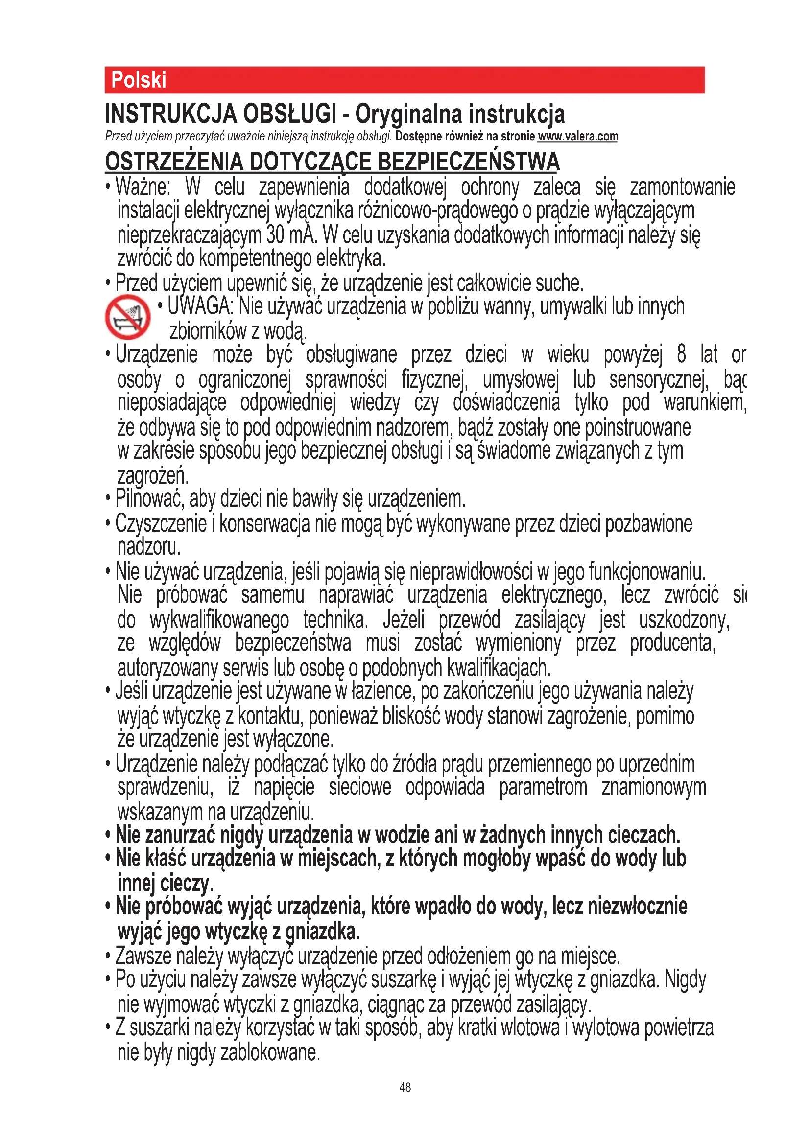 VALERA este marcă înregistrată a companiei LIGO PATENTS SA-Elveţia48 Polski INSTRUKCJA OBSŁUGI - Oryginalna instrukcja Przed użyciem przeczytać uważnie niniejszą instrukcję obsługi. Dostępne również na stronie www.valera.com