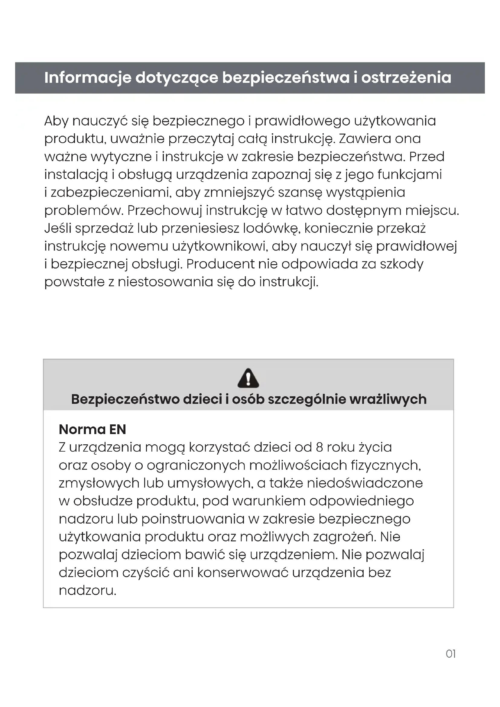 - Utylizacja urządzenia Informacje dotyczące bezpieczeństwa i ostrzeżenia Aby nauczyć się bezpiecznego i prawidłowego użytkowania produktu, uważnie przeczytaj całą instrukcję. Zawiera ona ważne wytyczne i instrukcje w zakresie bezpieczeństwa. Przed instalacją i obsługą urządzenia zapoznaj się z jego funkcjami i zabezpieczeniami, aby zmniejszyć szansę wystąpienia problemów. Przechowuj instrukcję w łatwo dostępnym miejscu. Jeśli sprzedaż lub przeniesiesz lodówkę, koniecznie przekaż instrukcję nowemu użytkownikowi, aby nauczył się prawidłowej i bezpiecznej obsługi. Producent nie odpowiada za szkody powstałe z niestosowania się do instrukcji. Bezpieczeństwo dzieci i osób szczególnie wrażliwych Norma EN Z urządzenia mogą korzystać dzieci od 8 roku życia oraz osoby o ograniczonych możliwościach fizycznych, zmysłowych lub umysłowych, a także niedoświadczone w obsłudze produktu, pod warunkiem odpowiedniego nadzoru lub poinstruowania w zakresie bezpiecznego użytkowania produktu oraz możliwych zagrożeń. Nie pozwalaj dzieciom bawić się urządzeniem. Nie pozwalaj dzieciom czyścić ani konserwować urządzenia bez nadzoru.02 Bezpieczeństwo dzieci i osób szczególnie wrażliwych Norma IEC Z urządzenia nie mogą korzystać osoby (w tym dzieci) o ograniczonych możliwościach fizycznych, zmysłowych lub umysłowych, a także niedoświadczone w obsłudze produktu, chyba że będą nadzorowane lub zostaną poinstruowane w zakresie użytkowania urządzenia przez opiekuna. Nie pozwalaj dzieciom bawić się materiałami opakowaniowymi, aby nie doszło do uduszenia. Przed utylizacją urządzenia wyłącz je, wyjmij wtyczkę z gniazdka, odetnij przewód zasilający jak najbliżej urządzenia, po czym zdemontuj drzwiczki, aby zapobiec porażeniu prądem lub uwięźnięciu dziecka. Przed wymianą starszego urządzenia na nowe upewnij się, że zatrzask lub blokada sprężynowa nie działa, aby zapobiec przypadkowemu uwięźnięciu. Informacje dotyczące bezpieczeństwa i ostrzeżenia03 Informacje dotyczące bezpieczeństwa i ostrzeżenia Bezpieczeństwo — kwestie ogólne p. 3501