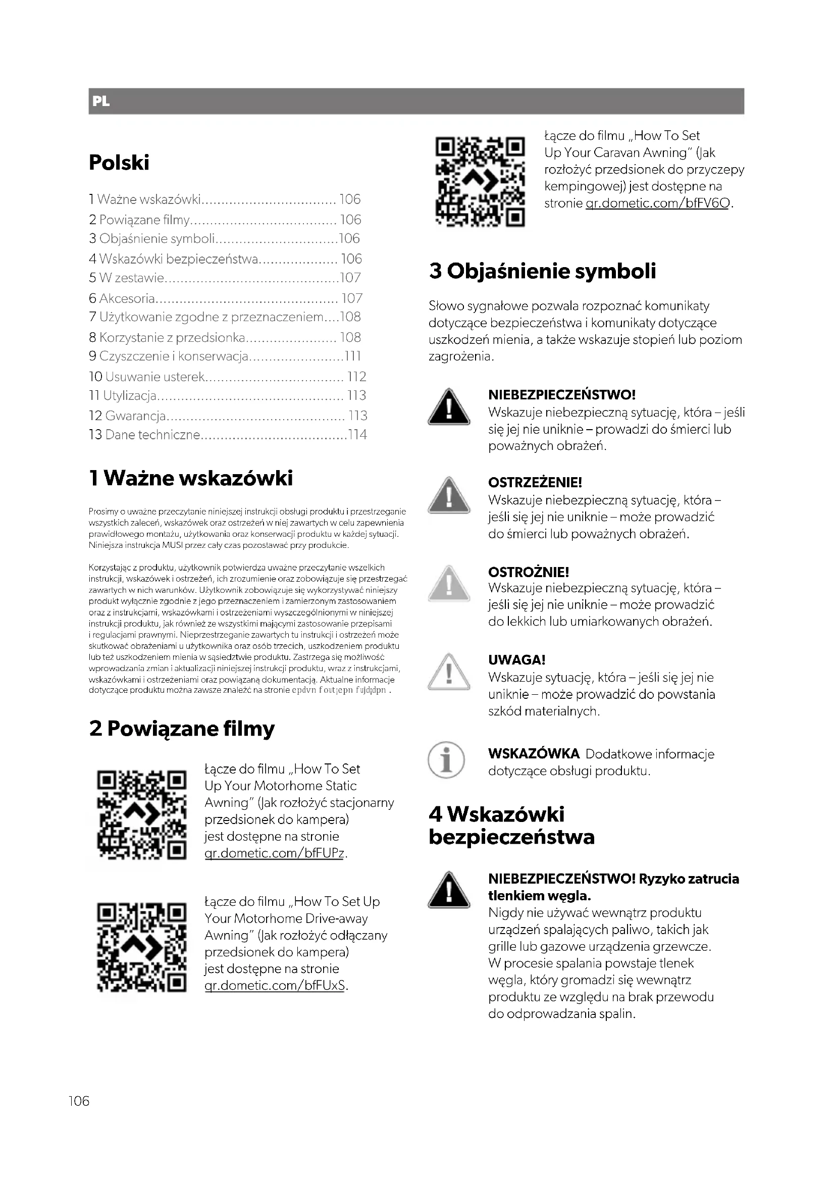 - Valitusperuste tai vikakuvaus Huomaa, että itse tai väärin tehty korjaus voi vaarantaa turvallisuuden ja johtaa takuun raukeamiseen. Takuu kattaa valmistusvirheet, materiaalit ja osat. Takuu ei kata päällysteen haalistumista eikä UV- säteilystä johtuvaa kulumista, väärinkäyttöä, vahingoista syntyneitä vaurioita, myrskyvaurioita eikä jatkuvaa, osittain jatkuvaa eikä kaupallista käyttöä. Se ei kata seurannaisvaurioita. Jos sinulla on aihetta valitukseen, ota yhteyttä jälleenmyyjään. Tämä ei rajoita lakisääteisiä oikeuksiasi. 104FI 13 Tekniset tiedot Leveys (mm) Syvyys (mm) Paino (kg) Vähimmäispaino (kg) Grande AIR Tour 390 S 390 300 24.5 /7.24 18.1 Grande AIR Tour 390 M 390 300 25.1 / 7.2 18.6 Rally AIR Tour 200 S 200 250 19 10.3 Rally AIR Tour 260 S 260 250 24.2 13.1 Rally AIR Tour 260 M 260 250 24.7 13.7 Rally AIR Tour 330 S 330 250 26 14.1 Rally AIR Tour 330 M 330 250 26.5 14.7 Rally AIR Tour 390 S 390 250 27.6 15.2 Rally AIR Tour 390 M 390 250 28.1 15.2 Rally AIR Tour 260 DA 260 250 25.1 / 7.2 15 Rally AIR Tour 330 DA 330 250 26.5 / 8.2 20.7 Rally AIR Tour 390 DA 390 250 27.1 / 9.1 24 Leggera AIR 220 S 220 240 8.7 7.4 Leggera AIR 260 S 260 240 12.2 8.4 Leggera AIR 260 M 260 240 12.6 9 105PL Polski 1 Ważne wskazówki.................................. 106 2 Powiązane filmy..................................... 106 3 Objaśnienie symboli...............................106 4 Wskazówki bezpieczeństwa.................... 106 5 Wzestawie............................................107 6 Akcesoria.............................................. 107 7 Użytkowanie zgodne zprzeznaczeniem....108 8 Korzystanie zprzedsionka....................... 108 9 Czyszczenie ikonserwacja........................111 10 Usuwanie usterek................................... 112 11 Utylizacja............................................... 113 12 Gwarancja............................................. 113 13 Dane techniczne.....................................114 1 Ważne wskazówki Prosimy ouważne przeczytanie niniejszej instrukcji obsługi produktu iprzestrzeganie wszystkich zaleceń, wskazówek orazostrzeżeń w niej zawartych w celu zapewnienia prawidłowego montażu, użytkowania oraz konserwacji produktu w każdej sytuacji. Niniejsza instrukcja MUSI przez cały czas pozostawać przy produkcie. Korzystając zproduktu, użytkownik potwierdza uważne przeczytanie wszelkich instrukcji, wskazówek iostrzeżeń, ich zrozumienie oraz zobowiązuje się przestrzegać zawartych wnich warunków. Użytkownik zobowiązuje się wykorzystywać niniejszy produkt wyłącznie zgodnie zjego przeznaczeniem izamierzonym zastosowaniem oraz zinstrukcjami, wskazówkami iostrzeżeniami wyszczególnionymi wniniejszej instrukcji produktu, jak również ze wszystkimi mającymi zastosowanie przepisami iregulacjami prawnymi. Nieprzestrzeganie zawartych tu instrukcji iostrzeżeń może skutkować obrażeniami uużytkownika oraz osób trzecich, uszkodzeniem produktu lub też uszkodzeniem mienia wsąsiedztwie produktu. Zastrzega się możliwość wprowadzania zmian iaktualizacji niniejszej instrukcji produktu, wraz zinstrukcjami, wskazówkami iostrzeżeniami oraz powiązaną dokumentacją. Aktualne informacje dotyczące produktu można zawsze znaleźć nastronie documents.dometic.com. 2 Powiązane filmy Łącze dofilmu „How To Set Up Your Motorhome Static Awning” (Jak rozłożyć stacjonarny przedsionek dokampera) jest dostępne na stronie qr.dometic.com/bfFUPz. Łącze dofilmu „How To Set Up Your Motorhome Drive-away Awning” (Jak rozłożyć odłączany przedsionek dokampera) jest dostępne na stronie qr.dometic.com/bfFUxS. Łącze dofilmu „How To Set Up Your Caravan Awning” (Jak rozłożyć przedsionek doprzyczepy kempingowej) jest dostępne na stronie qr.dometic.com/bfFV6O. 3 Objaśnienie symboli Słowo sygnałowe pozwala rozpoznać komunikaty dotyczące bezpieczeństwa i komunikaty dotyczące uszkodzeń mienia, a także wskazuje stopień lub poziom zagrożenia. NIEBEZPIECZEŃSTWO! Wskazuje niebezpieczną sytuację, która – jeśli się jej nie uniknie – prowadzi dośmierci lub poważnych obrażeń. OSTRZEŻENIE! Wskazuje niebezpieczną sytuację, która – jeśli się jej nie uniknie – może prowadzić dośmierci lub poważnych obrażeń. OSTROŻNIE! Wskazuje niebezpieczną sytuację, która – jeśli się jej nie uniknie – może prowadzić dolekkich lub umiarkowanych obrażeń. UWAGA! Wskazuje sytuację, która – jeśli się jej nie uniknie – może prowadzić dopowstania szkód materialnych. WSKAZÓWKA Dodatkowe informacje dotyczące obsługi produktu. 4 Wskazówki bezpieczeństwa NIEBEZPIECZEŃSTWO! Ryzyko zatrucia tlenkiem węgla. Nigdy nie używać wewnątrz produktu urządzeń spalających paliwo, takich jak grille lub gazowe urządzenia grzewcze. Wprocesie spalania powstaje tlenek węgla, który gromadzi się wewnątrz produktu ze względu nabrak przewodu doodprowadzania spalin. 106PL OSTRZEŻENIE! Ryzyko pożaru