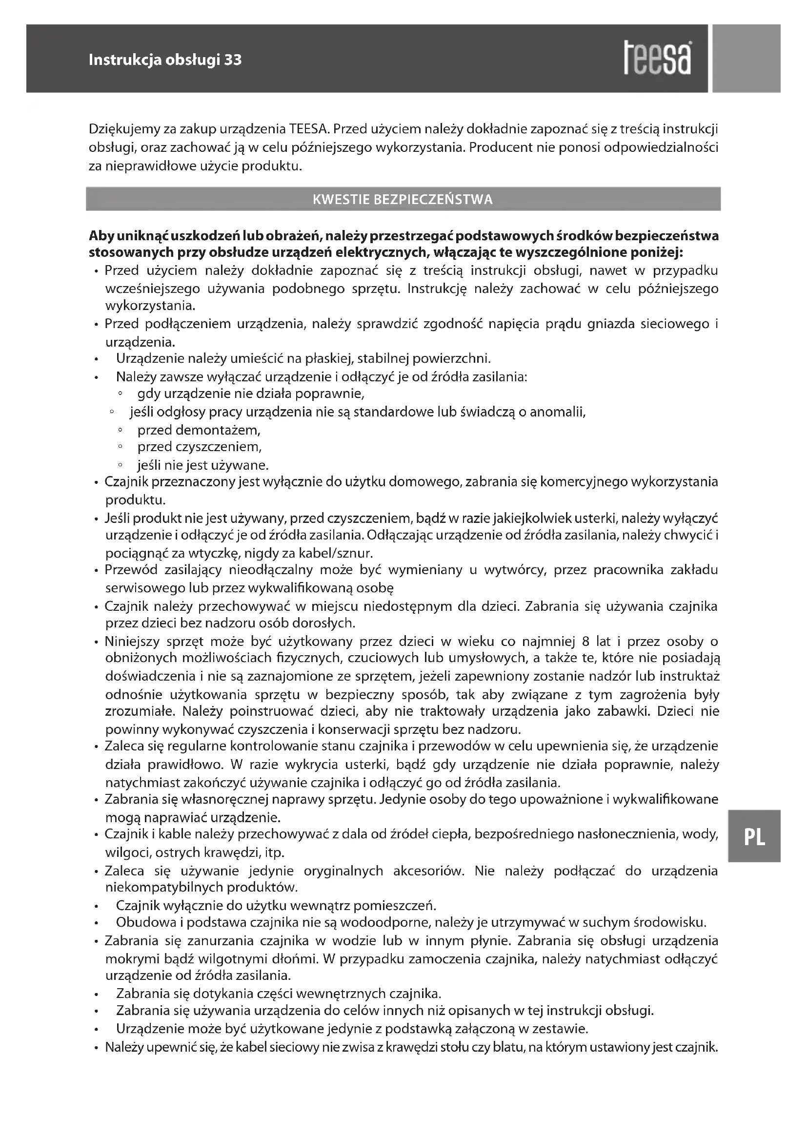 - Należy upewnić się, że kabel sieciowy nie zwisa z krawędzi stołu czy blatu, na którym ustawiony jest czajnik.PL Instrukcja obsługi34