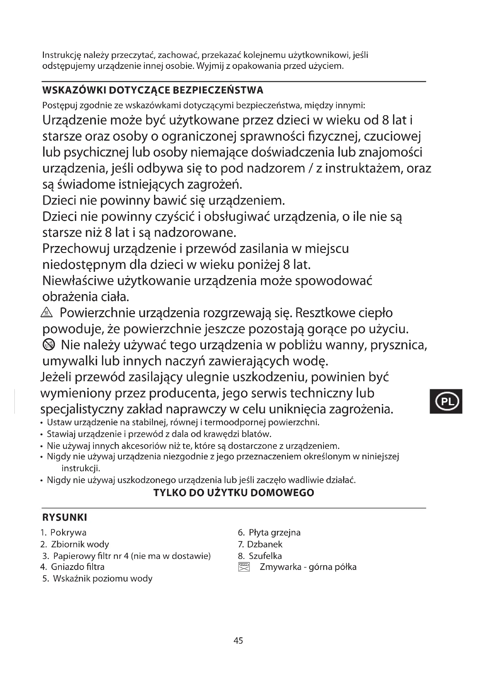 Postępuj zgodnie ze wskazówkami dotyczącymi bezpieczeństwa, między innymi: Urządzenie może być użytkowane przez dzieci w wieku od 8 lat i starsze oraz osoby o ograniczonej sprawności zycznej, czuciowej lub psychicznej lub osoby niemające doświadczenia lub znajomości urządzenia, jeśli odbywa się to pod nadzorem / z instruktażem, oraz są świadome istniejących zagrożeń. Dzieci nie powinny bawić się urządzeniem. Dzieci nie powinny czyścić i obsługiwać urządzenia, o ile nie są starsze niż 8 lat i są nadzorowane. Przechowuj urządzenie i przewód zasilania w miejscu niedostępnym dla dzieci w wieku poniżej 8 lat. Niewłaściwe użytkowanie urządzenia może spowodować obrażenia ciała. h Powierzchnie urządzenia rozgrzewają się. Resztkowe ciepło powoduje, że powierzchnie jeszcze pozostają gorące po użyciu. b Nie należy używać tego urządzenia w pobliżu wanny, prysznica, umywalki lub innych naczyń zawierających wodę. Jeżeli przewód zasilający ulegnie uszkodzeniu, powinien być wymieniony przez producenta, jego serwis techniczny lub specjalistyczny zakład naprawczy w celu uniknięcia zagrożenia.