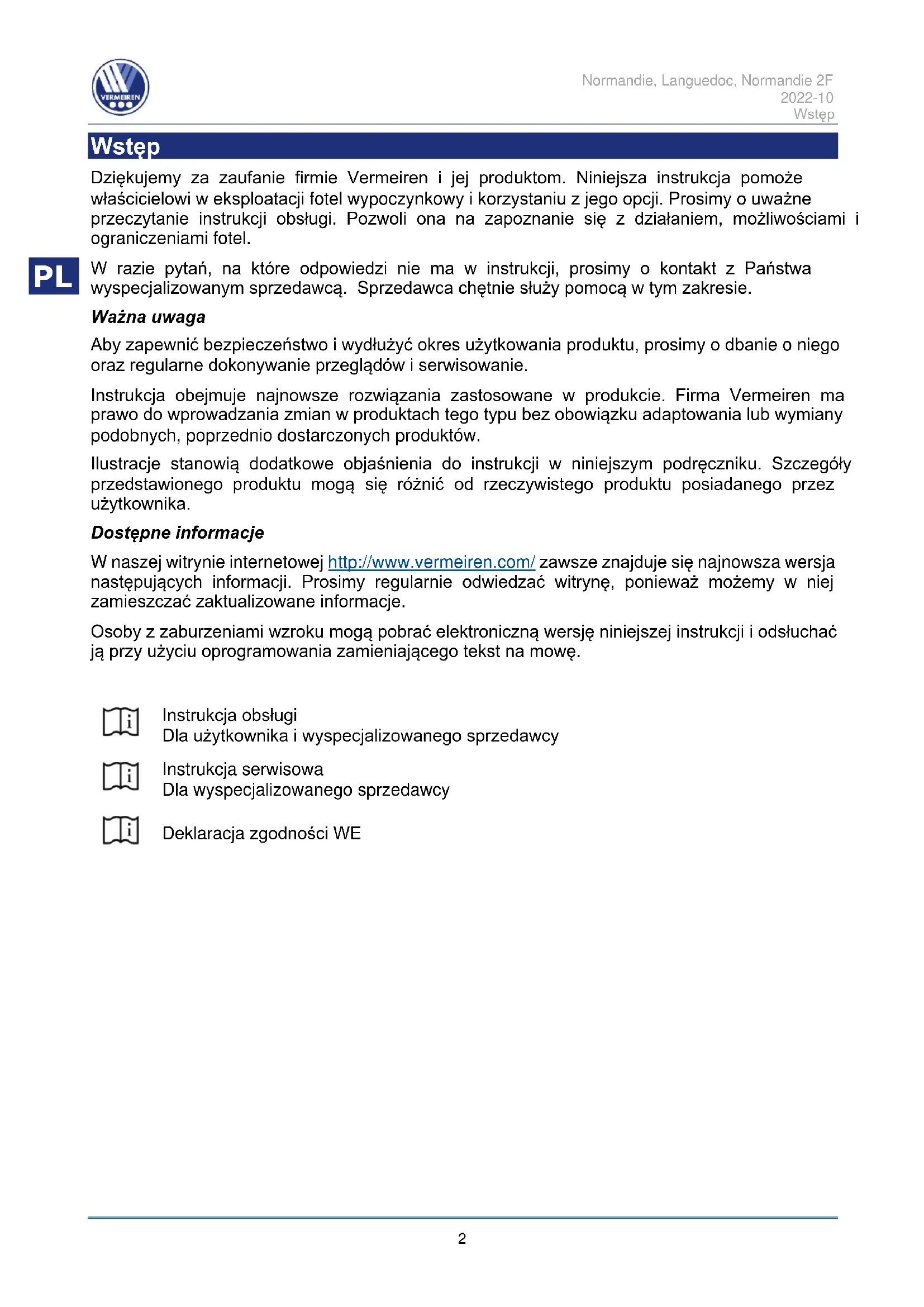 Wstęp Dziękujemy za zaufanie firmie Vermeiren i jej produktom. Niniejsza instrukcja pomoże właścicielowi w eksploatacji fotel wypoczynkowy i korzystaniu z jego opcji. Prosimy o uważne przeczytanie instrukcji obsługi. Pozwoli ona na zapoznanie się z działaniem, możliwościami i ograniczeniami fotel. W razie pytań, na które odpowiedzi nie ma w instrukcji, prosimy o kontakt z Państwa wyspecjalizowanym sprzedawcą. Sprzedawca chętnie służy pomocą w tym zakresie. Ważna uwaga Aby zapewnić bezpieczeństwo i wydłużyć okres użytkowania produktu, prosimy o dbanie o niego oraz regularne dokonywanie przeglądów i serwisowanie. Instrukcja obejmuje najnowsze rozwiązania zastosowane w produkcie. Firma Vermeiren ma prawo do wprowadzania zmian w produktach tego typu bez obowiązku adaptowania lub wymiany podobnych, poprzednio dostarczonych produktów. Ilustracje stanowią dodatkowe objaśnienia do instrukcji w niniejszym podręczniku. Szczegóły przedstawionego produktu mogą się różnić od rzeczywistego produktu posiadanego przez użytkownika. Dostępne informacje W naszej witrynie internetowej http://www.vermeiren.com/ zawsze znajduje się najnowsza wersja następujących informacji. Prosimy regularnie odwiedzać witrynę, ponieważ możemy w niej zamieszczać zaktualizowane informacje. Osoby z zaburzeniami wzroku mogą pobrać elektroniczną wersję niniejszej instrukcji i odsłuchać ją przy użyciu oprogramowania zamieniającego tekst na mowę.