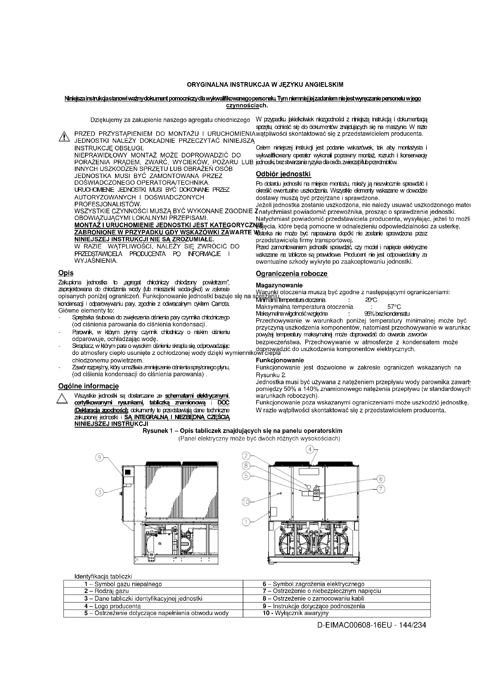 ) wykorzystuje się do określenia częstotliwości konserwacji. Należy postępować zgodnie z odpowiednimi przepisami. Wzór na obliczanie emisji gazów cieplarnianych: wartość GWP czynnika chłodniczego x całkowity ładunek czynnika chłodniczego (w kg)/1000 Należy wykorzystać wartość GWP podaną na etykiecie dotyczącej gazów cieplarnianych. Wartość ta jest określona na podstawie 4. raportu z oceny IPCC. Wartość GWP podana w instrukcji może być przestarzała (tzn. oparta na 3. raporcie z oceny IPCC).D-EIMAC00608-16EU - 152/234 Po dodatkowe informacje skontaktować się ze sprzedawcą. Utylizacja Jednostka jest wykonana z metalowych, plastikowych i elektronicznych elementów. Wszystkie te części muszą być zutylizowane zgodnie z obowiązującymi w tej dziedzinie lokalnymi przepisami. Baterie ołowiowe należy zebrać i przekazać do odpowiedniego centrum zbiórki odpadów. Olej musi być zgromadzony i przesłany do odpowiedniego centrum zbiórki odpadów.