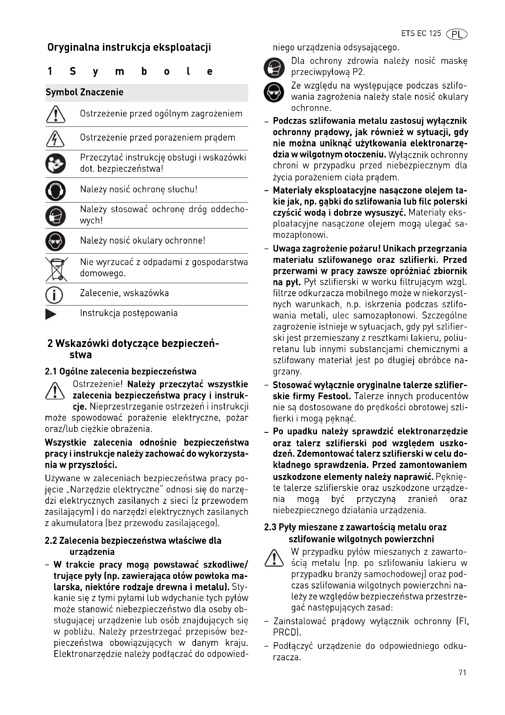 szlifowanie wilgotnych powierzchni W przypadku pyłów mieszanych z zawarto- ścią metalu (np. po szlifowaniu lakieru w przypadku branży samochodowej) oraz pod- czas szlifowania wilgotnych powierzchni na- leży ze względów bezpieczeństwa przestrze- gać następujących zasad: – Zainstalować prądowy wyłącznik ochronny (FI, PRCD). – Podłączyć urządzenie do odpowiedniego odku- rzacza. Symbol Znaczenie Ostrzeżenie przed ogólnym zagrożeniem Ostrzeżenie przed porażeniem prądem Przeczytać instrukcję obsługi i wskazówki dot. bezpieczeństwa! Należy nosić ochronę słuchu! Należy stosować ochronę dróg oddecho- wych! Należy nosić okulary ochronne! Nie wyrzucać z odpadami z gospodarstwa domowego. Zalecenie, wskazówka Instrukcja postępowania72 ETS EC 125