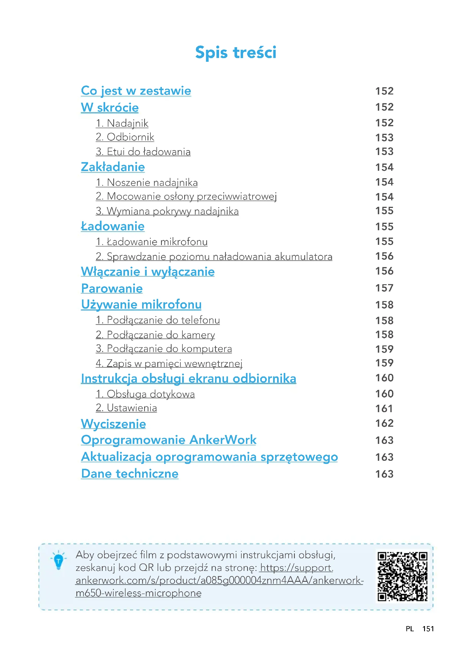 Wyciszenie Oprogramowanie AnkerWork Aktualizacja oprogramowania sprzętowego Dane techniczne Aby obejrzeć lm z podstawowymi instrukcjami obsługi, zeskanuj kod QR lub przejdź na stronę: https://support. ankerwork.com/s/product/a085g000004znm4AAA/ankerwork- m650-wireless-microphone Spis treści
