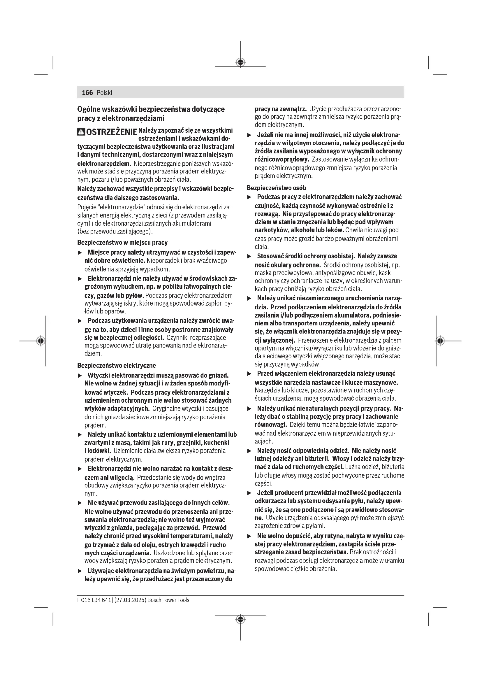 Karasoku Mahallesi 28028. Sokak No:20/A Merkez / ADANA Tel.: +903223599710 -3521379 Fax: +903223591323 E-mail: isiklar@isiklarelektrik.com Servis adreslerimiz ve tamir servisi ile yedek parça siparişi bağlantılarımızı www.bosch-pt.com/serviceaddresses adresinde bulabilirsiniz. Bütün başvuru ve yedek parça siparişlerinizde ürünün tip etiketi üzerindeki 10 haneli malzeme numarasını mutlaka belirtin. Tasfiye Ürünler, aküler, aksesuar ve ambalaj malzemesi çevre dostu yeniden kazanım merkezine gönderilmek zorundadır. ürünleri ve aküleri/bataryaları evsel çöplerin içine atmayın! Sadece AB üyesi ülkeler için: 2012/19/EU yönetmeliği uyarınca kullanım ömrünü tamamlamış ürünler ve 2006/66/EC yönetmeliği uyarınca arızalı veya kullanım ömrünü tamamlamış aküler/ bataryalar ayrı ayrı toplanmak ve çevre dostu tasfiye için bir geri dönüşüm merkezine gönderilmek zorundadır. Atık elektrikli ve elektronik ekipmanlar, uygunsuz şekilde bertaraf edildikleri takdirde, olası tehlikeli maddelerin varlığı nedeniyle çevre ve insan sağlığı üzerinde zararlı etkilere yol açabilir. Polski Wskazówki bezpieczeństwa Opis symboli obrazkowych Przed przystąpieniem do pracy należy przeczy- tać niniejszą instrukcję eksploatacji. Ogólna wskazówka ostrzegająca przed poten- cjalnym zagrożeniem. Nie stosować podczas deszczu. Stosuj środki ochrony indywidualnej, okulary ochronne, zabezpieczenie słuchu i kask ochronny. Stosuj rękawice ochronne. OSTRZEŻENIE: Przed przystąpieniem do prac konserwacyjnych należy odciąć zasilanie aku- mulatorem. Bosch Power Tools F 016 L94 641 | (27.03.2025)166 | Polski Ogólne wskazówki bezpieczeństwa dotyczące pracy z elektronarzędziami OSTRZEŻENIE Należy zapoznać się ze wszystkimi ostrzeżeniami i wskazówkami do- tyczącymi bezpieczeństwa użytkowania oraz ilustracjami i danymi technicznymi, dostarczonymi wraz z niniejszym elektronarzędziem. Nieprzestrzeganie poniższych wskazó- wek może stać się przyczyną porażenia prądem elektrycz- nym, pożaru i/lub poważnych obrażeń ciała. Należy zachować wszystkie przepisy i wskazówki bezpie- czeństwa dla dalszego zastosowania. Pojęcie "elektronarzędzie" odnosi się do elektronarzędzi za- silanych energią elektryczną z sieci (z przewodem zasilają- cym) i do elektronarzędzi zasilanych akumulatorami (bezprzewodu zasilającego). Bezpieczeństwo w miejscu pracy u Miejsce pracy należy utrzymywać w czystości i zapew- nić dobre oświetlenie. Nieporządek i brak właściwego oświetlenia sprzyjają wypadkom. u Elektronarzędzi nie należy używać w środowiskach za- grożonym wybuchem, np. w pobliżu łatwopalnych cie- czy, gazów lub pyłów. Podczas pracy elektronarzędziem wytwarzają się iskry, które mogą spowodować zapłon py- łów lub oparów. u Podczas użytkowania urządzenia należy zwrócić uwa- gę na to, aby dzieci i inne osoby postronne znajdowały się w bezpiecznej odległości. Czynniki rozpraszające mogą spowodować utratę panowania nad elektronarzę- dziem. Bezpieczeństwo elektryczne u Wtyczki elektronarzędzi muszą pasować do gniazd. Nie wolno w żadnej sytuacji i w żaden sposób modyfi- kować wtyczek. Podczas pracy elektronarzędziami z uziemieniem ochronnym nie wolno stosować żadnych wtyków adaptacyjnych. Oryginalne wtyczki i pasujące do nich gniazda sieciowe zmniejszają ryzyko porażenia prądem. u Należy unikać kontaktu z uziemionymi elementami lub zwartymi z masą, takimi jak rury, grzejniki, kuchenki ilodówki. Uziemienie ciała zwiększa ryzyko porażenia prądem elektrycznym. u Elektronarzędzi nie wolno narażać na kontakt z desz- czem ani wilgocią. Przedostanie się wody do wnętrza obudowy zwiększa ryzyko porażenia prądem elektrycz- nym. u Nie używać przewodu zasilającego do innych celów. Nie wolno używać przewodu do przenoszenia ani prze- suwania elektronarzędzia; nie wolno też wyjmować wtyczki z gniazda, pociągając za przewód. Przewód należy chronić przed wysokimi temperaturami, należy go trzymać zdala od oleju, ostrych krawędzi i rucho- mych części urządzenia. Uszkodzone lub splątane prze- wody zwiększają ryzyko porażenia prądem elektrycznym. u Używając elektronarzędzia na świeżym powietrzu, na- leży upewnić się, że przedłużacz jest przeznaczony do pracy na zewnątrz. Użycie przedłużacza przeznaczone- go do pracy na zewnątrz zmniejsza ryzyko porażenia prą- dem elektrycznym. u Jeżeli nie ma innej możliwości, niż użycie elektrona- rzędzia w wilgotnym otoczeniu, należy podłączyć je do źródła zasilania wyposażonego w wyłącznik ochronny różnicowoprądowy. Zastosowanie wyłącznika ochron- nego różnicowoprądowego zmniejsza ryzyko porażenia prądem elektrycznym. Bezpieczeństwo osób u Podczas pracy z elektronarzędziem należy zachować czujność, każdą czynność wykonywać ostrożnie i z rozwagą. Nie przystępować do pracy elektronarzę- dziem w stanie zmęczenia lub będąc pod wpływem narkotyków, alkoholu lub leków. Chwila nieuwagi pod- czas pracy może grozić bardzo poważnymi obrażeniami ciała. u Stosować środki ochrony osobistej. Należy zawsze nosić okulary ochronne. Środki ochrony osobistej, np. maska przeciwpyłowa, antypoślizgowe obuwie, kask ochronny czy ochraniacze na uszy, w określonych warun- kach pracy obniżają ryzyko obrażeń ciała. u Należy unikać niezamierzonego uruchomienia narzę- dzia. Przed podłączeniem elektronarzędzia do źródła zasilania i/lub podłączeniem akumulatora, podniesie- niem albo transportem urządzenia, należy upewnić się, że włącznik elektronarzędzia znajduje się w pozy- cji wyłączonej. Przenoszenie elektronarzędzia z palcem opartym na włączniku/wyłączniku lub włożenie do gniaz- da sieciowego wtyczki włączonego narzędzia, może stać się przyczyną wypadków. u Przed włączeniem elektronarzędzia należy usunąć wszystkie narz