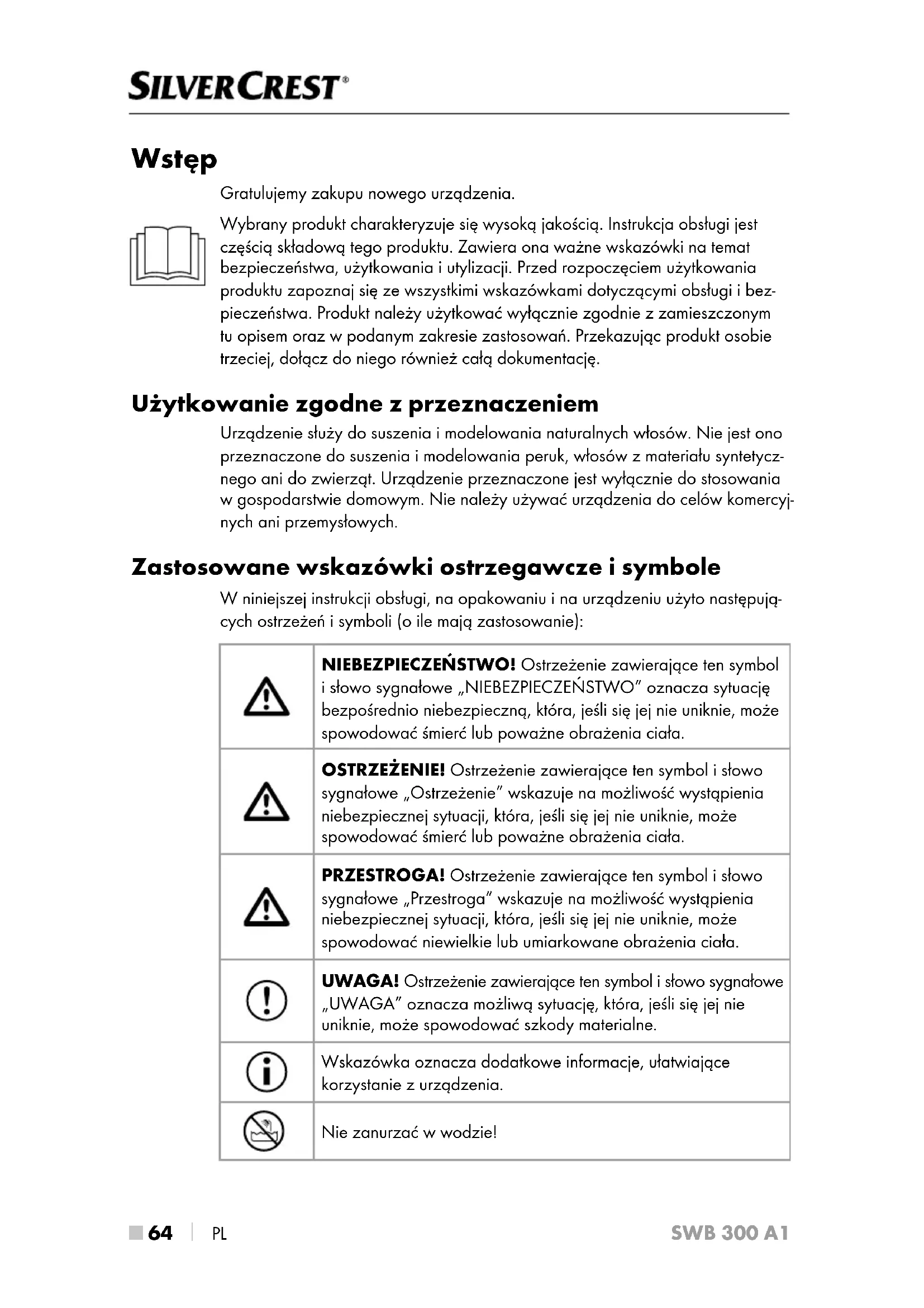 PL SWB 300 A1 Wstęp Gratulujemy zakupu nowego urządzenia. Wybrany produkt charakteryzuje się wysoką jakością. Instrukcja obsługi jest częścią składową tego produktu. Zawiera ona ważne wskazówki na temat bezpieczeństwa, użytkowania iutylizacji. Przed rozpoczęciem użytkowania produktu zapoznaj się ze wszystkimi wskazówkami dotyczącymi obsługi ibez- pieczeństwa. Produkt należy użytkować wyłącznie zgodnie zzamieszczonym tu opisem oraz wpodanym zakresie zastosowań. Przekazując produkt osobie trzeciej, dołącz do niego również całą dokumentację. Użytkowanie zgodne zprzeznaczeniem Urządzenie służy do suszenia i modelowania naturalnych włosów. Nie jest ono przeznaczone do suszenia i modelowania peruk, włosów z materiału syntetycz- nego ani do zwierząt. Urządzenie przeznaczone jest wyłącznie do stosowania wgospodarstwie domowym. Nie należy używać urządzenia do celów komercyj- nych ani przemysłowych. Zastosowane wskazówki ostrzegawcze isymbole W niniejszej instrukcji obsługi, na opakowaniu i na urządzeniu użyto następują- cych ostrzeżeń i symboli (oile mają zastosowanie): NIEBEZPIECZEŃSTWO! Ostrzeżenie zawierające ten symbol i słowo sygnałowe „NIEBEZPIECZEŃSTWO” oznacza sytuację bezpośrednio niebezpieczną, która, jeśli się jej nie uniknie, może spowodować śmierć lub poważne obrażenia ciała. OSTRZEŻENIE! Ostrzeżenie zawierające ten symbol i słowo sygnałowe „Ostrzeżenie” wskazuje na możliwość wystąpienia niebezpiecznej sytuacji, która, jeśli się jej nie uniknie, może spowodować śmierć lub poważne obrażenia ciała. PRZESTROGA! Ostrzeżenie zawierające ten symbol i słowo sygnałowe „Przestroga” wskazuje na możliwość wystąpienia niebezpiecznej sytuacji, która, jeśli się jej nie uniknie, może spowodować niewielkie lub umiarkowane obrażenia ciała. UWAGA! Ostrzeżenie zawierające ten symbol i słowo sygnałowe „UWAGA” oznacza możliwą sytuację, która, jeśli się jej nie uniknie, może spowodować szkody materialne. Wskazówka oznacza dodatkowe informacje, ułatwiające korzystanie zurządzenia. Nie zanurzać w wodzie!PL