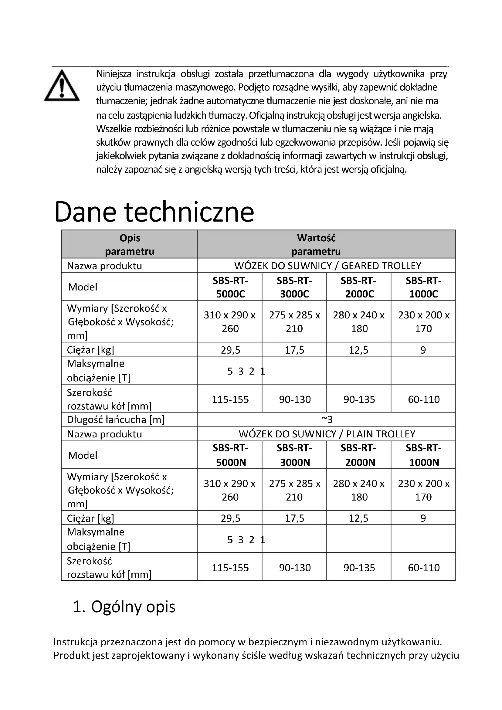 - Dolna część łańcucha powinna znajdować się na wysokości 100-500 mm od podłoża (tylko się tylko modeli z własnym napędem łańcuchowym: SBS-RT-5000C, SBS-RT-3000C, SBS-RT-2000C, SBS-RT-1000C). UWAGA: Przed pierwszym użyciem po zmontowaniu urządzenia należy zweryfikować jego działanie poprzez zawieszenie lekkiego ładunku i przetoczenie urządzenia wzdłuż szyny. 3.3. Czyszczenie i konserwacja a) Odczekać aż wirujące elementy zatrzymają się. b) Do czyszczenia powierzchni należy stosować wyłącznie środki niezawierające substancji żrących. c) Po każdym czyszczeniu wszystkie elementy należy dobrze wysuszyć, zanim urządzenie zostanie ponownie użyte. d) Urządzenie należy przechowywać w suchym i chłodnym miejscu chronionym przed wilgocią i bezpośrednim promieniowaniem słonecznym. e) Zabrania się spryskiwania urządzenia strumieniem wody lub zanurzania urządzenia w wodzie. f) Należy wykonywać regularne przeglądy urządzenia pod kątem jego sprawności technicznej oraz wszelkich uszkodzeń. g) Łożysko i powierzchnia toru (a także przekładnia w modelach SBS-RT-5000C / SBS-RT-3000C / SBS-RT-2000C / SBS-RT-1000C) powinny być okresowo konserwowane smarem. h) Upewnić się, że urządzenie jest utrzymywane w czystości, a części ruchome są nasmarowane.Technické údaje Popis parametru Hodnota parametru Název výrobku Postrkový pojezd Model SBS-RT- 5000C SBS-RT- 3000C SBS-RT- 2000C SBS-RT- 1000C Rozměry (šířka x hloubka x výška) [mm] 310 x 290 x