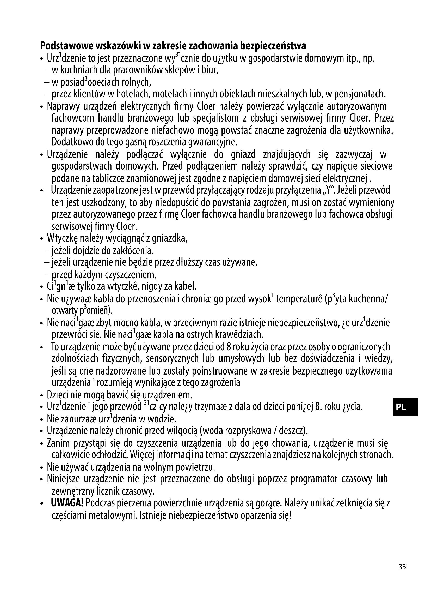 - Urządzenie zaopatrzone jest w przewód przyłączający rodzaju przyłączenia „Y“. Jeżeli przewód ten jest uszkodzony, to aby niedopuścić do powstania zagrożeń, musi on zostać wymieniony przez autoryzowanego przez firmę Cloer fachowca handlu branżowego lub fachowca obsługi serwisowej firmy Cloer.