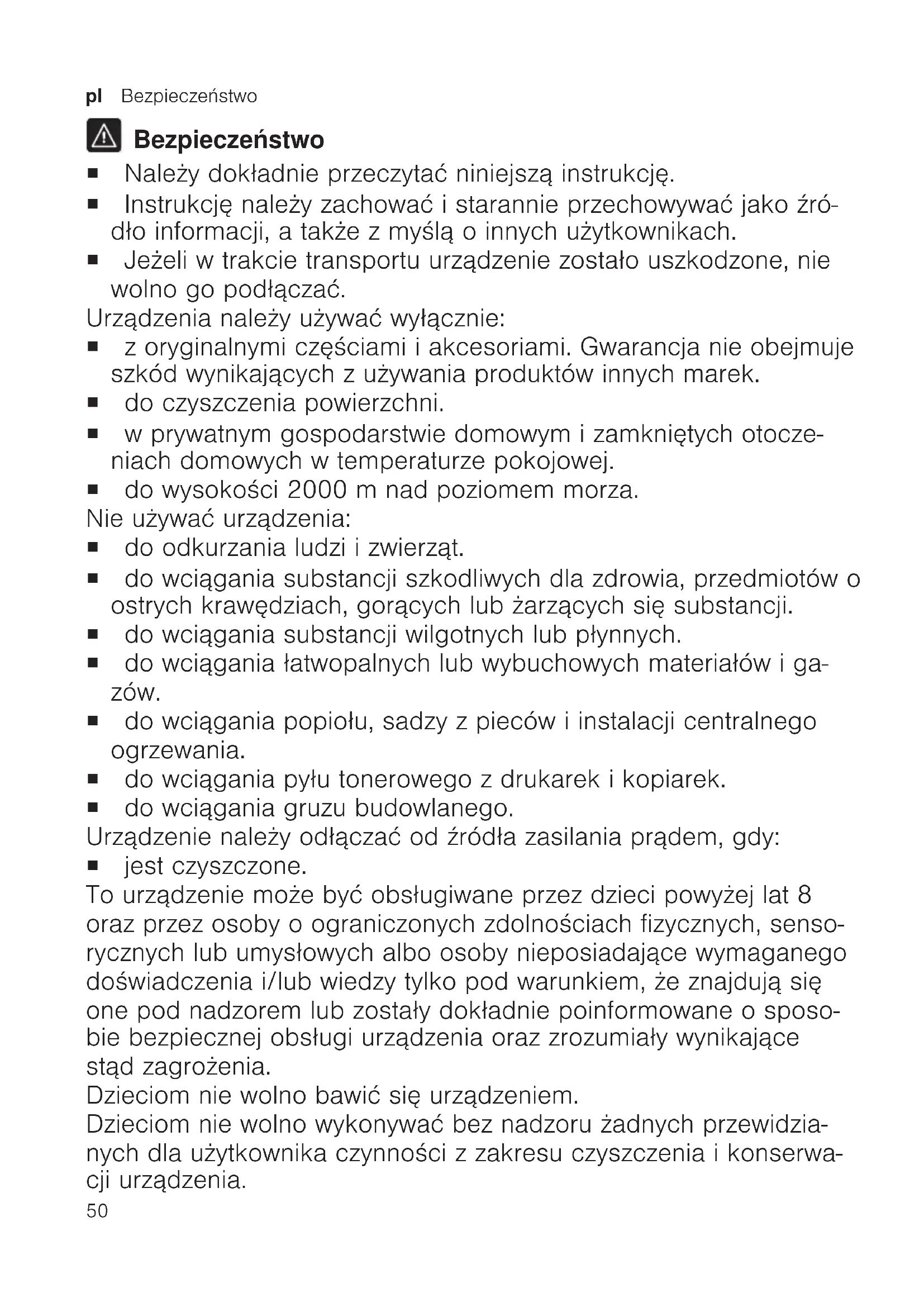Bezpieczeństwo ¡ Należy dokładnie przeczytać niniejszą instrukcję. ¡ Instrukcję należy zachować i starannie przechowywać jako źró- dło informacji, a także z myślą o innych użytkownikach. ¡ Jeżeli w trakcie transportu urządzenie zostało uszkodzone, nie wolno go podłączać. Urządzenia należy używać wyłącznie: ¡ zoryginalnymi częściami iakcesoriami. Gwarancja nie obejmuje szkód wynikających z używania produktów innych marek. ¡ do czyszczenia powierzchni. ¡ w prywatnym gospodarstwie domowym i zamkniętych otocze- niach domowych w temperaturze pokojowej. ¡ do wysokości 2000m nad poziomem morza. Nie używać urządzenia: ¡ do odkurzania ludzi i zwierząt. ¡ do wciągania substancji szkodliwych dla zdrowia, przedmiotów o ostrych krawędziach, gorących lub żarzących się substancji. ¡ do wciągania substancji wilgotnych lub płynnych. ¡ do wciągania łatwopalnych lub wybuchowych materiałów i ga- zów. ¡ do wciągania popiołu, sadzy z pieców i instalacji centralnego ogrzewania. ¡ do wciągania pyłu tonerowego z drukarek i kopiarek. ¡ do wciągania gruzu budowlanego. Urządzenie należy odłączać od źródła zasilania prądem, gdy: ¡ jest czyszczone. To urządzenie może być obsługiwane przez dzieci powyżej lat 8 oraz przez osoby oograniczonych zdolnościach fizycznych, senso- rycznych lub umysłowych albo osoby nieposiadające wymaganego doświadczenia i/lub wiedzy tylko pod warunkiem, że znajdują się one pod nadzorem lub zostały dokładnie poinformowane o sposo- bie bezpiecznej obsługi urządzenia oraz zrozumiały wynikające stąd zagrożenia. Dzieciom nie wolno bawić się urządzeniem. Dzieciom nie wolno wykonywać bez nadzoru żadnych przewidzia- nych dla użytkownika czynności z zakresu czyszczenia i konserwa- cji urządzenia.Bezpieczeństwo pl