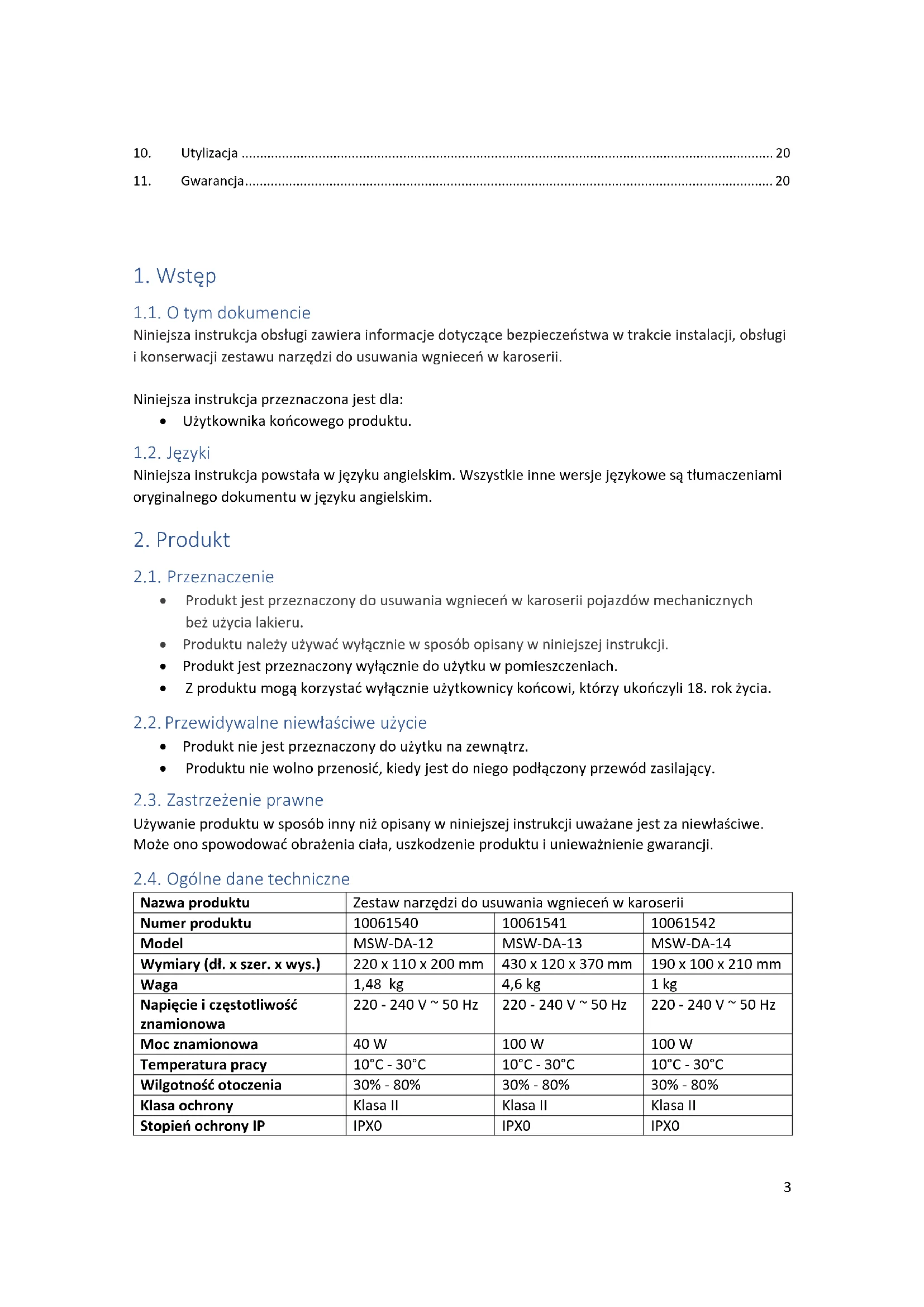 - Produktu nie wolno przenosić, kiedy jest do niego podłączony przewód zasilający. 2.3. Zastrzeżenie prawne Używanie produktu w sposób inny niż opisany w niniejszej instrukcji uważane jest za niewłaściwe. Może ono spowodować obrażenia ciała, uszkodzenie produktu i unieważnienie gwarancji. 2.4. Ogólne dane techniczne Nazwa produktu Zestaw narzędzi do usuwania wgnieceń w karoserii Numer produktu