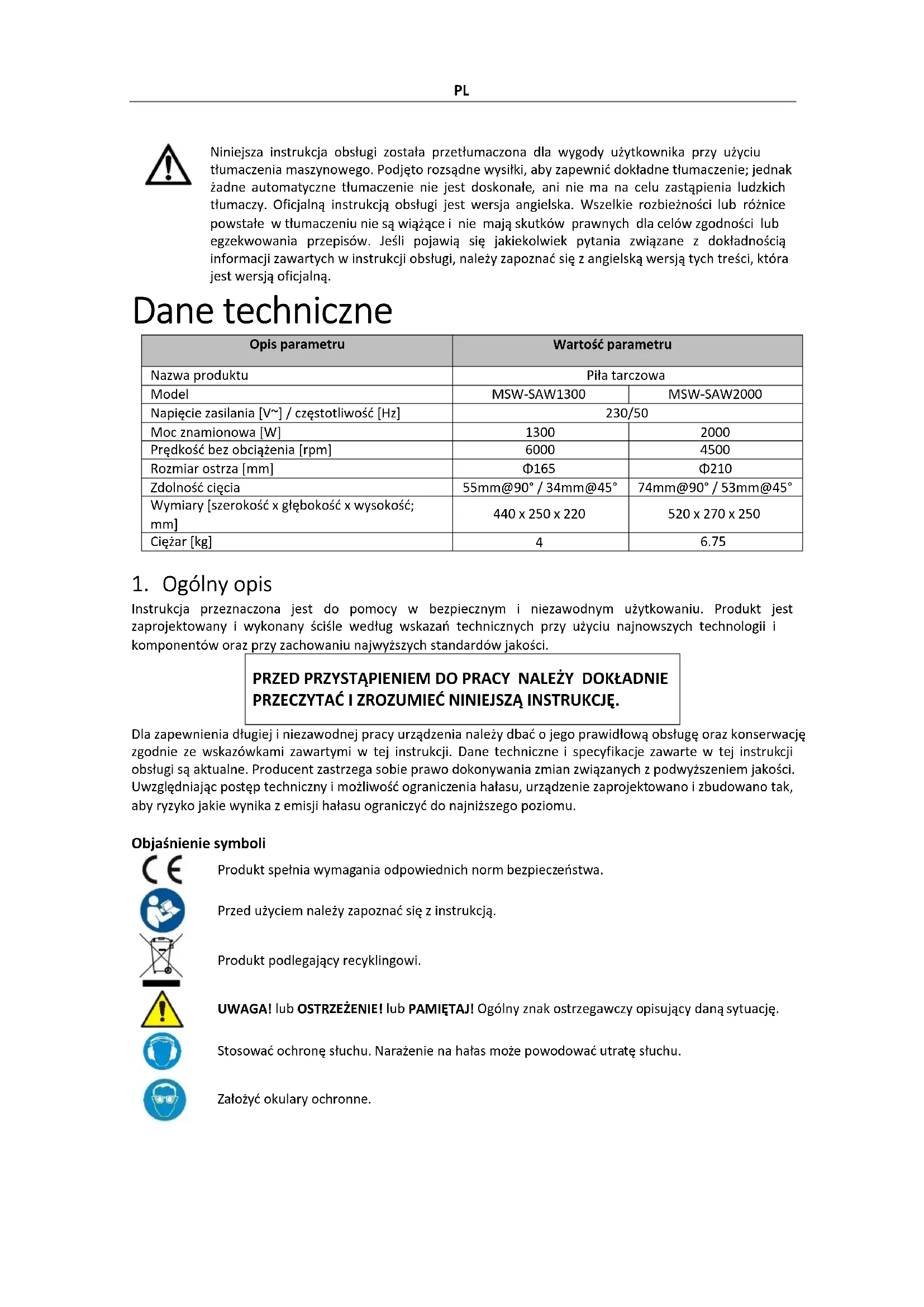 Niniejsza instrukcja obsługi została przetłumaczona dla wygody użytkownika przy użyciu tłumaczenia maszynowego. Podjęto rozsądne wysiłki, aby zapewnić dokładne tłumaczenie; jednak żadne automatyczne tłumaczenie nie jest doskonałe, ani nie ma na celu zastąpienia ludzkich tłumaczy. Oficjalną instrukcją obsługi jest wersja angielska. Wszelkie rozbieżności lub różnice powstałe w tłumaczeniu nie są wiążące i nie mają skutków prawnych dla celów zgodności lub egzekwowania przepisów. Jeśli pojawią się jakiekolwiek pytania związane z dokładnością informacji zawartych w instrukcji obsługi, należy zapoznać się z angielską wersją tych treści, która jest wersją oficjalną. Dane techniczne Opis parametru Wartość parametru Nazwa produktu Piła tarczowa Model MSW-SAW1300 MSW-SAW2000 Napięcie zasilania [V~] / częstotliwość [Hz] 230/50 Moc znamionowa [W]