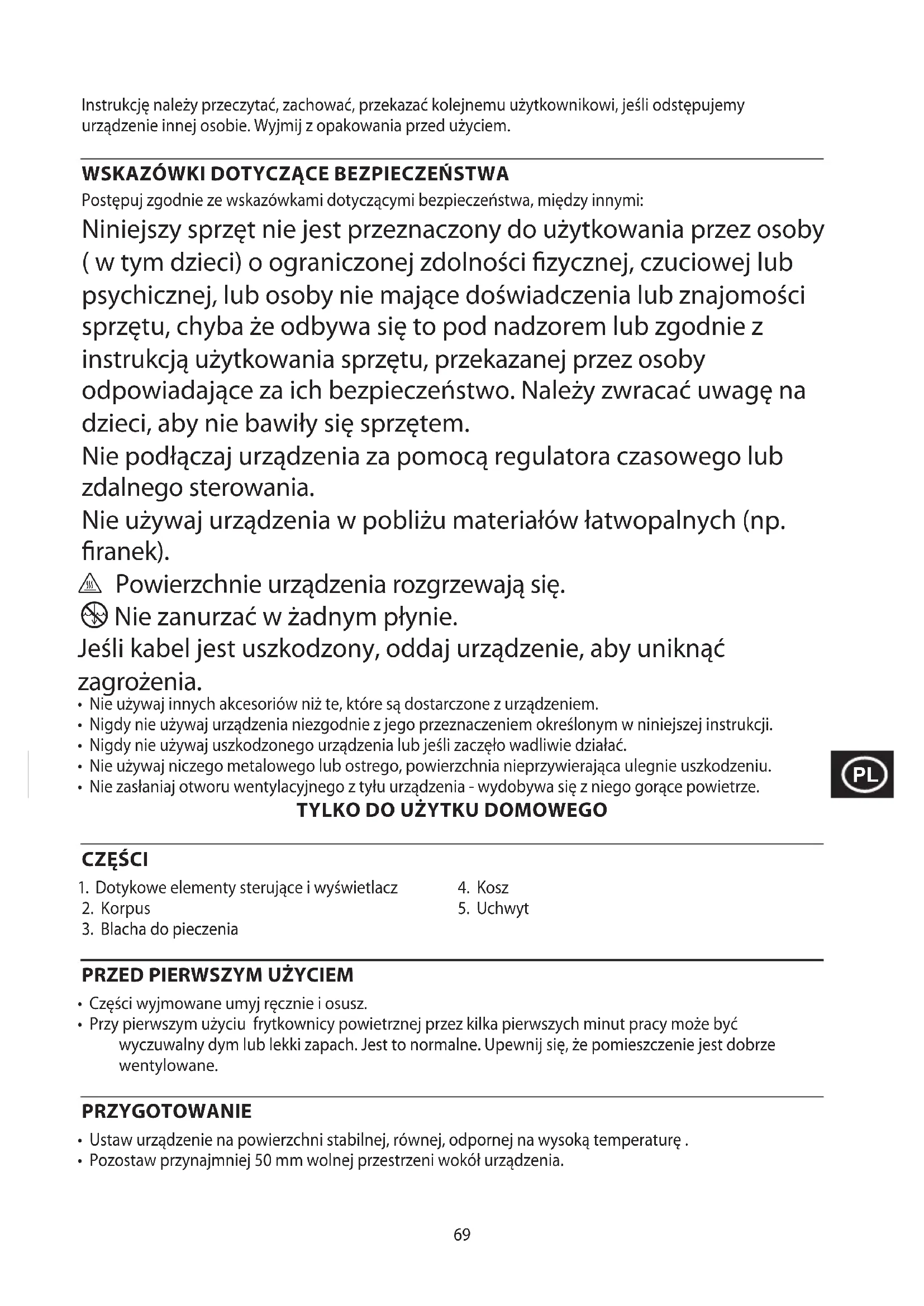 - Przy pierwszym użyciu frytkownicy powietrznej przez kilka pierwszych minut pracy może być wyczuwalny dym lub lekki zapach. Jest to normalne. Upewnij się, że pomieszczenie jest dobrze wentylowane. PRZYGOTOWANIE