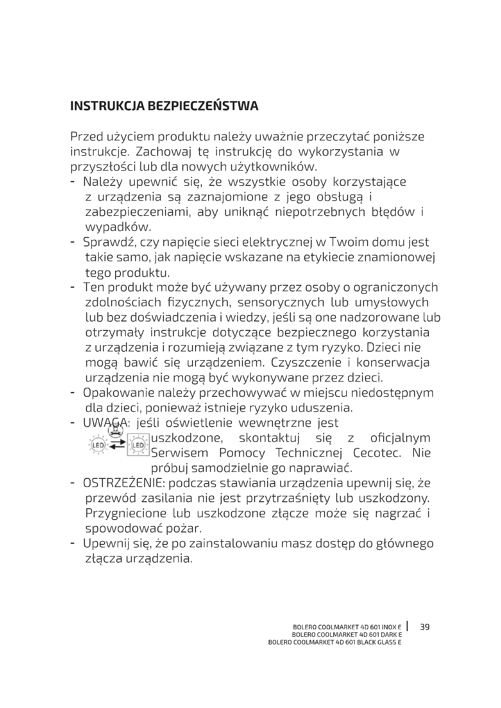 Przed użyciem produktu należy uważnie przeczytać poniższe instrukcje. Zachowaj tę instrukcję do wykorzystania w przyszłości lub dla nowych użytkowników. - Należy upewnić się, że wszystkie osoby korzystające z urządzenia są zaznajomione z jego obsługą i zabezpieczeniami, aby uniknąć niepotrzebnych błędów i wypadków. - Sprawdź, czy napięcie sieci elektrycznej w Twoim domu jest takie samo, jak napięcie wskazane na etykiecie znamionowej tego produktu. - Ten produkt może być używany przez osoby o ograniczonych zdolnościach zycznych, sensorycznych lub umysłowych lub bez doświadczenia i wiedzy, jeśli są one nadzorowane lub otrzymały instrukcje dotyczące bezpiecznego korzystania z urządzenia i rozumieją związane z tym ryzyko. Dzieci nie mogą bawić się urządzeniem. Czyszczenie i konserwacja urządzenia nie mogą być wykonywane przez dzieci. - Opakowanie należy przechowywać w miejscu niedostępnym dla dzieci, ponieważ istnieje ryzyko uduszenia. - UWAGA: jeśli oświetlenie wewnętrzne jest uszkodzone, skontaktuj się z ocjalnym Serwisem Pomocy Technicznej Cecotec. Nie próbuj samodzielnie go naprawiać. - OSTRZEŻENIE: podczas stawiania urządzenia upewnij się, że przewód zasilania nie jest przytrzaśnięty lub uszkodzony. Przygniecione lub uszkodzone złącze może się nagrzać i spowodować pożar. - Upewnij się, że po zainstalowaniu masz dostęp do głównego złącza urządzenia.40