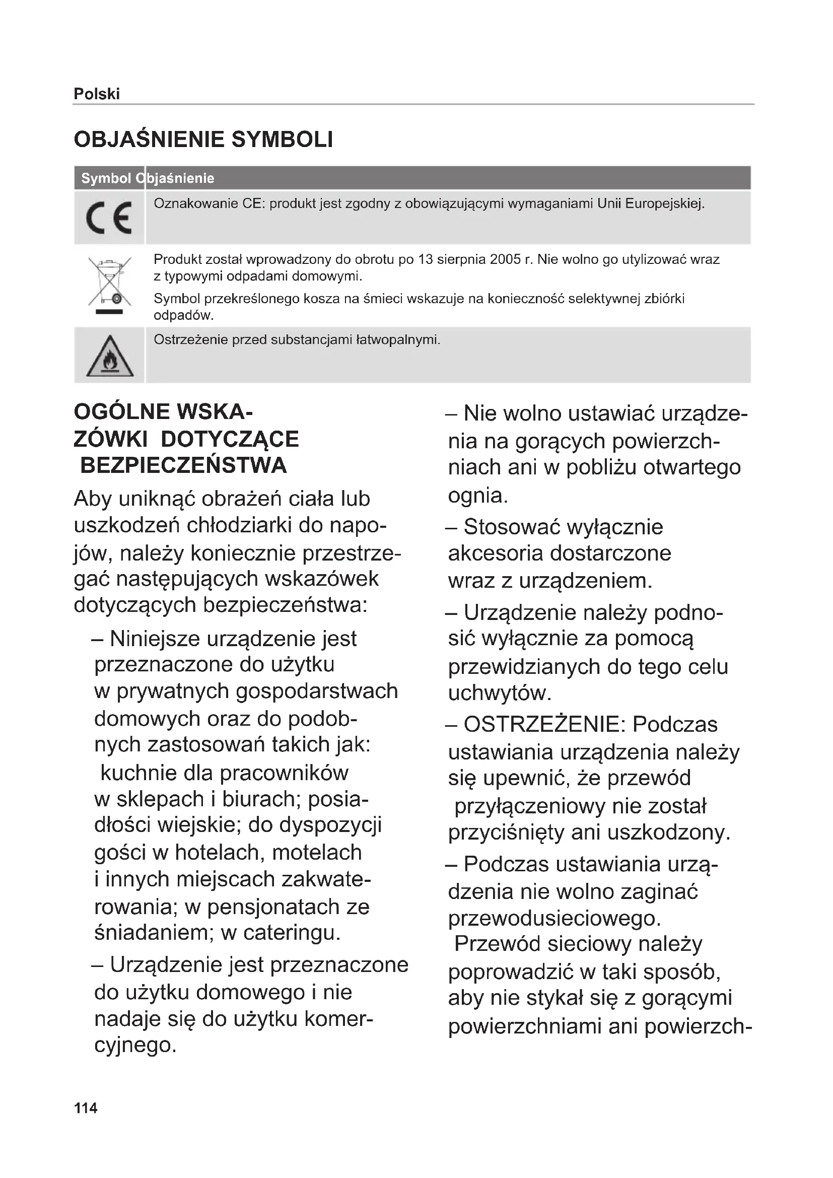 BEZPIECZEŃSTWA Aby uniknąć obrażeń ciała lub uszkodzeń chłodziarki do napo- jów, należy koniecznie przestrze- gać następujących wskazówek dotyczących bezpieczeństwa: – Niniejsze urządzenie jest przeznaczone do użytku w prywatnych gospodarstwach domowych oraz do podob- nych zastosowań takich jak: kuchnie dla pracowników w sklepach i biurach; posia- dłości wiejskie; do dyspozycji gości w hotelach, motelach i innych miejscach zakwate- rowania; w pensjonatach ze śniadaniem; w cateringu. – Urządzenie jest przeznaczone do użytku domowego i nie nadaje się do użytku komer- cyjnego. – Nie wolno ustawiać urządze- nia na gorących powierzch- niach ani w pobliżu otwartego ognia. – Stosować wyłącznie akcesoria dostarczone wraz z urządzeniem. – Urządzenie należy podno- sić wyłącznie za pomocą przewidzianych do tego celu uchwytów. – OSTRZEŻENIE: Podczas ustawiania urządzenia należy się upewnić, że przewód przyłączeniowy nie został przyciśnięty ani uszkodzony. – Podczas ustawiania urzą- dzenia nie wolno zaginać przewodu sieciowego. Przewód sieciowy należy poprowadzić w taki sposób, aby nie stykał się z gorącymi powierzchniami ani powierzch-115 niami mającymi ostre krawędzie. Zwrócić uwagę, aby przewód sieciowy nie zwisał poza krawędź blatu. – OSTRZEŻENIE: Nie należy umieszczać przenośnych listew zasilających ani zasila- czy z tyłu urządzeń. – OSTRZEŻENIE: Nie wolno zamykać otworów wentylacyj- nych w obudowie urządzenia ani w obudowie instalacyjnej. – Podczas ustawiania urządze- nia należy zapewnić odpo- wiedni odstęp ok. 5 cm od otaczających ścian lub innych elementów ograniczających. – Urządzenie może być użyt- kowane wyłącznie po jego bezpiecznym ustawieniu. Po transporcie urządzenie należy pozostawić na co najmniej 12 godzin w jednym miejscu, zanim zostanie uruchomione. – Nie wolno transportować urządzenia w pozycji leżą- cej! Urządzenie musi zawsze znajdować się w pozycji pionowej, nawet jeśli nie jest używane, ponieważ w prze- ciwnym razie może dojść do uszkodzenia obwodu chłodzenia. – Nigdy nie należy otwierać dolnej części urządzenia, w której znajduje się obwód czynnika chłodniczego. – Urządzenie może być uży- wane przez dzieci w wieku od 8 lat, jak również przez osoby o ograniczonych możliwościach zycznych, sensorycznych lub mental- nych, bądź osoby z brakiem doświadczenia lub wiedzy, jeśli mają one zapewniony nadzór lub zostały poinstruowane w zakresie bezpiecznego używania urządzenia i rozu- mieją zagrożenia związane z jego używaniem. – Dzieci nie mogą bawić się urządzeniem. – Dzieci w wieku od 3 do 8 lat mogą załadowywać i rozłado- wywać urządzenie, lecz nie mogą zbliżać się do przewodu przyłączeniowego. – Dzieci mogą czyścić urzą- dzenie i przeprowadzać jego konserwację wyłącznie wtedy, gdy mają więcej niż 8 lat i wykonują te czynności w obecności osoby dorosłej. Polski116 – Będąc poza domem, chło- dziarkę do napojów BEEZER