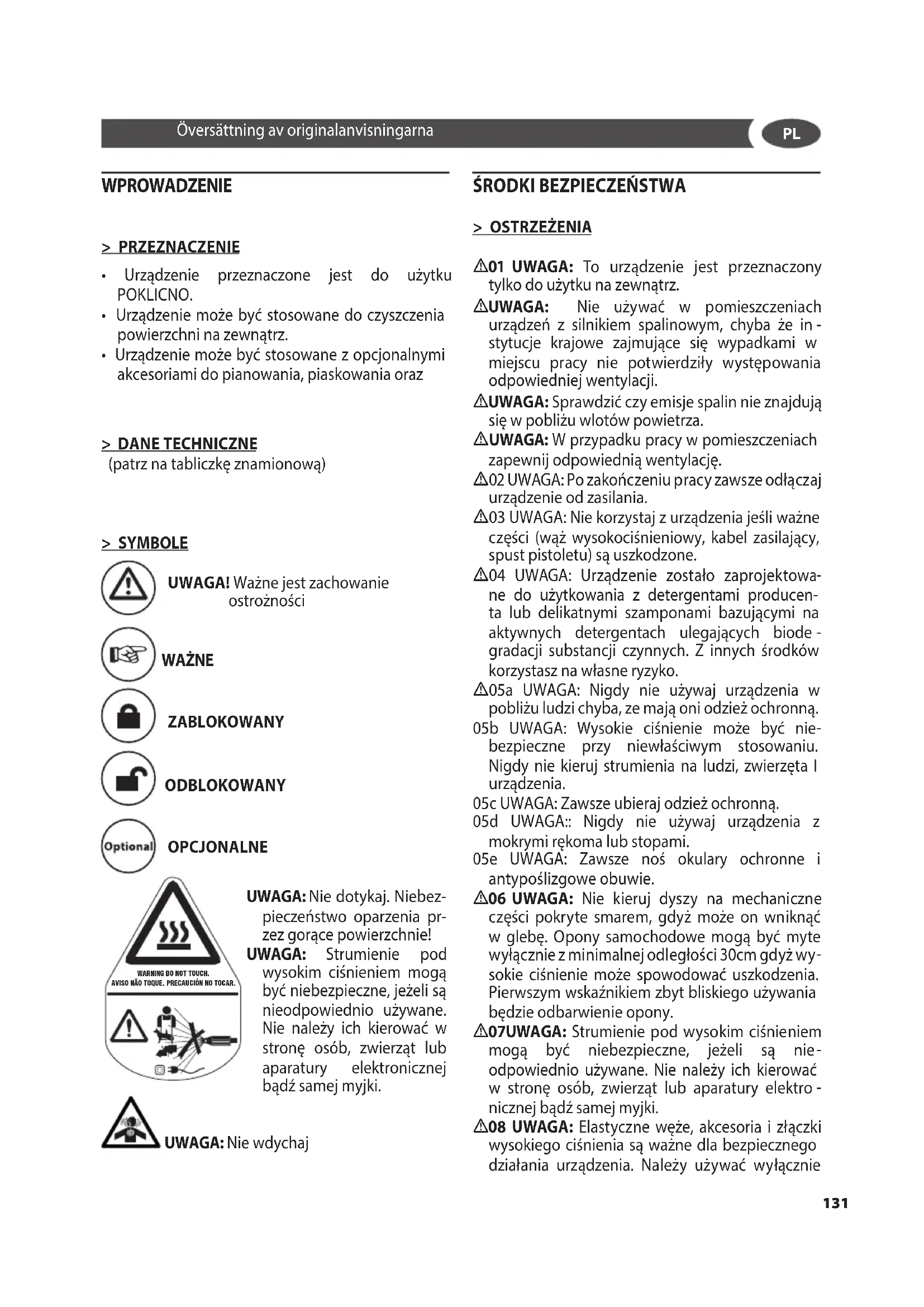 - Urządzenie może być stosowane z opcjonalnymi akcesoriami do pianowania, piaskowania oraz > DANE TECHNICZNE (patrz na tabliczkę znamionową) > SYMBOLE UWAGA! Ważne jest zachowanie ostrożności WAŻNE ZABLOKOWANY ODBLOKOWANY OPCJONALNE WARNING DO NOT TOUCH. AVISO NÃO TOQUE. PRECAUCIÓN NO TOCAR. UWAGA: Nie dotykaj. Niebez- pieczeństwo oparzenia pr- zez gorące powierzchnie! UWAGA: Strumienie pod wysokim ciśnieniem mogą być niebezpieczne, jeżeli są nieodpowiednio używane. Nie należy ich kierować w stronę osób, zwierząt lub aparatury elektronicznej bądź samej myjki. UWAGA: Nie wdychaj