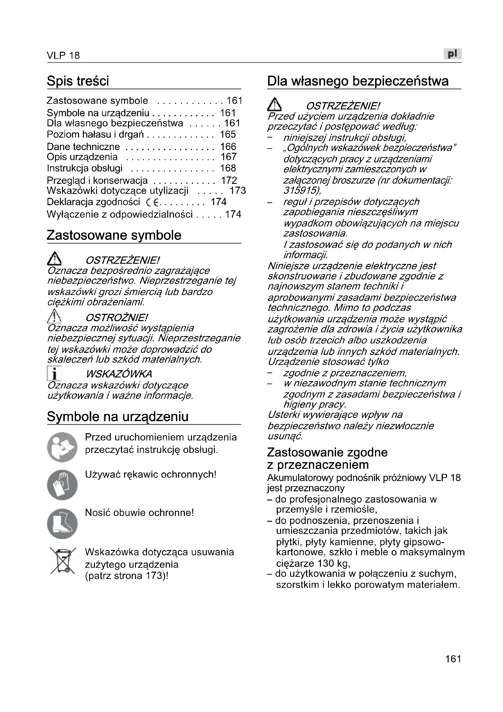 - Wyłączenie z odpowiedzialności Zastosowane symbole OSTRZEŻENIE! Oznacza bezpośrednio zagrażające niebezpieczeństwo. Nieprzestrzeganie tej wskazówki grozi śmiercią lub bardzo ciężkimi obrażeniami. OSTROŻNIE! Oznacza możliwość wystąpienia niebezpiecznej sytuacji. Nieprzestrzeganie tej wskazówki może doprowadzić do skaleczeń lub szkód materialnych. WSKAZÓWKA Oznacza wskazówki dotyczące użytkowania i ważne informacje. Symbole na urządzeniu Przed uruchomieniem urządzenia przeczytać instrukcję obsługi. Używać rękawic ochronnych! Nosić obuwie ochronne! Wskazówka dotycząca usuwania zużytego urządzenia (patrz strona 173)! Dla własnego bezpieczeństwa OSTRZEŻENIE! Przed użyciem urządzenia dokładnie przeczytać i postępować według: p. 174