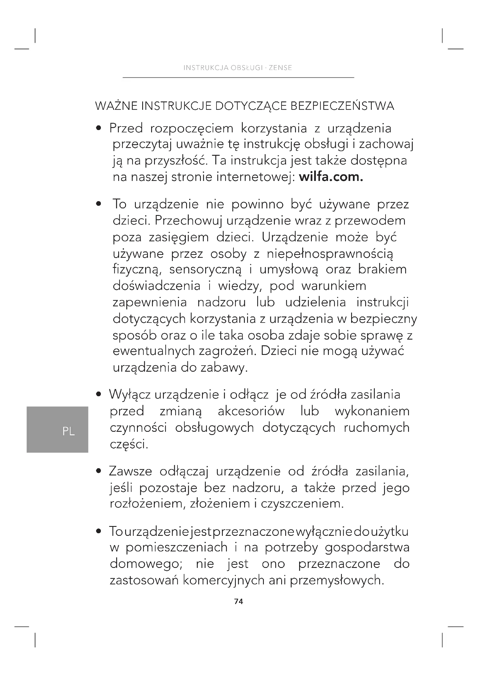 - Przed rozpoczęciem korzystania z urządzenia przeczytaj uważnie tę instrukcję obsługi i zachowaj ją na przyszłość. Ta instrukcja jest także dostępna na naszej stronie internetowej: wilfa.com.