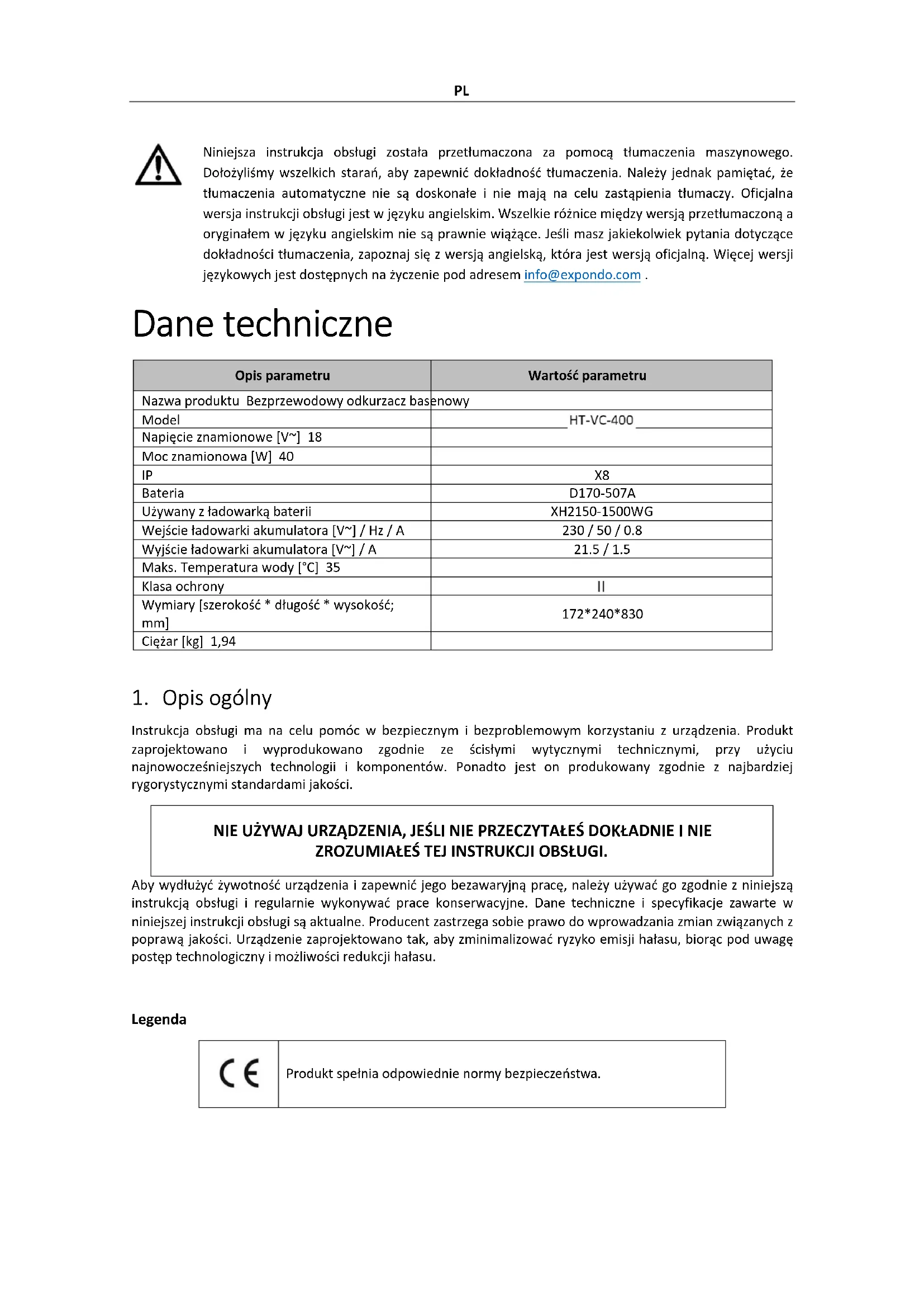 Disposing of used devices Do not dispose of this device in municipal waste systems. Hand it over to an electric and electrical device recycling and collection point. Check the symbol on the product, instruction manual, and packaging. The plastics used to construct the device can be recycled following their markings. By choosing to recycle you are making a significant contribution to the protection of our environment. Contact local authorities for information on your local recycling facility. 2.5. Troubleshooting In most cases, you will be able to troubleshoot problems easily by yourself. Problem Possible cause Solution Fail to clean the waste. The battery runs out. Recharge the product, and it can work for 50-60 minutes after being fully charged. The impeller is damaged. Repair or replace the impeller.EN The impeller is blocked. Turn off the product and check the impeller. The filter bag is full. Clean the waste in the filter bag. Waste gets out from the front parts. Check whether the valve is damaged. Change the check valve. Waste gets out from the filter net. The filter net is damaged. Change the filter net. The handle/extension pole fails to connect. The connective V- Cord is damaged. Change the V-Cord. The product fails to be charged. The battery is damaged. Correspond with the dealer to replace the battery. Warning! To avoid damaging the cleaner, please purchase the original lithium battery to replace it. The charger is damaged. Replace the charger. Warning! To avoid damaging the product caused by the charger, please purchase the original charger to replace it.PL Niniejsza instrukcja obsługi została przetłumaczona za pomocą tłumaczenia maszynowego. Dołożyliśmy wszelkich starań, aby zapewnić dokładność tłumaczenia. Należy jednak pamiętać, że tłumaczenia automatyczne nie są doskonałe i nie mają na celu zastąpienia tłumaczy. Oficjalna wersja instrukcji obsługi jest w języku angielskim. Wszelkie różnice między wersją przetłumaczoną a oryginałem w języku angielskim nie są prawnie wiążące. Jeśli masz jakiekolwiek pytania dotyczące dokładności tłumaczenia, zapoznaj się z wersją angielską, która jest wersją oficjalną. Więcej wersji językowych jest dostępnych na życzenie pod adresem info@expondo.com . Dane techniczne Opis parametru Wartość parametru Nazwa produktu Bezprzewodowy odkurzacz basenowy Model Napięcie znamionowe [V~] 18 Moc znamionowa [W] 40 IP X8 Bateria D170-507A Używany z ładowarką baterii XH2150-1500WG Wejście ładowarki akumulatora [V~] / Hz / A 230 / 50 / 0.8 Wyjście ładowarki akumulatora [V~] / A 21.5 / 1.5 Maks. Temperatura wody [°C] 35 Klasa ochrony Wymiary [szerokość * długość * wysokość; mm] 172*240*830 Ciężar [kg] 1,94