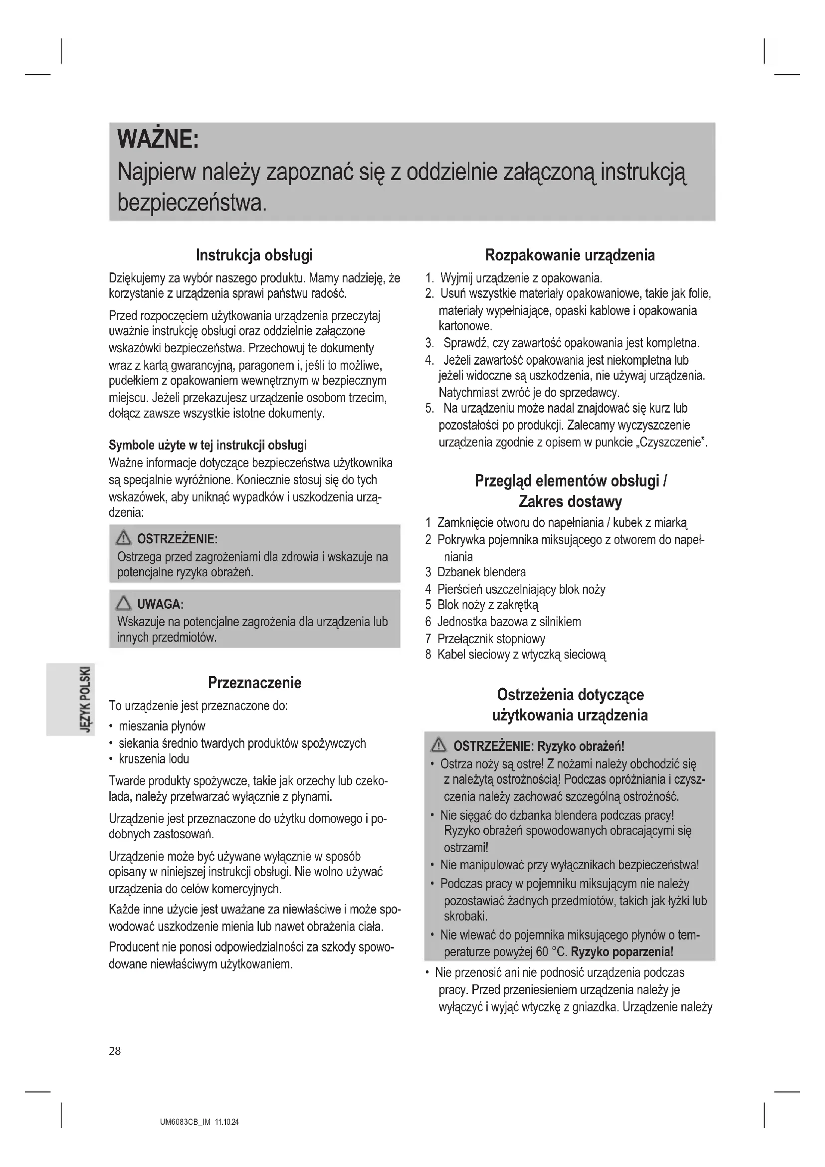 Rozwiązywanie problemów Problem Możliwa przyczyna Środek zaradczy Urządzenie nie działa. Urządzenie nie jest zasilane. Sprawdzić gniazdo sieciowe za pomocą innego urządzenia. Włożyć prawidłowo wtyczkę sieciową. Sprawdzić bezpiecznik domowy. Nieprawidłowa pozycja przełącznika. Sprawdź położenie przełącznika stopniowego. Urządzenie jest wyposażone w wyłącznik bezpieczeństwa. Zapobiega on przypadkowemu uruchomieniu silnika. Sprawdź, czy pojemnik miksujący i pokrywa po- jemnika miksującego są prawidłowo założone. Urządzenie jest uszkodzone. Skontaktuj się z naszym serwisem lub specjalistą. Dane techniczne Model:.................................................................UM 6083 CB Zasilanie: ............................................220 – 240 V~, 50 – 60 Hz Pobór mocy: .................................................................. 500 W Pobór mocy w trybie wyłączenia: ..................................0,1 W Klasa ochronności: ............................................................... Ilość napełnienia: ............................................. maks. 1,5 litra Waga netto: ..............................................................ok. 1,4 kg Zastrzegamy sobie prawo wprowadzania zmian technicz- nych i projektowych w trakcie ciągłego rozwoju produktu. To urządzenie zostało przetestowane zgodnie z wszystkimi obowiązującymi, aktualnymi dyrektywami CE i zbudowane zgodnie z najnowszymi przepisami bezpieczeństwa. Ogólne warunki gwarancji Producent / Dystrybutor udziela 24 miesięcy gwarancji na zakupione urządzenie. Okres gwarancji liczony jest od daty zakupu urządzenia. W tym okresie uszkodzone urządzenie będzie bezpłatnie wymienione na wolne od wad. W przypadku, gdy wymiana będzie niemożliwa do zrealizowania, Nabywca otrzyma zwrot ceny zakupu urządzenia. Za uszkodzone urządzenie uważa się takie, które nie spełnia funkcji określonych w instrukcji obsługi, a przyczyną takiego stanu jest wewnętrzna wada fabryczna lub materiałowa. Gwarancją nie są objęte uszkodzenia mechaniczne, chemiczne, termiczne, powstałe w wyniku działania sił zewnętrznych (np. przepięcie w sieci energetycznej czy wyładowania atmosferyczne), jak również wady powstałe w wyniku obsługi niezgodnej z instrukcją obsługi urządzenia. Nabywcy przysługuje prawo do wymiany urządzenia na wolne od wad lub, jeśli wymiana jest niemożliwa, zwrotu go- tówki tylko po dostarczeniu do punktu zakupu kompletnego urządzenia z oryginalnymi akcesoriami, instrukcją obsługi i w oryginalnym opakowaniu wraz z dowodem zakupu i pra- widłowo wypełnioną kartą gwarancyjną (pieczątka sklepu, data sprzedaży urządzenia). Gwarancja oraz zawarte w niej warunki obowiązują na terenie Rzeczpospolitej Polskiej. Niniejsza gwarancja nie wyłącza, nie ogranicza ani nie zawiesza uprawnień Nabywcy wynikających z przepisów Ustawy z dnia 27 lipca 2002 r. o szczególnych warunkach sprzedaży konsumenckiej oraz o zmianie kodeksu cywil- nego (Dz. U. z 2002 r. Nr 141, poz. 1176). Dystrybutor: CTC Clatronic Sp. z o.o Ul. Brzeska 1 45-960 Opole Usuwanie Znaczenie symbolu „Pojemnik na śmieci” Proszę oszczędzać nasze środowisko, sprzęt elektryczny nie należy do śmieci domowych. Proszę korzystać z punktów zbiorczych, prze- widzianych do zdawania sprzętu elektrycznego, i tam proszę oddawać sprzęt elektryczny, którego już nie będą Państwo używać. Tym sposobem pomagają Państwo unikać potencjalnych następstw niewłaściwego usuwania odpadów, mających wpływ na środowisko i zdrowie ludzi. Tą drogą przyczyniają się Państwo do ponownego użycia, do recyklingu i do innych form wykorzystania starego sprzętu elektrycznego i elektronicznego. Informacje, gdzie można zdać sprzęt, otrzymają Państwo w swoich urzędach komunalnych lub w administracji gminy. Twój sprzedawca i partner umowny jest również zobowią- zany do bezpłatnego odbioru starego urządzenia.UM6083CB_IM 11.10.24