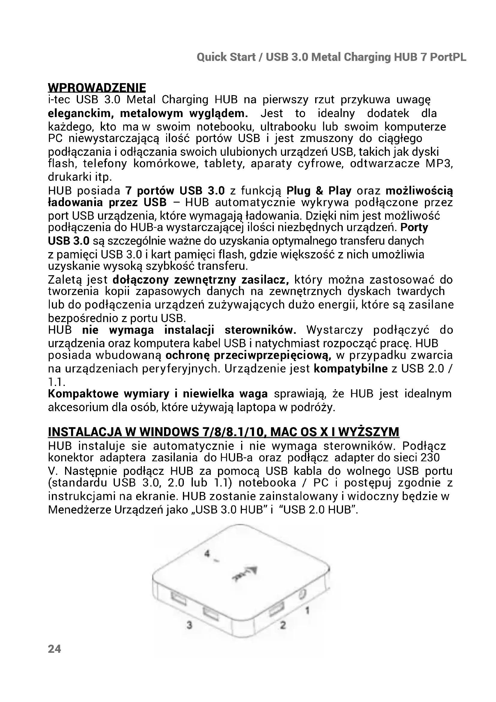 K dispozici na našem webu www.i-tec.cz v záložce „FAQ“ u tohoto produktu.24 Quick Start / USB 3.0 Metal Charging HUB 7 PortPL WPROWADZENIE i-tec USB 3.0 Metal Charging HUB na pierwszy rzut przykuwa uwagę eleganckim, metalowym wyglądem. Jest to idealny dodatek dla każdego, kto ma w swoim notebooku, ultrabooku lub swoim komputerze PC niewystarczającą ilość portów USB i jest zmuszony do ciągłego podłączania i odłączania swoich ulubionych urządzeń USB, takich jak dyski ash, telefony komórkowe, tablety, aparaty cyfrowe, odtwarzacze MP3, drukarki itp. HUB posiada 7 portów USB 3.0 z funkcją Plug & Play oraz możliwością ładowania przez USB – HUB automatycznie wykrywa podłączone przez port USB urządzenia, które wymagają ładowania. Dzięki nim jest możliwość podłączenia do HUB-a wystarczającej ilości niezbędnych urządzeń. Porty USB 3.0 są szczególnie ważne do uzyskania optymalnego transferu danych z pamięci USB 3.0 i kart pamięci ash, gdzie większość z nich umożliwia uzyskanie wysoką szybkość transferu. Zaletą jest dołączony zewnętrzny zasilacz, który można zastosować do tworzenia kopii zapasowych danych na zewnętrznych dyskach twardych lub do podłączenia urządzeń zużywających dużo energii, które są zasilane bezpośrednio z portu USB. HUB nie wymaga instalacji sterowników. Wystarczy podłączyć do urządzenia oraz komputera kabel USB i natychmiast rozpocząć pracę. HUB posiada wbudowaną ochronę przeciwprzepięciową, w przypadku zwarcia na urządzeniach peryferyjnych. Urządzenie jest kompatybilne z USB 2.0 /