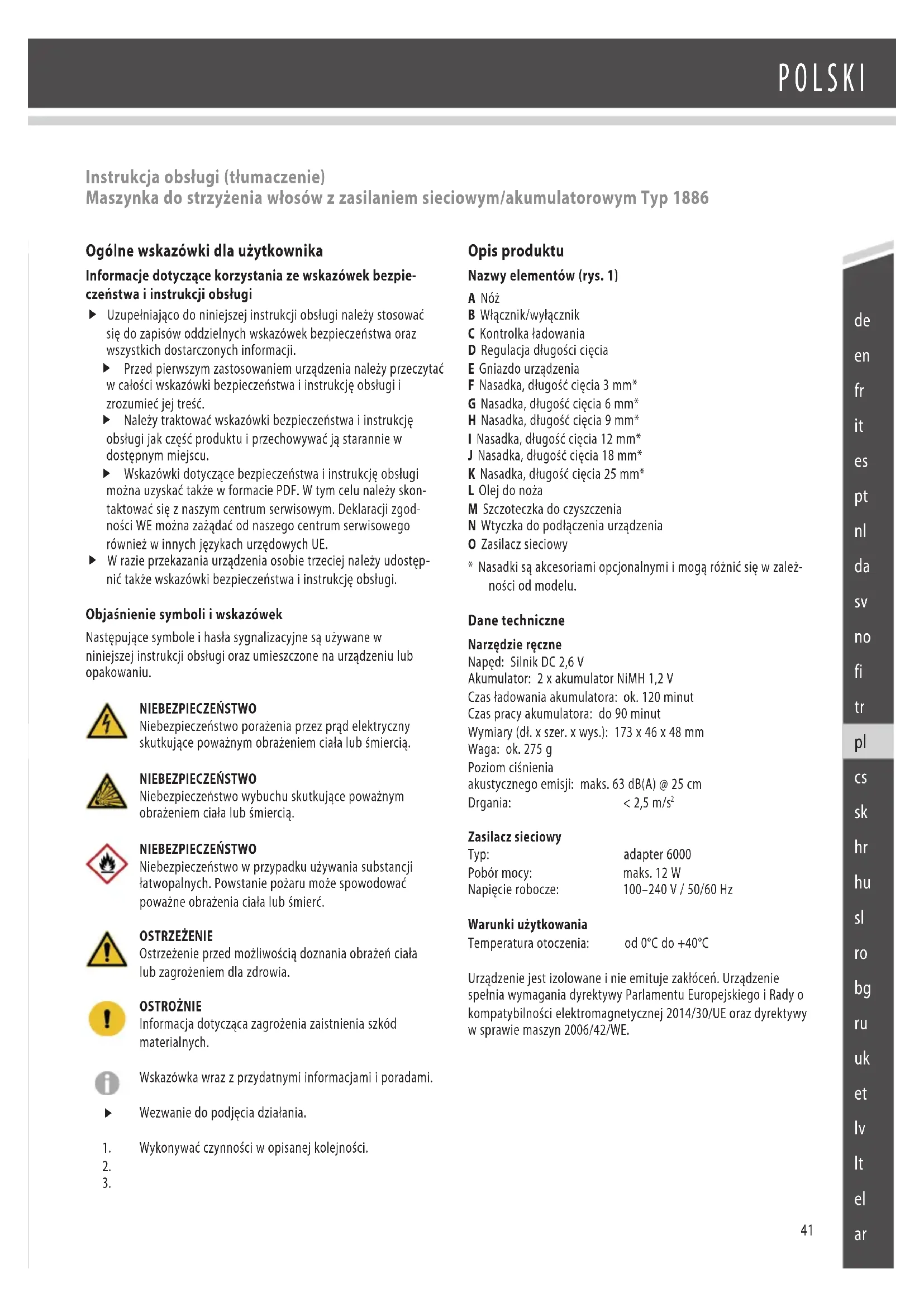 Instrukcja obsługi (tłumaczenie) Maszynka do strzyżenia włosów z zasilaniem sieciowym/akumulatorowym Typ 1886 Ogólne wskazówki dla użytkownika Informacje dotyczące korzystania ze wskazówek bezpie- czeństwa i instrukcji obsługi f Uzupełniająco do niniejszej instrukcji obsługi należy stosować się do zapisów oddzielnych wskazówek bezpieczeństwa oraz wszystkich dostarczonych informacji. f Przed pierwszym zastosowaniem urządzenia należy przeczytać w całości wskazówki bezpieczeństwa i instrukcję obsługi i zrozumieć jej treść. f Należy traktować wskazówki bezpieczeństwa i instrukcję obsługi jak część produktu i przechowywać ją starannie w dostępnym miejscu. f Wskazówki dotyczące bezpieczeństwa i instrukcję obsługi można uzyskać także w formacie PDF. W tym celu należy skon- taktować się z naszym centrum serwisowym. Deklaracji zgod- ności WE można zażądać od naszego centrum serwisowego również w innych językach urzędowych UE. f W razie przekazania urządzenia osobie trzeciej należy udostęp- nić także wskazówki bezpieczeństwa i instrukcję obsługi. Objaśnienie symboli i wskazówek Następujące symbole i hasła sygnalizacyjne są używane w niniejszej instrukcji obsługi oraz umieszczone na urządzeniu lub opakowaniu. NIEBEZPIECZEŃSTWO Niebezpieczeństwo porażenia przez prąd elektryczny skutkujące poważnym obrażeniem ciała lub śmiercią. NIEBEZPIECZEŃSTWO Niebezpieczeństwo wybuchu skutkujące poważnym obrażeniem ciała lub śmiercią. NIEBEZPIECZEŃSTWO Niebezpieczeństwo w przypadku używania substancji łatwopalnych. Powstanie pożaru może spowodować poważne obrażenia ciała lub śmierć. OSTRZEŻENIE Ostrzeżenie przed możliwością doznania obrażeń ciała lub zagrożeniem dla zdrowia. OSTROŻNIE Informacja dotycząca zagrożenia zaistnienia szkód materialnych. Wskazówka wraz z przydatnymi informacjami i poradami. Wezwanie do podjęcia działania. Wykonywać czynności w opisanej kolejności.