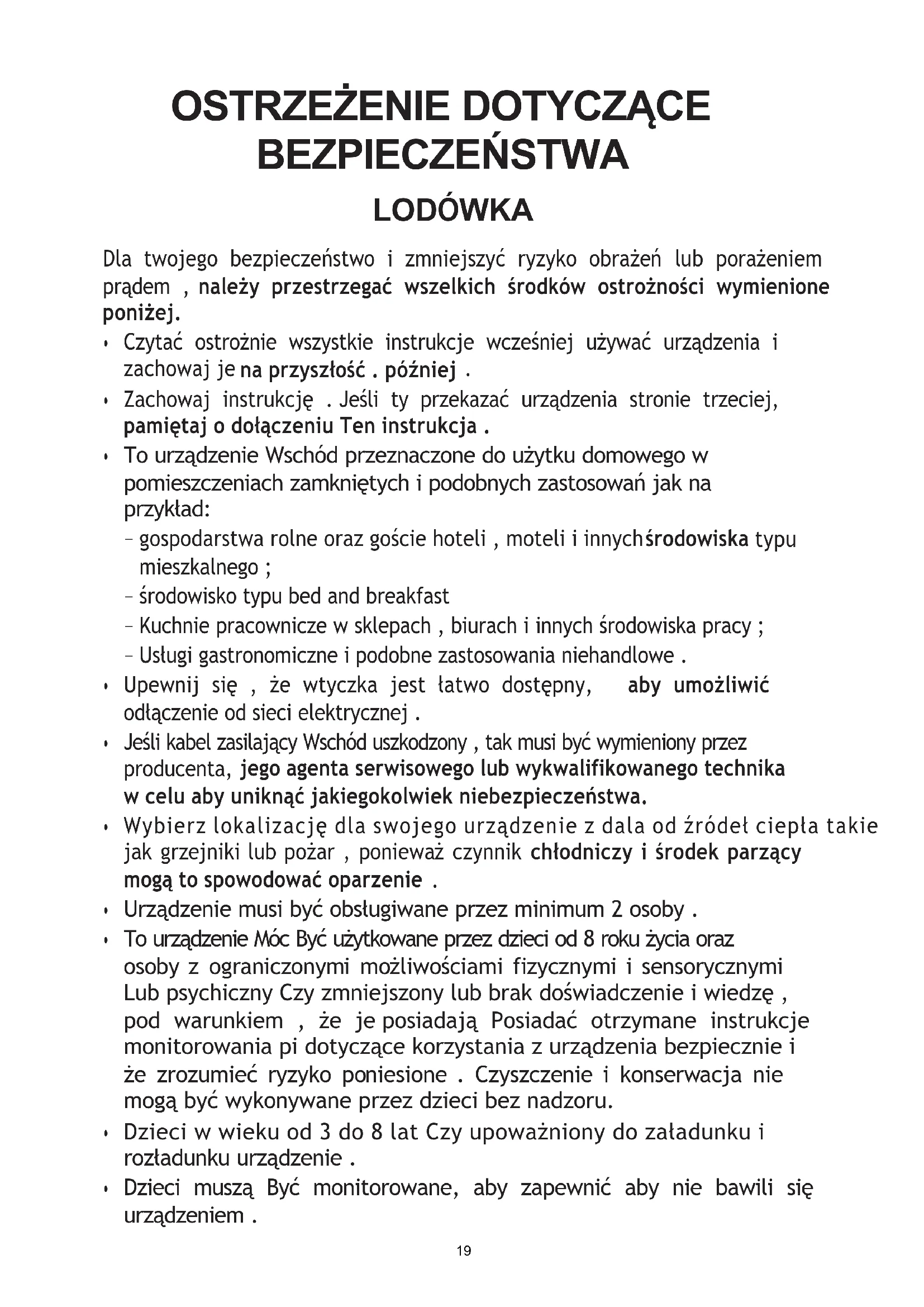 BEZPIECZEŃSTWA LODÓWKA Dla twojego bezpieczeństwo i zmniejszyć ryzyko obrażeń lub porażeniem prądem , należy przestrzegać wszelkich środków ostrożności wymienione poniżej.