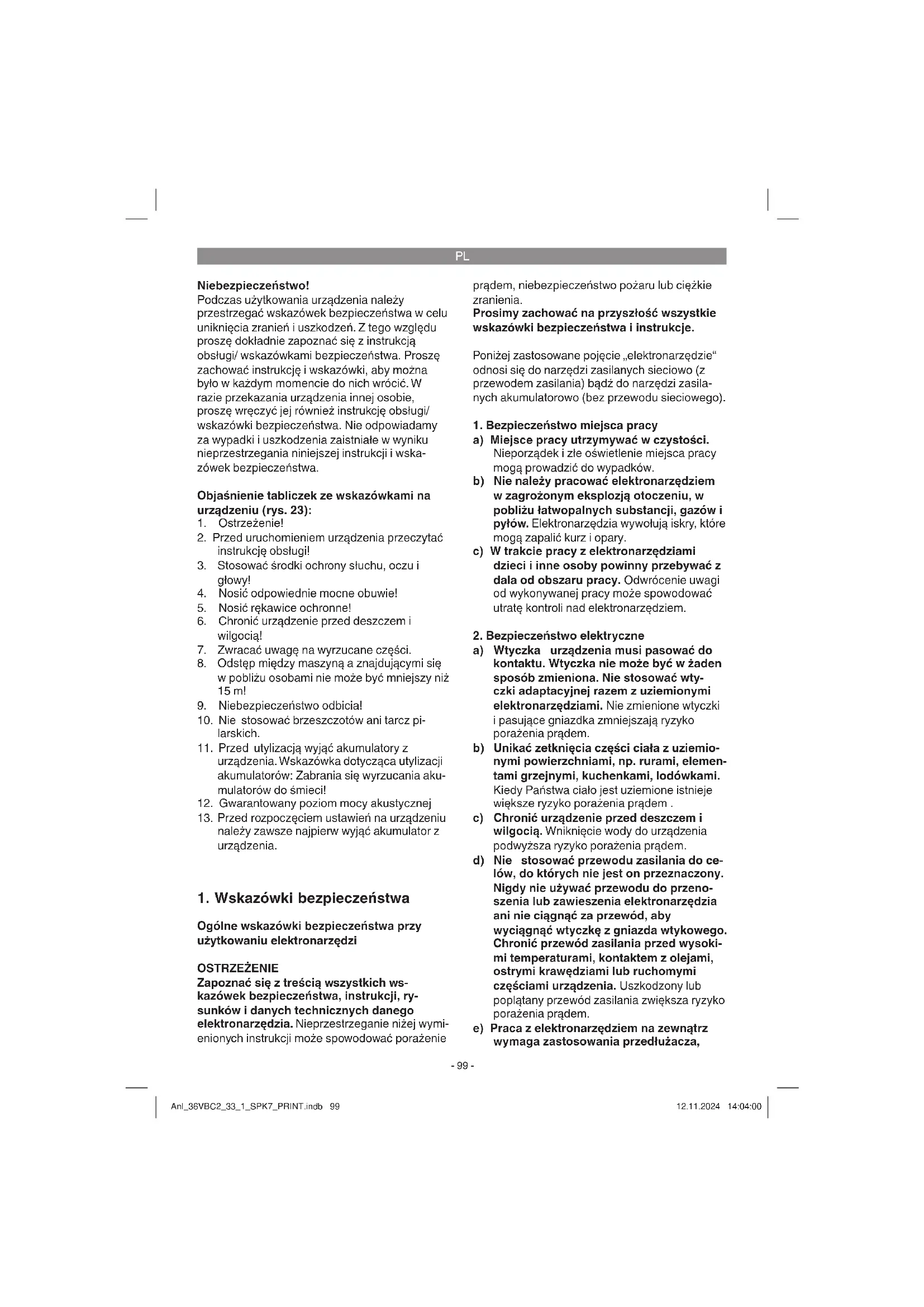 elektronarzędzia a) Nie przeciążać elektronarzędzia. Do pracy używać odpowiednich do tego celu elektronarzędzi. Odpowiednie elektronarzędzie stosowane we wskazanym zakresie wydajności zapewnia lepszą i bezpieczniejszą pracę. b) Nie używać elektronarzędzia, jeśli ma ono uszkodzony włącznik. Urządzenie, którego nie można włączyć ani wyłączyć jest niebez- pieczne i musi zostać naprawione. c) Przed przystąpieniem do dokonywania ustawień urządzenia, wymianą części osprzętu lub odłożeniem elektronarzędzia należy wyciągnąć wtyczkę z gniazdka i/ lub wyjąć akumulator. Te środki ostrożności zapobiegają nieoczekiwanemu włączeniu urządzenia. d) Nieużywane elektronarzędzia przechowywać w miejscu niedostępnym dla dzieci. Osoby, które nie znają właściwej obsługi urządzenia lub nie przeczytały tej instrukcji, nie powin- ny używać tego elektronarzędzia. Elektronarzędzia są niebezpieczne, jeśli są używane przez niedoświadczone osoby. e) Starannie dbać o elektronarzędzia i narzędzia robocze. Należy kontrolować, czy ruchome części funkcjonują bez zarzutu, nie zakleszczają się, czy nie są złamane lub uszkodzone, co mogłoby wpłynąć na funkcjonowa- nie elektronarzędzia. Przed użyciem elektronarzędzia należy naprawić usz- kodzone części. Wiele wypadków spow- odowanych jest niewłaściwą konserwacją urządzenia. f) Narzędzia tnące powinny być zawsze na- ostrzone i czyste. Właściwie pielęgnowane urządzenia tnące z naostrzonym ostrzem rzadziej się zakleszczają i są łatwiejsze do prowadzenia. Anl_36VBC2_33_1_SPK7_PRINT.indb 100Anl_36VBC2_33_1_SPK7_PRINT.indb 100 12.11.2024 14:04:0012.11.2024 14:04:00PL