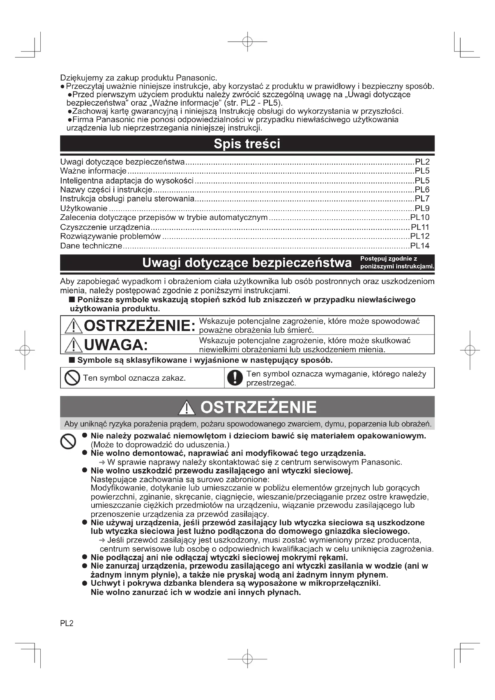 Consumo de energía Durante el batido 450 W Durante el calentamiento 800 W - 950 W Durante el modo apagado 0,4 W Consumo de energía apagado 0,4 W Consumo de energía en modo de espera n/a Consumo de energía en los modos de espera de red n/a Tiempo predeterminado para cambiar al modo apagado 5 minutos Control de velocidad Hay 10 opciones disponibles Tiempo de trabajo (batido) MÁXIMO (Líquido frío): 1,2 L / MÁXIMO (Líquido caliente): 1 L Capacidad máxima Funcionamiento continuo (En el modo manual, el aparato funciona de forma continua durante 6 minutos. Una vez transcurrido 6 minutos, se detiene de forma automática y vuelve a mostrarse la pantalla inicial.) Dimensiones (An × P × Al) (aprox.) 206 × 247 × 399 mm Peso (aprox.) 5,0 kg Longitud del cable de alimentación (aprox.) 1,0 m Ruido acústico emitido [dB(A) ref 1 pW] 74,47 Eliminación de Aparatos Viejos Solamente para la Unión Europea y países con sistemas de reciclado. Este símbolo en los productos, su embalaje o en los documentos que los acompañen significa que los productos eléctricos y electrónicos usados no deben mezclarse con los residuos domésticos. Para el adecuado tratamiento, recuperación y reciclaje de los productos viejos llévelos a los puntos de recogida de acuerdo con su legislación nacional. Si los elimina correctamente ayudará a preservar valiosos recursos y evitará potenciales efectos negativos sobre la salud de las personas y sobre el medio ambiente. Para más información sobre la recogida u reciclaje, por favor contacte con su ayuntamiento. Puede haber sanciones por una incorrecta eliminación de este residuo, de acuerdo con la legislación nacional.MemoPL2 Dziękujemy za zakup produktu Panasonic. ●Przeczytaj uważnie niniejsze instrukcje, aby korzystać z produktu w prawidłowy i bezpieczny sposób. ●Przed pierwszym użyciem produktu należy zwrócić szczególną uwagę na „Uwagi dotyczące bezpieczeństwa” oraz „Ważne informacje” (str. PL2 - PL5). ●Zachowaj kartę gwarancyjną i niniejszą Instrukcję obsługi do wykorzystania w przyszłości. ●Firma Panasonic nie ponosi odpowiedzialności w przypadku niewłaściwego użytkowania urządzenia lub nieprzestrzegania niniejszej instrukcji. Spis treści Uwagi dotyczące bezpieczeństwa ................................................................................................... PL2 Ważne informacje ............................................................................................................................PL5 Inteligentna adaptacja do wysokości ...............................................................................................PL5 Nazwy części i instrukcje .................................................................................................................PL6 Instrukcja obsługi panelu sterowania...............................................................................................PL7 Użytkowanie ....................................................................................................................................PL9 Zalecenia dotyczące przepisów w trybie automatycznym .............................................................PL10 Czyszczenie urządzenia ................................................................................................................PL11 Rozwiązywanie problemów ...........................................................................................................PL12 Dane techniczne ............................................................................................................................PL14 Uwagi dotyczące bezpieczeństwa Aby zapobiegać wypadkom i obrażeniom ciała użytkownika lub osób postronnych oraz uszkodzeniom mienia, należy postępować zgodnie z poniższymi instrukcjami. Poniższe symbole wskazują stopień szkód lub zniszczeń w przypadku niewłaściwego użytkowania produktu. OSTRZEŻENIE: Wskazuje potencjalne zagrożenie, które może spowodować poważne obrażenia lub śmierć. UWAGA: Wskazuje potencjalne zagrożenie, które może skutkować niewielkimi obrażeniami lub uszkodzeniem mienia. Symbole są sklasyfikowane i wyjaśnione w następujący sposób. Ten symbol oznacza zakaz.