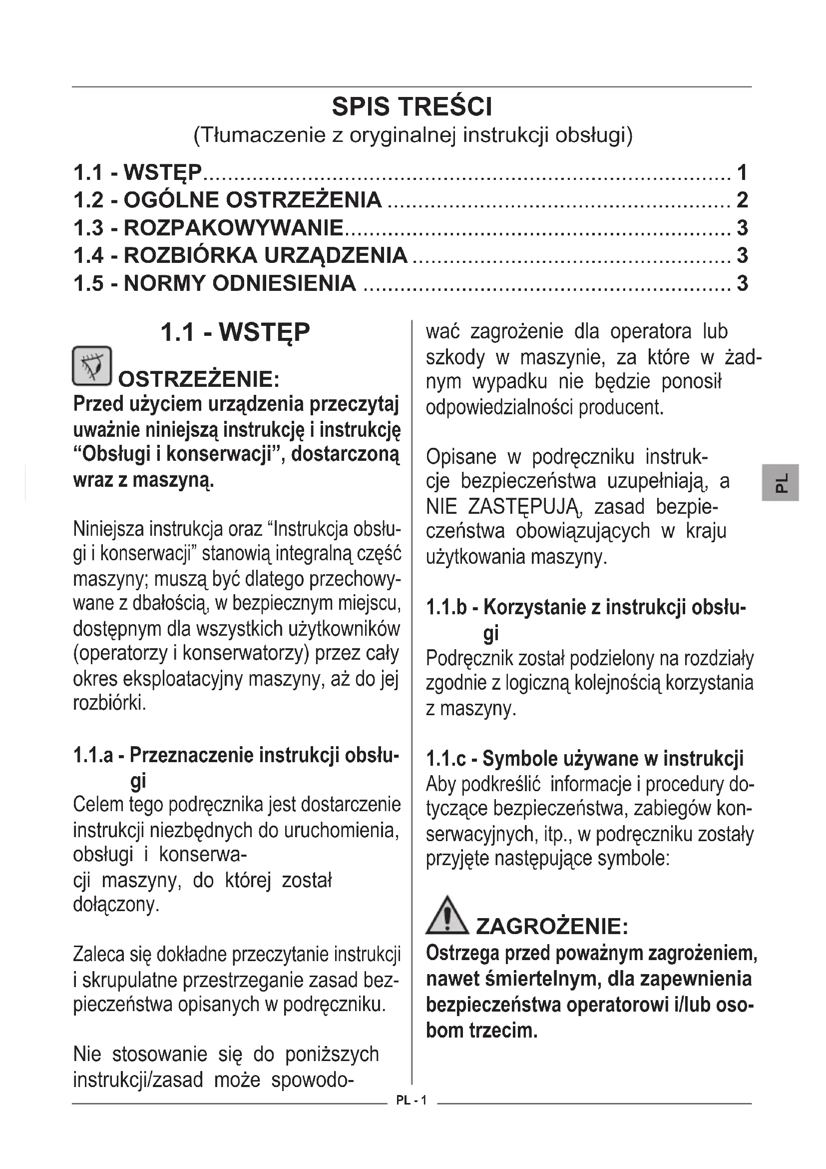 OSTRZEŻENIE: Przed użyciem urządzenia przeczytaj uważnie niniejszą instrukcję i instrukcję “Obsługi i konserwacji”, dostarczoną wraz z maszyną. Niniejsza instrukcja oraz “Instrukcja obsłu- gi i konserwacji” stanowią integralną część maszyny; muszą być dlatego przechowy- wane z dbałością, w bezpiecznym miejscu, dostępnym dla wszystkich użytkowników (operatorzy i konserwatorzy) przez cały okres eksploatacyjny maszyny, aż do jej rozbiórki.