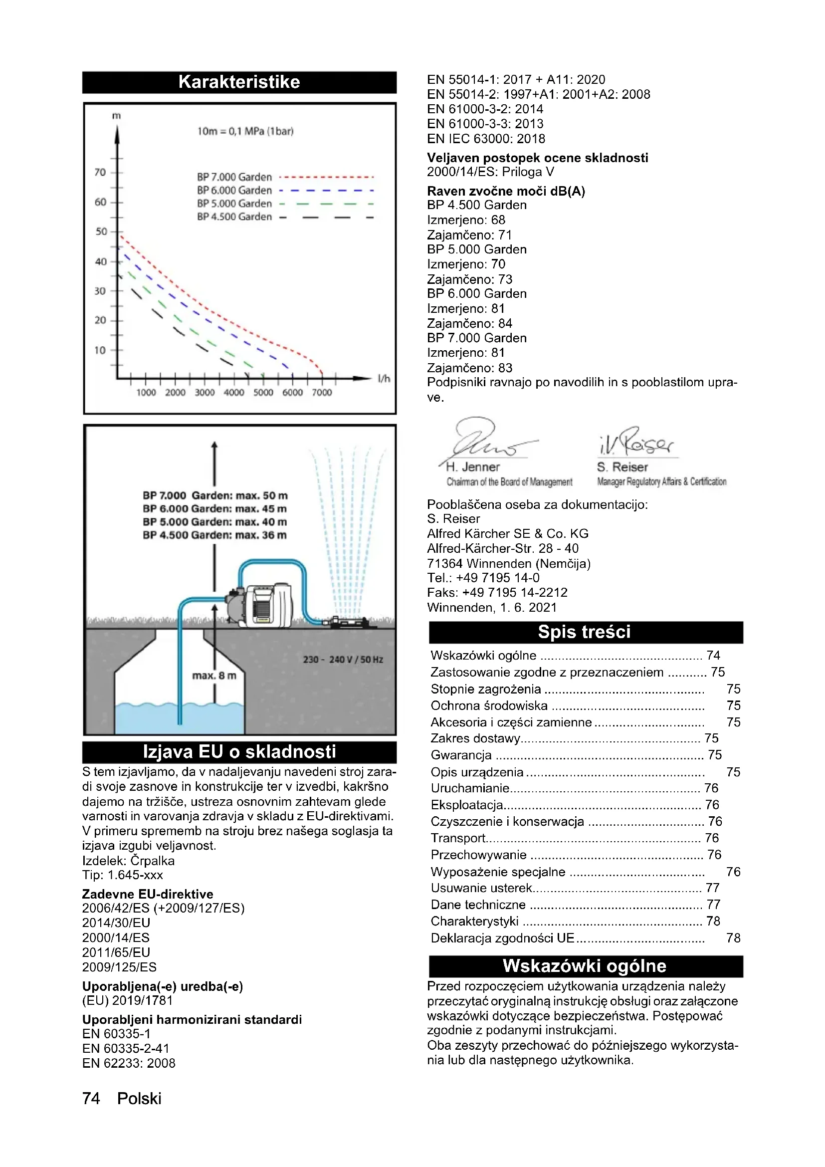 • dB(A)71738483 Mere in mase Teža (brez pribora) kg 6,4 7,0 9,7 10,074 Polski Karakteristike Izjava EU o skladnosti S tem izjavljamo, da v nadaljevanju navedeni stroj zara- di svoje zasnove in konstrukcije ter v izvedbi, kakršno dajemo na tržišče, ustreza osnovnim zahtevam glede varnosti in varovanja zdravja v skladu z EU-direktivami. V primeru sprememb na stroju brez našega soglasja ta izjava izgubi veljavnost. Izdelek: Črpalka Tip: 1.645-xxx Zadevne EU-direktive 2006/42/ES (+2009/127/ES) 2014/30/EU 2000/14/ES 2011/65/EU 2009/125/ES Uporabljena(-e) uredba(-e) (EU) 2019/1781 Uporabljeni harmonizirani standardi EN 60335-1 EN 60335-2-41 EN 62233: 2008 EN 55014-1: 2017 + A11: 2020 EN 55014-2: 1997+A1: 2001+A2: 2008 EN 61000-3-2: 2014 EN 61000-3-3: 2013 EN IEC 63000: 2018 Veljaven postopek ocene skladnosti 2000/14/ES: Priloga V Raven zvočne moči dB(A) BP 4.500 Garden Izmerjeno: 68 Zajamčeno: 71 BP 5.000 Garden Izmerjeno: 70 Zajamčeno: 73 BP 6.000 Garden Izmerjeno: 81 Zajamčeno: 84 BP 7.000 Garden Izmerjeno: 81 Zajamčeno: 83 Podpisniki ravnajo po navodilih in s pooblastilom upra- ve. Pooblaščena oseba za dokumentacijo: S. Reiser Alfred Kärcher SE & Co. KG Alfred-Kärcher-Str. 28 - 40 71364 Winnenden (Nemčija) Tel.: +49 7195 14-0 Faks: +49 7195 14-2212 Winnenden, 1. 6. 2021 Spis treści Wskazówki ogólne Przed rozpoczęciem użytkowania urządzenia należy przeczytać oryginalną instrukcję obsługi oraz załączone wskazówki dotyczące bezpieczeństwa. Postępować zgodnie z podanymi instrukcjami. Oba zeszyty przechować do późniejszego wykorzysta- nia lub dla następnego użytkownika. Wskazówki ogólne p. 74